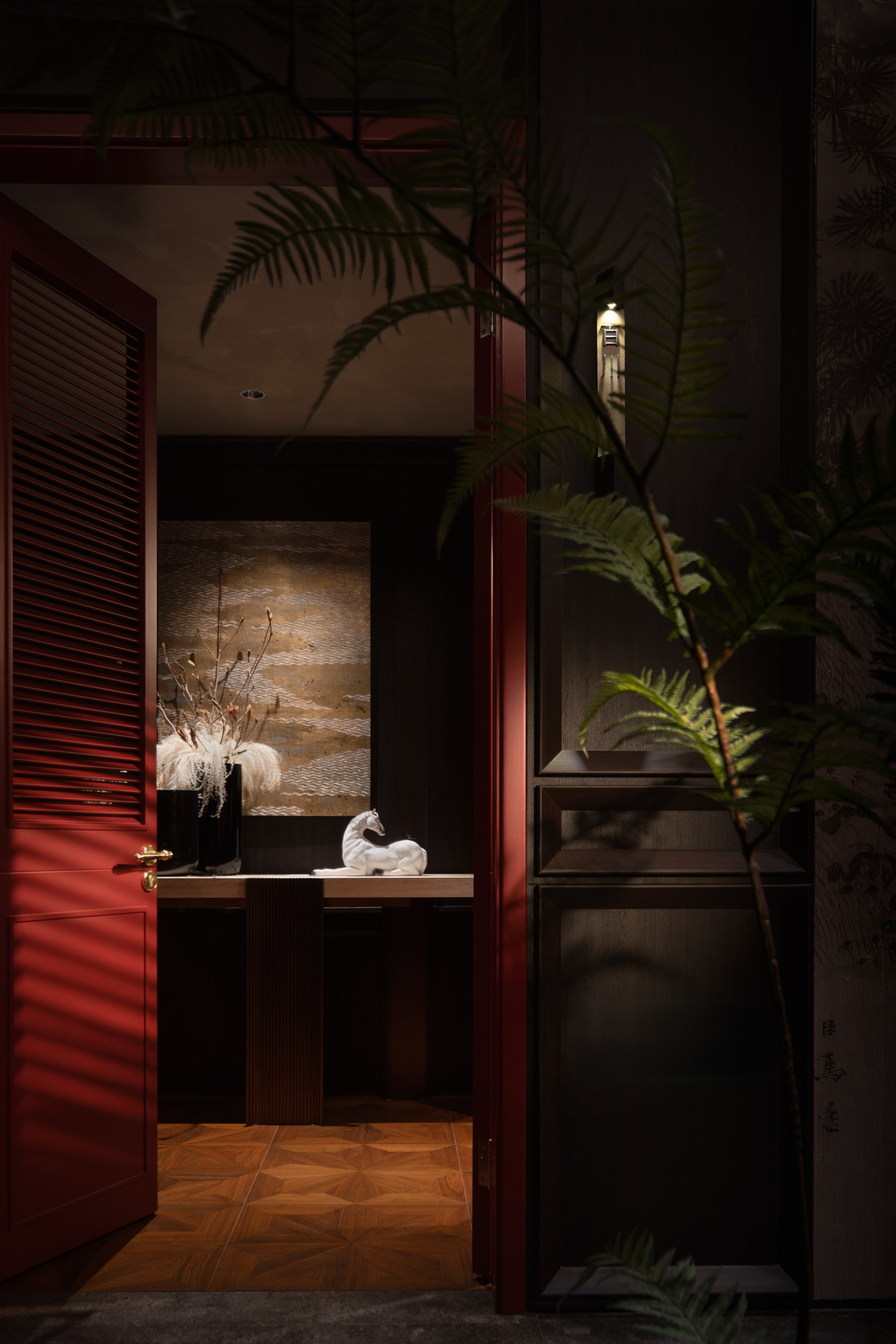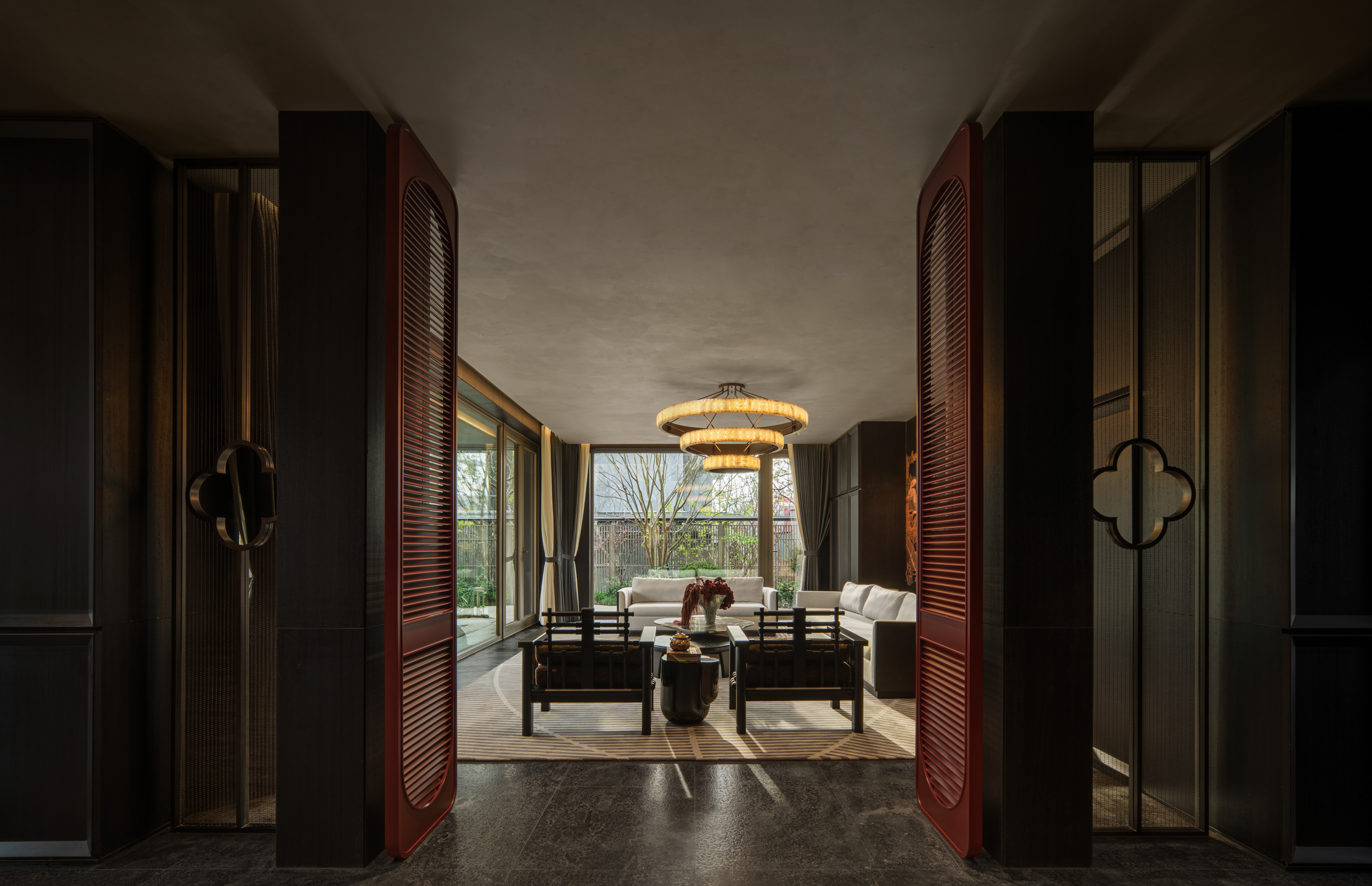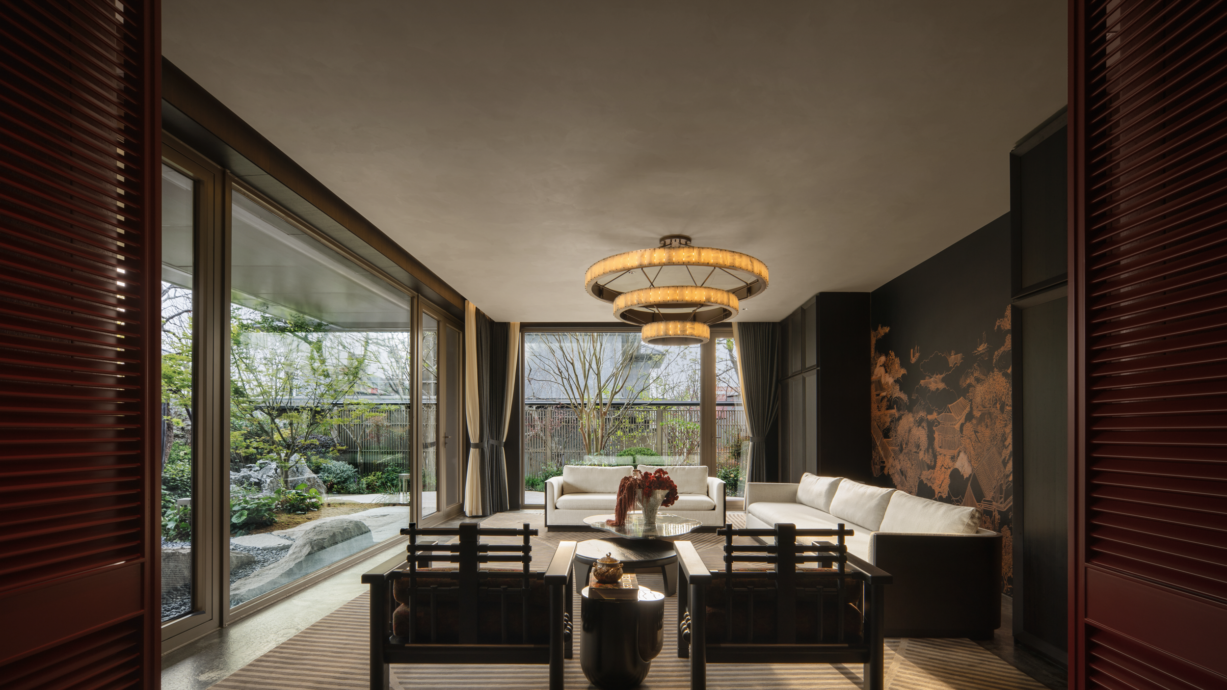 项目定位:本项目根植于舟山独特的海洋文脉与岛屿气质,旨在打造一座 “现代东方意境栖居” 。硬装设计以沉稳的深色调为基底,通过大量温润木质(格栅天花、中式隔断、墙面线条)与冷峻石材(地面、茶几)的质感对话,构建空间的骨骼与气韵。设计巧妙融合现代简约的线条比例与传统中式的对称布局,并借由通顶落地窗将室外山海绿意引入室内,形成内外景致的诗意互动。整体摒弃繁复装饰,于低调的材质与精准的细节中,为城市菁英营造一处既能安放身心、又可承载文化品味的静谧港湾。