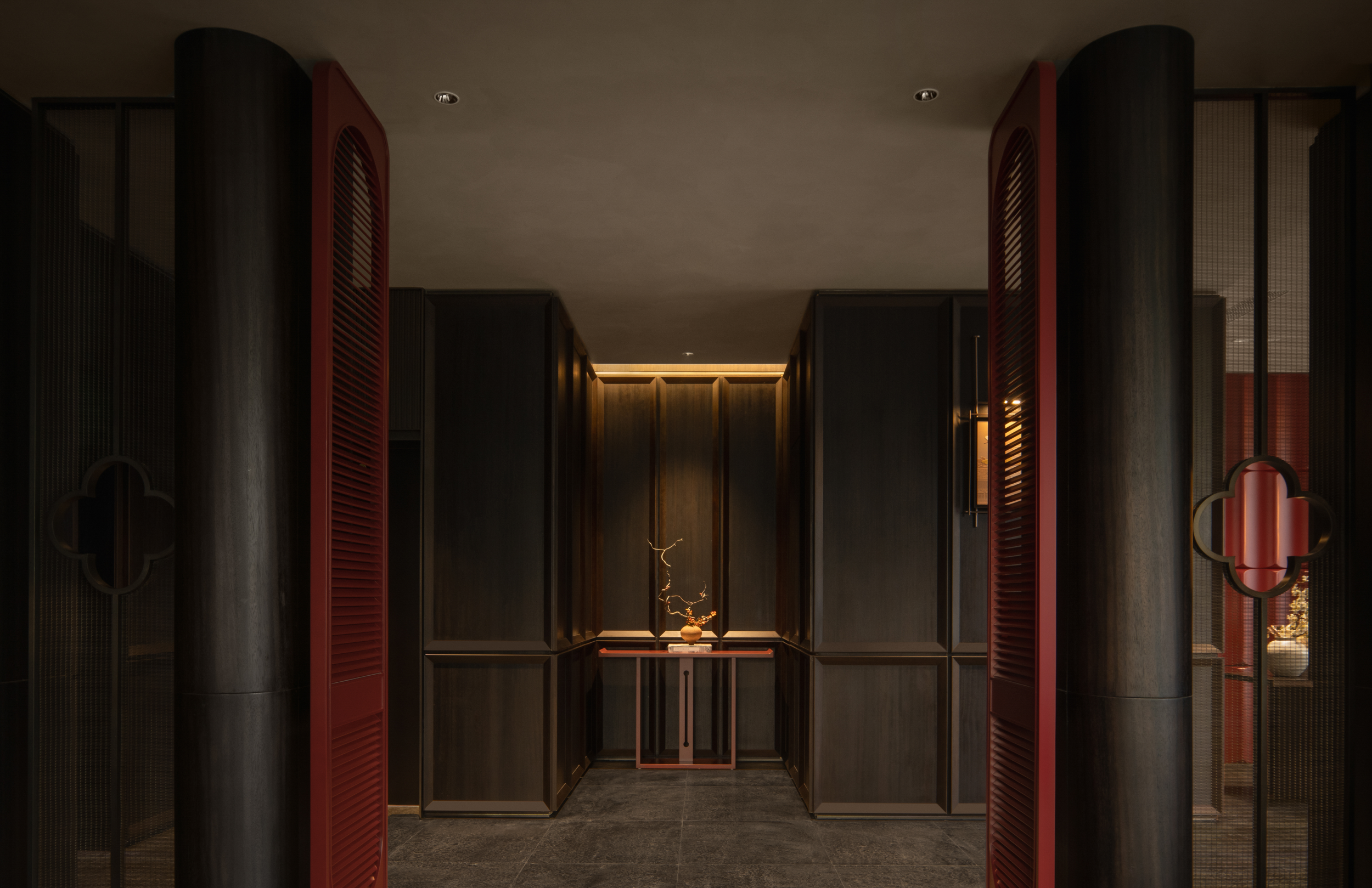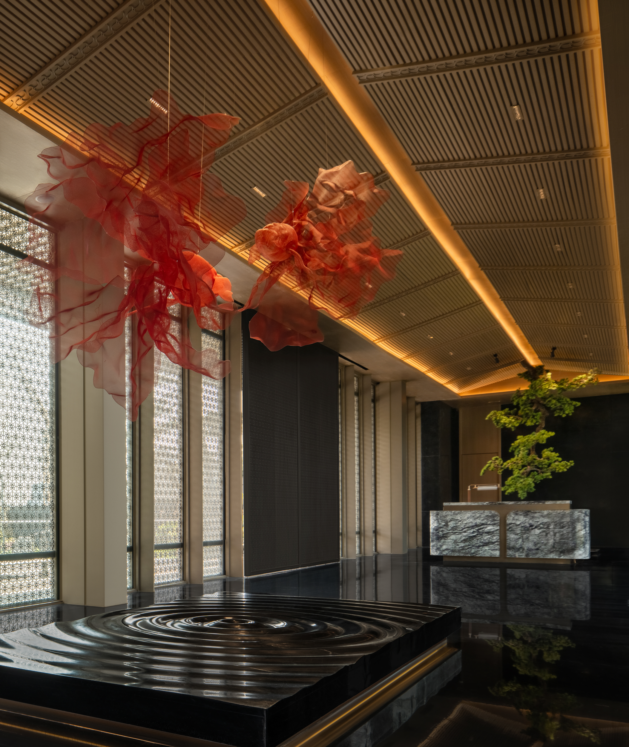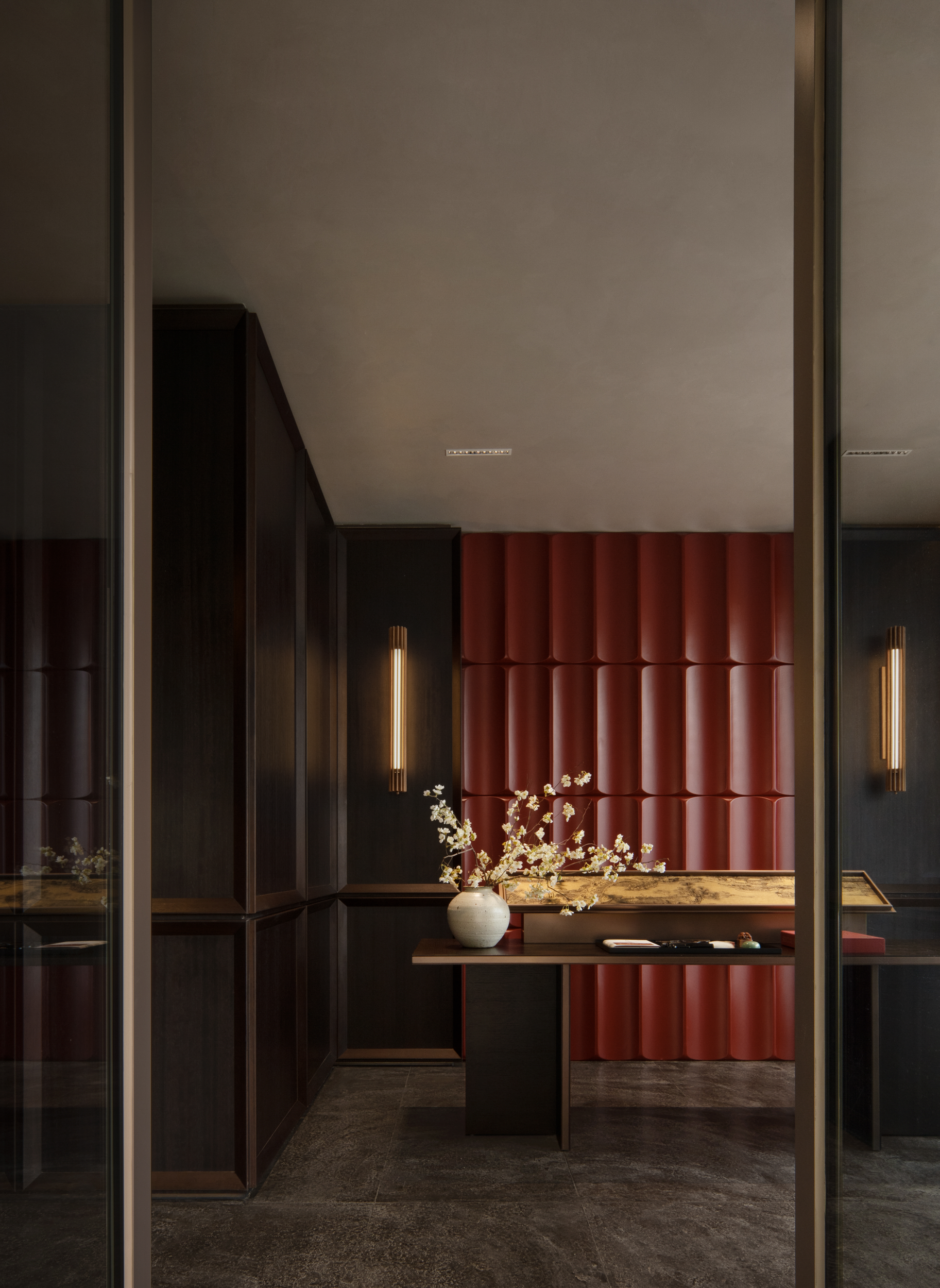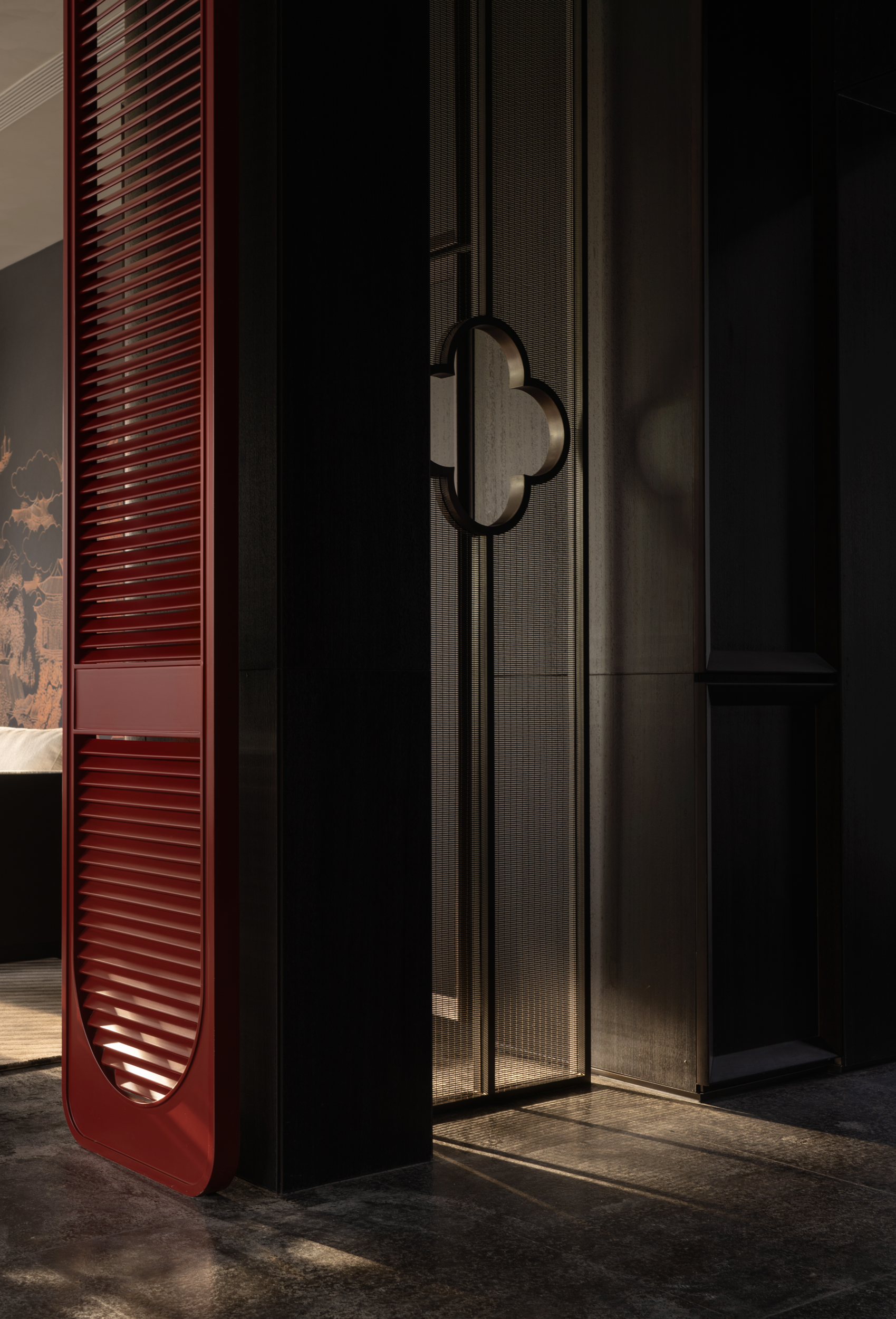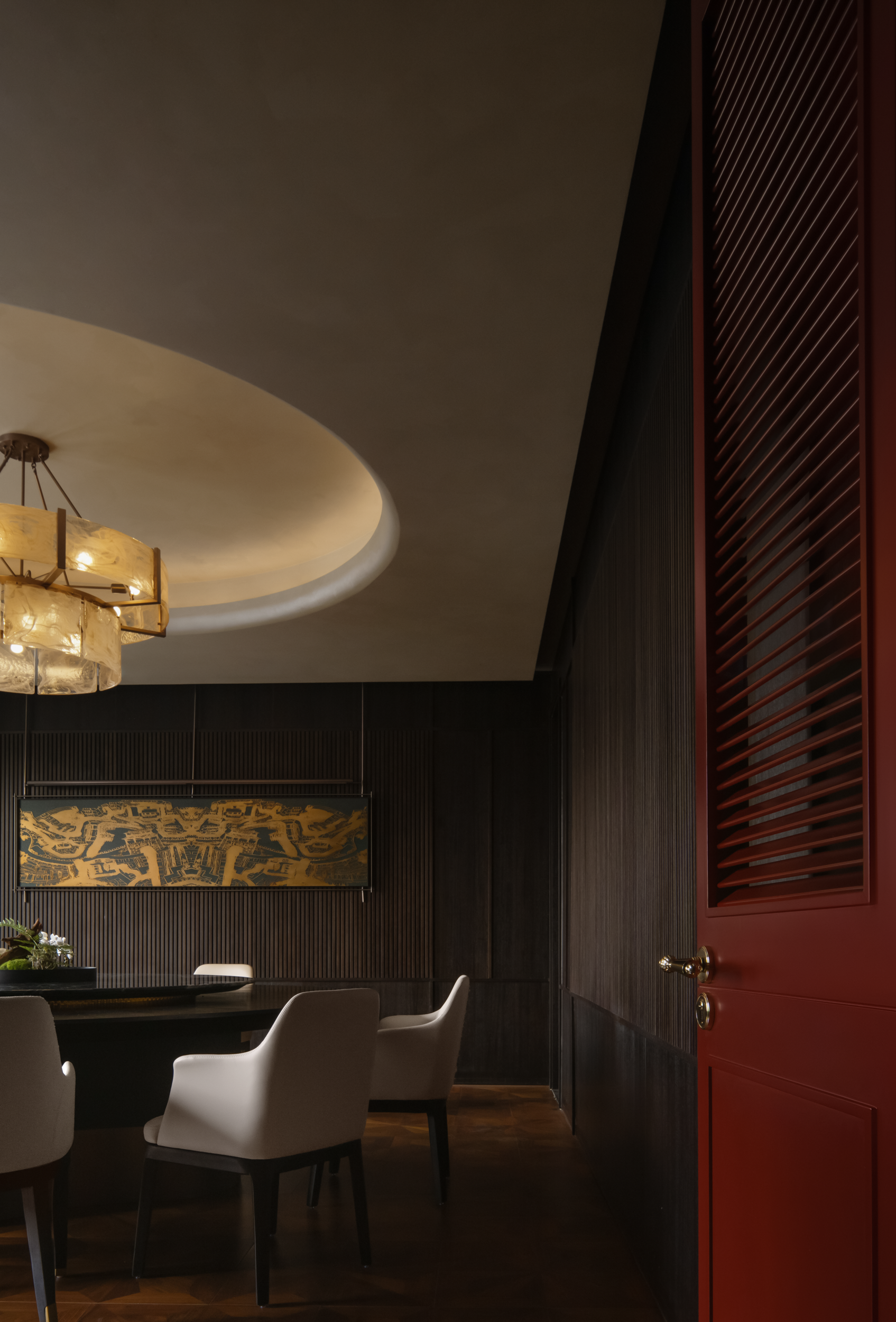 空间意境:本案硬装创新在于将舟山的海洋文脉转化为空间语言。天花以木质格栅模拟波光,墙面竖向线条勾勒出桅杆意象,深色地面如退潮后的礁石。大面积落地窗将山海光影引入,与温润木作、镂空花格共筑东方意境。以现代硬装骨架,承载“潮平海阔、心归禅静”的在地美学。