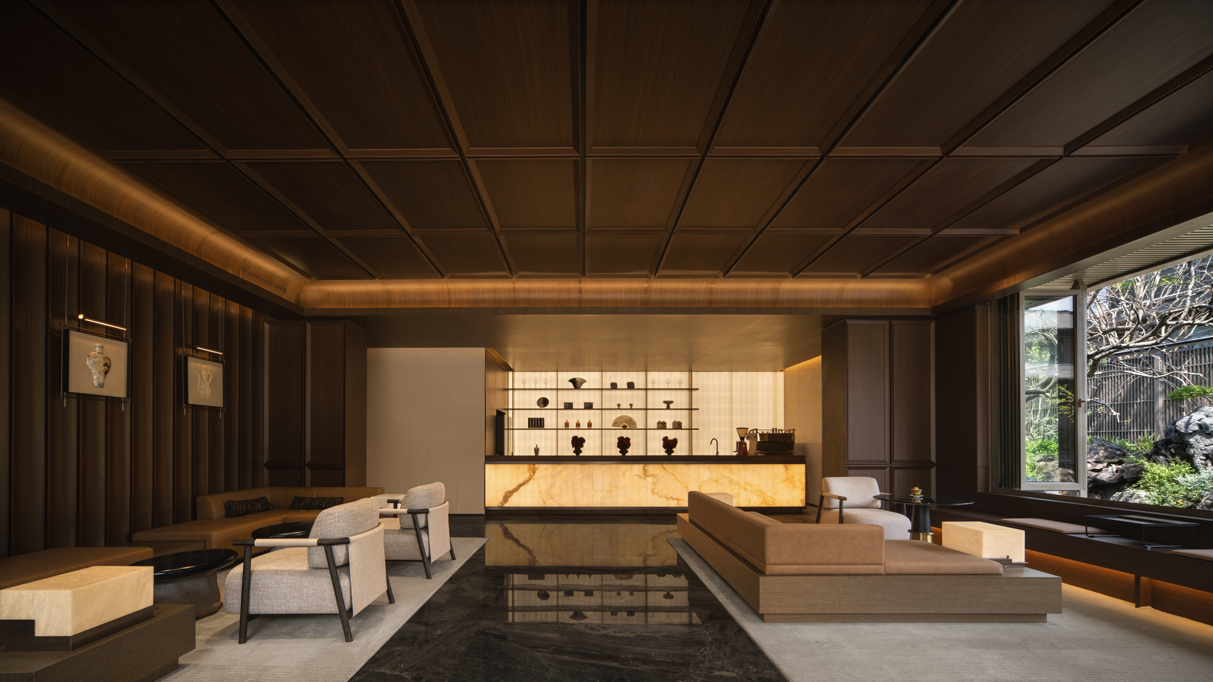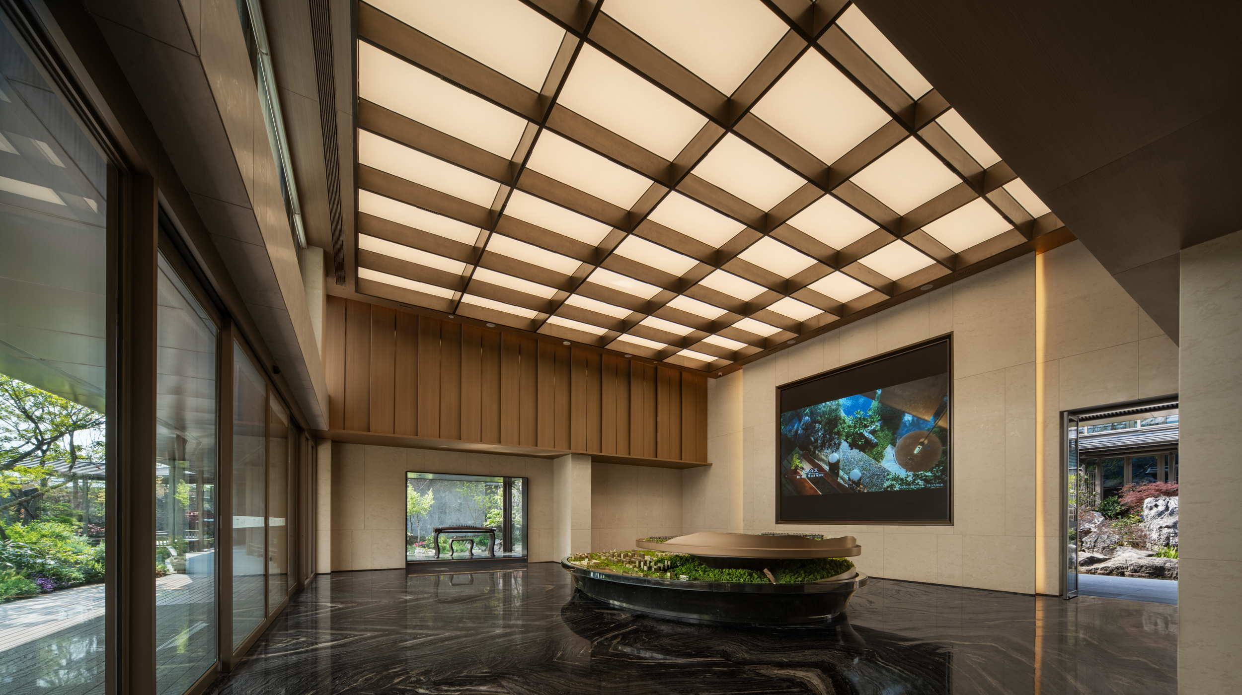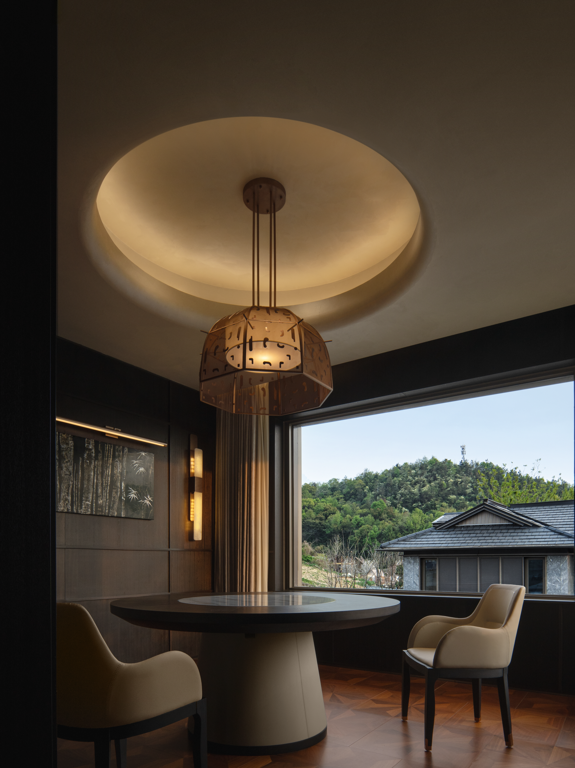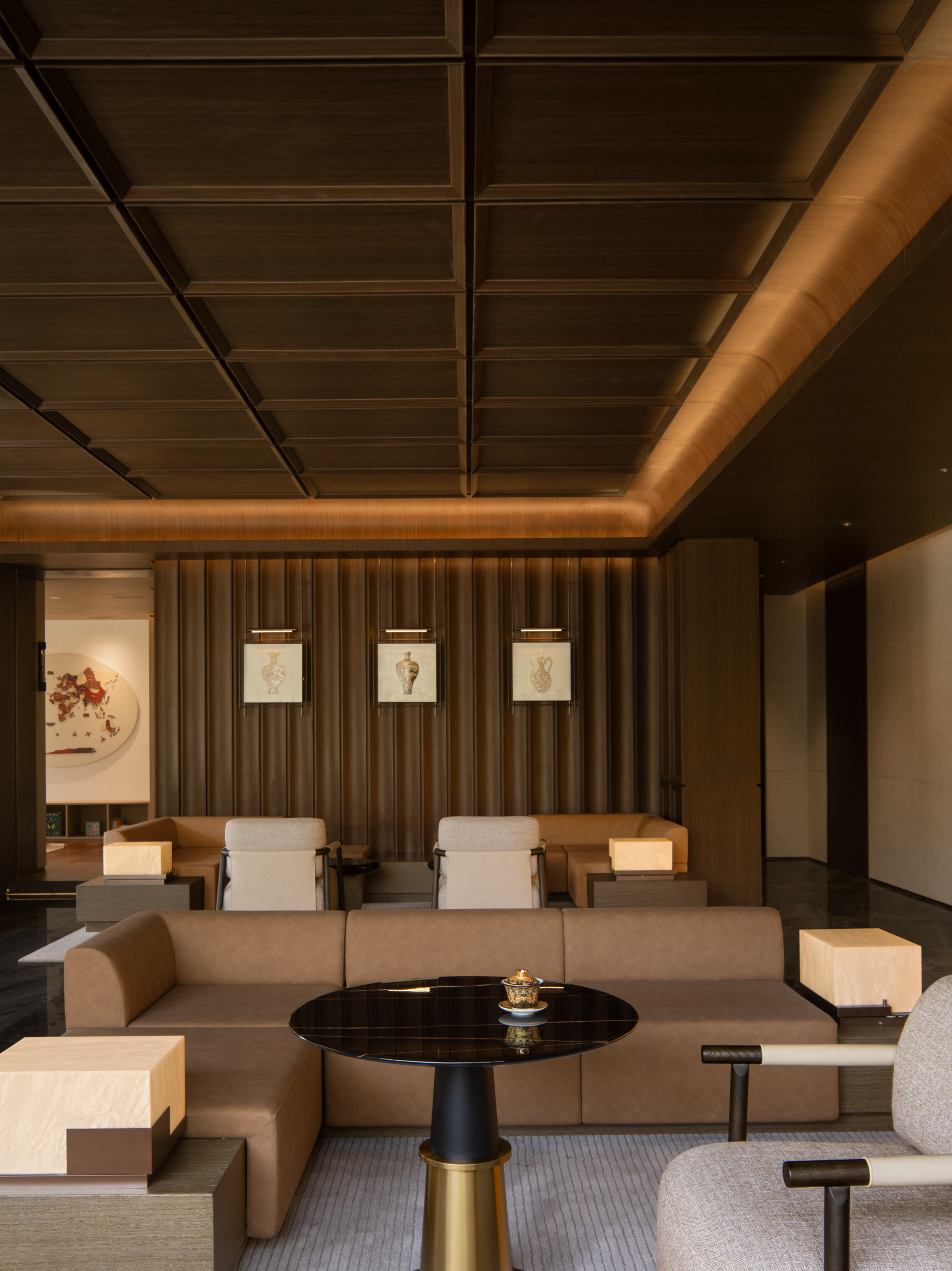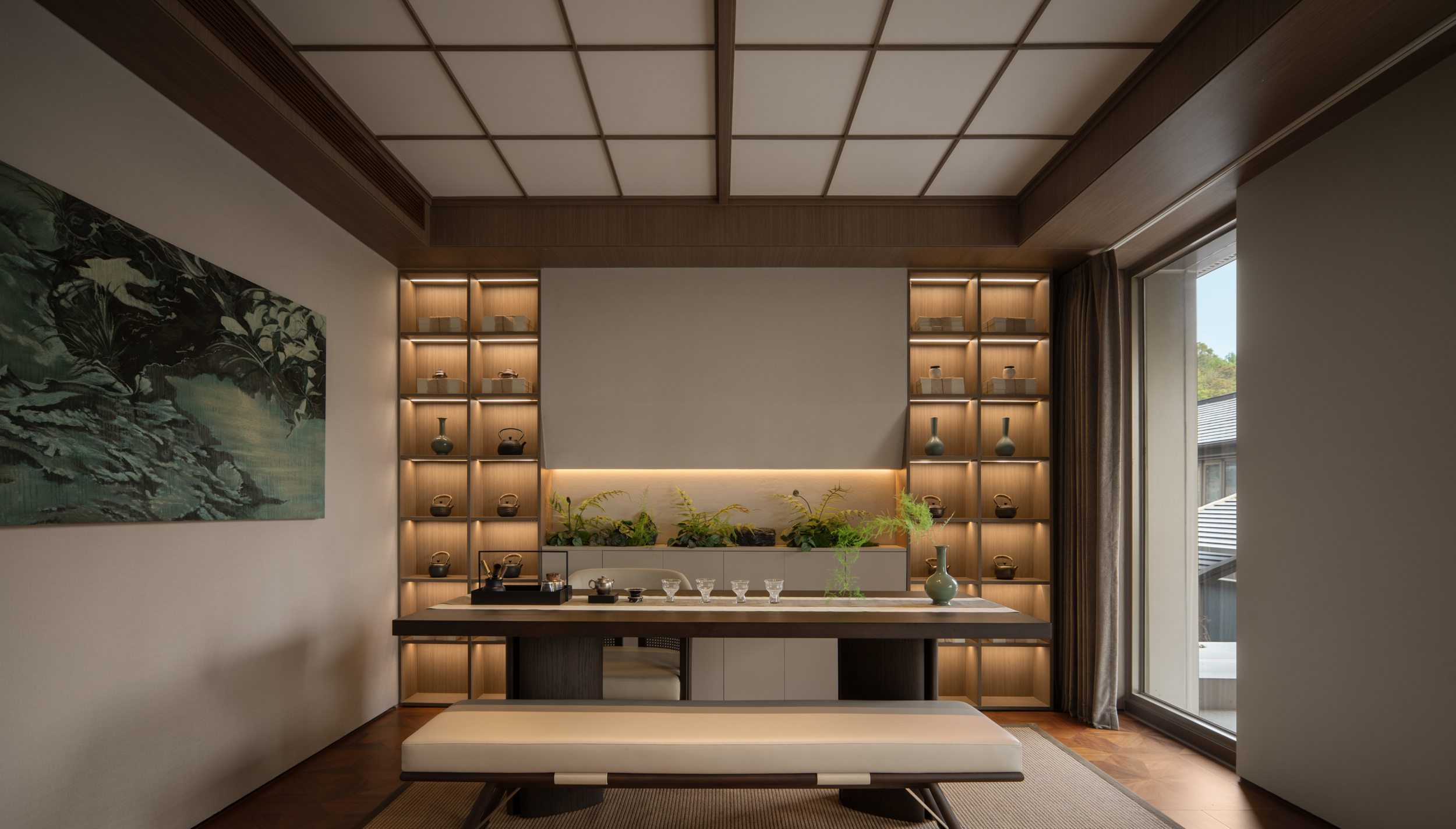 空间布局:基于舟山独特的山海景观,本硬装布局的核心创新在于 “无界融景”与“场景流动性”。通过连续的通顶落地窗,将室外海天风光作为动态背景引入室内。同时,打破传统隔断,以装饰性墙体、木质天花造型与嵌入式灯带自然划分功能区域,形成围绕中央核心交流区的洄游动线。空间既有开阔的整体视野,又能通过光影和材质的引导,在会客、休憩、品茶等多场景间自由切换,实现人与空间、室内与自然的深度交融。