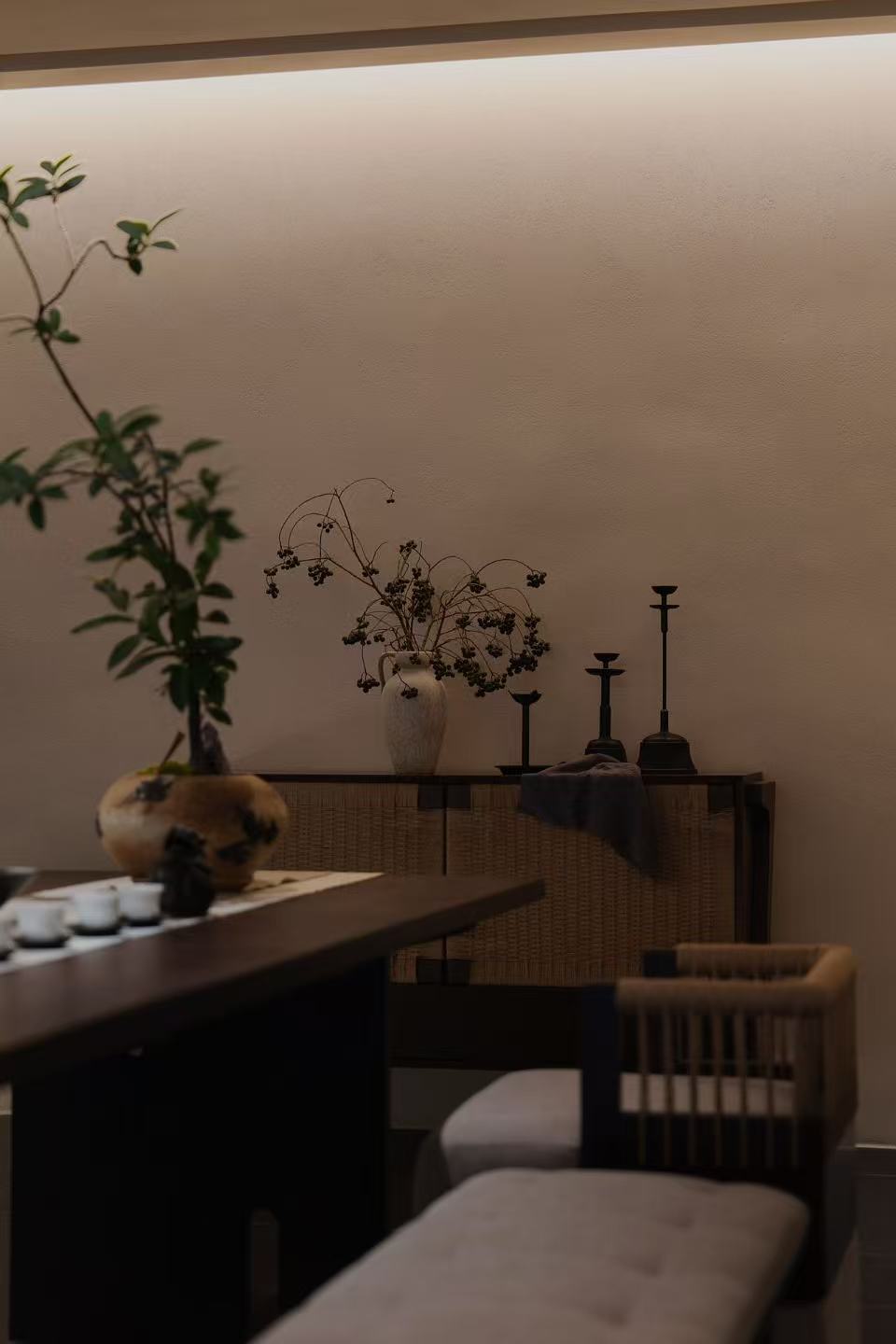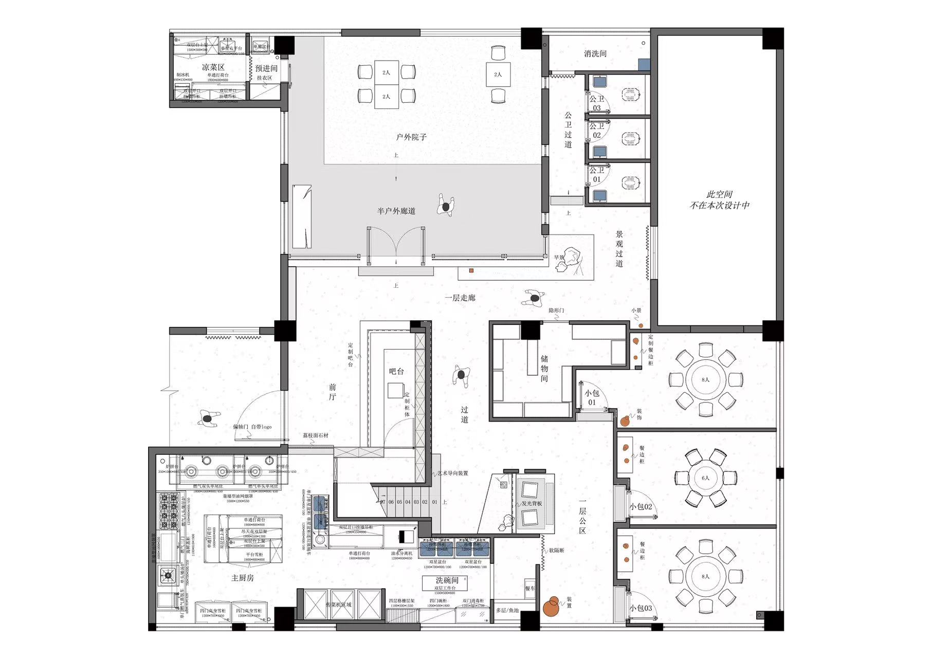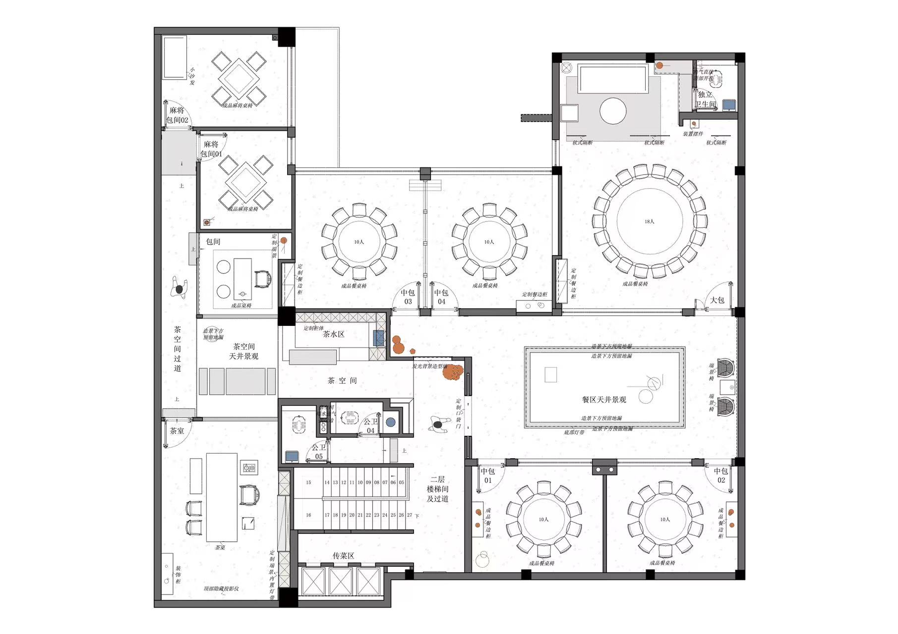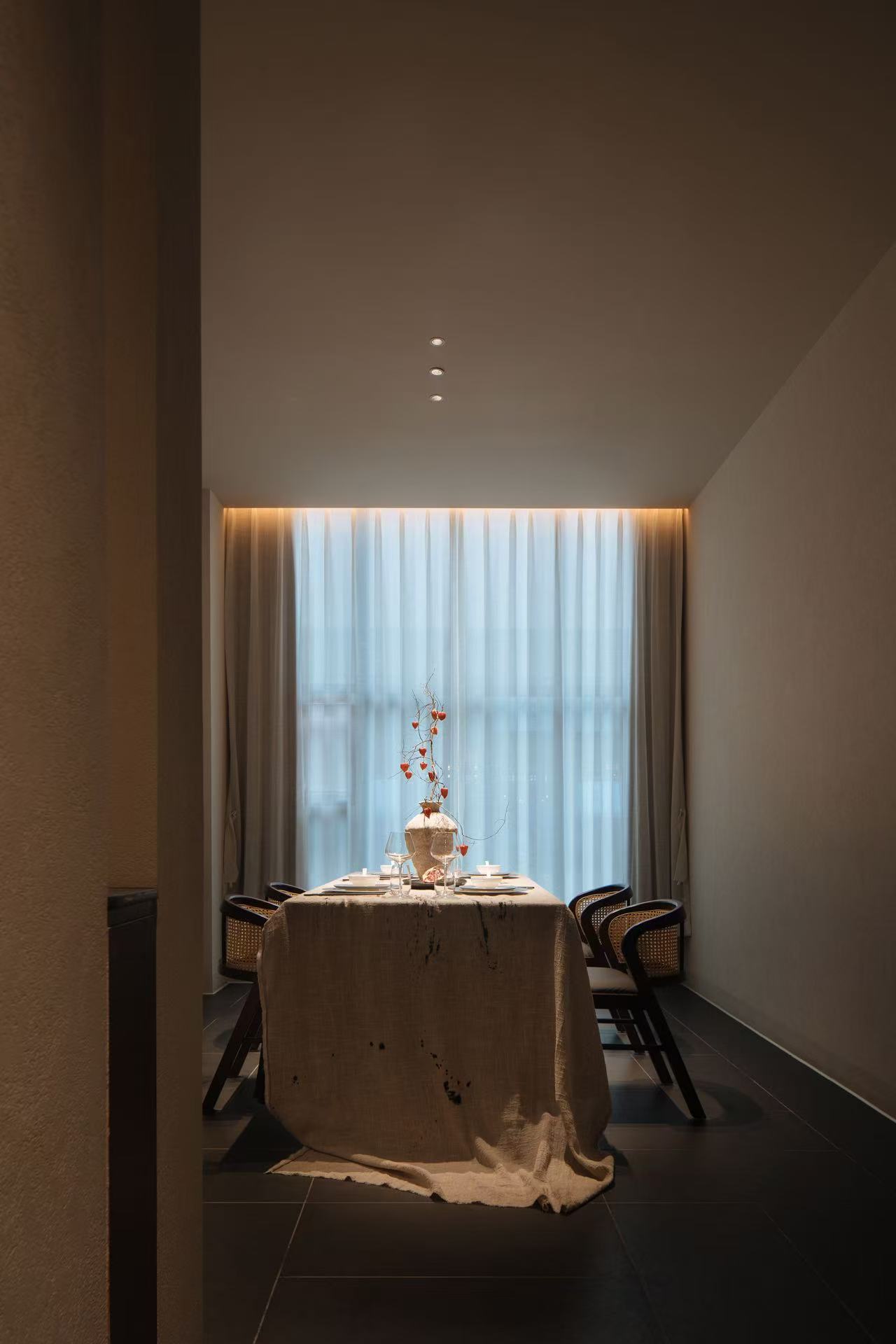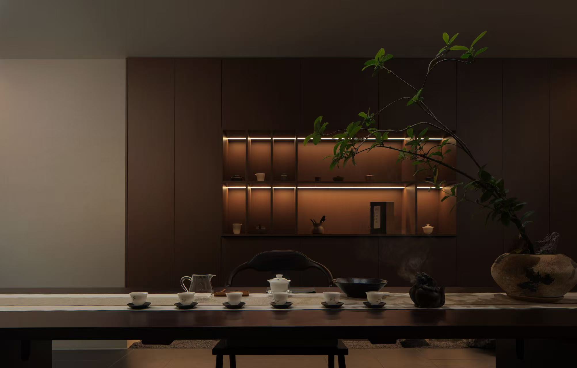 空间布局:采用“院落式递进+围合式私密”布局,效仿传统中式院落的递进动线营造空间节奏感,私宴区全封闭保障私密,茶席区半开放平衡通透与静谧。