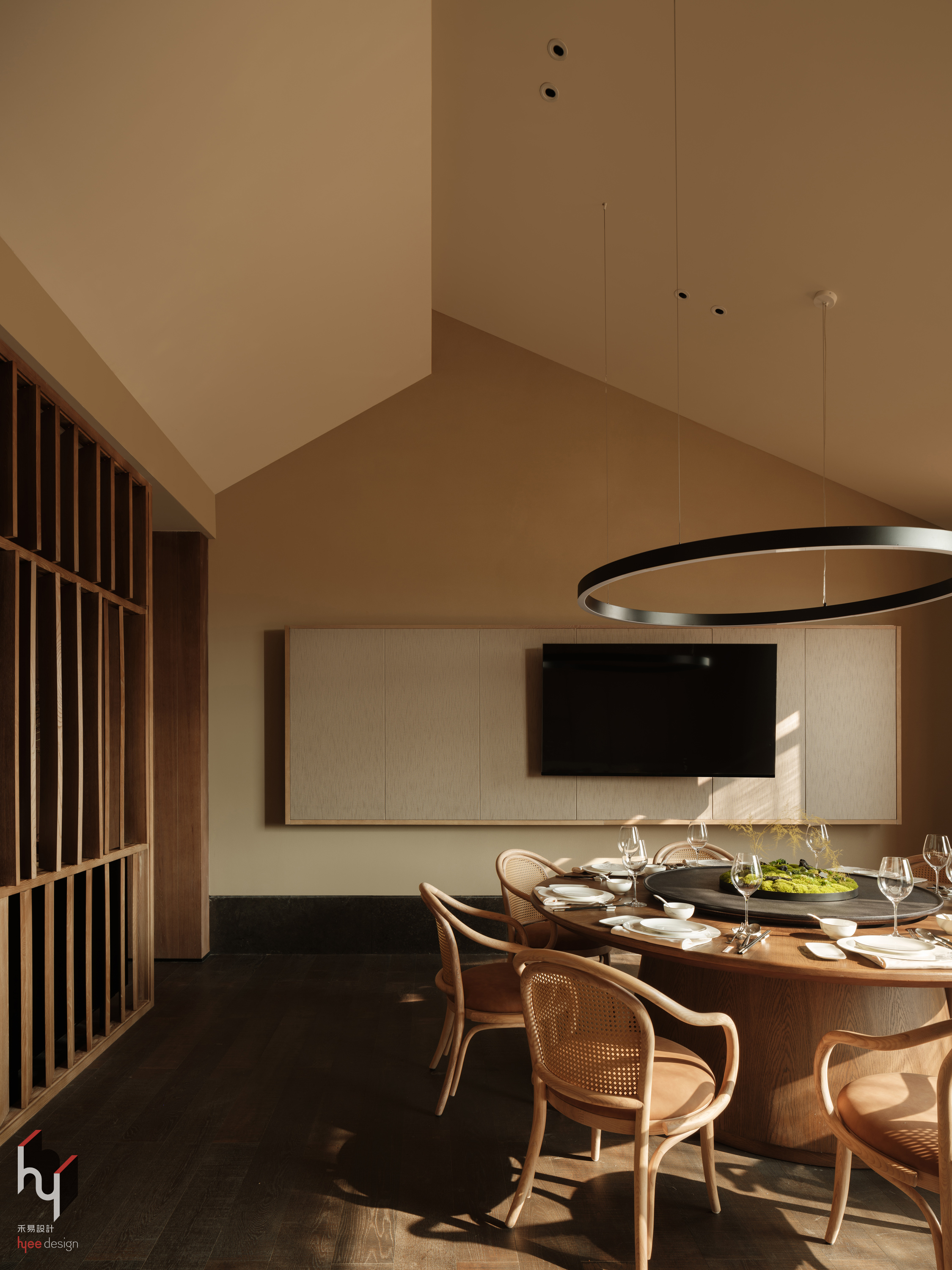 包房将电视嵌入墙面,融入整体简洁风格,兼顾用餐娱乐需求。斜顶设计打破常规,增强空间立体感。深色木地板、藤编椅、墙面软包与金属吊灯相映成趣,不同材质碰撞丰富触感与视觉层次,呈现自然与现代的融合格调。