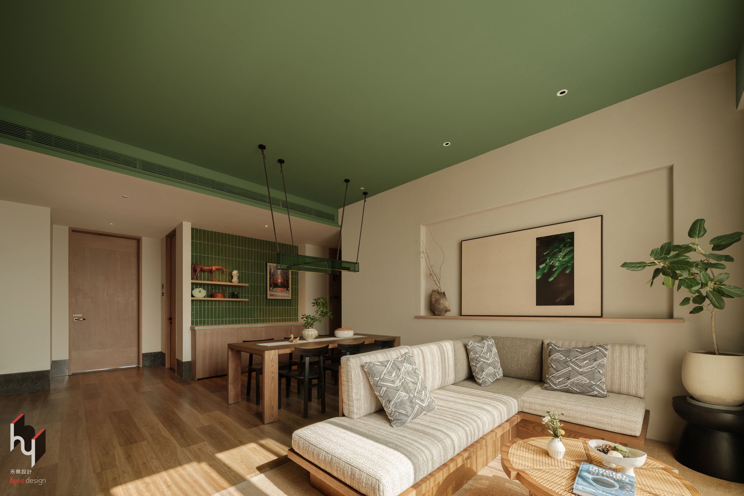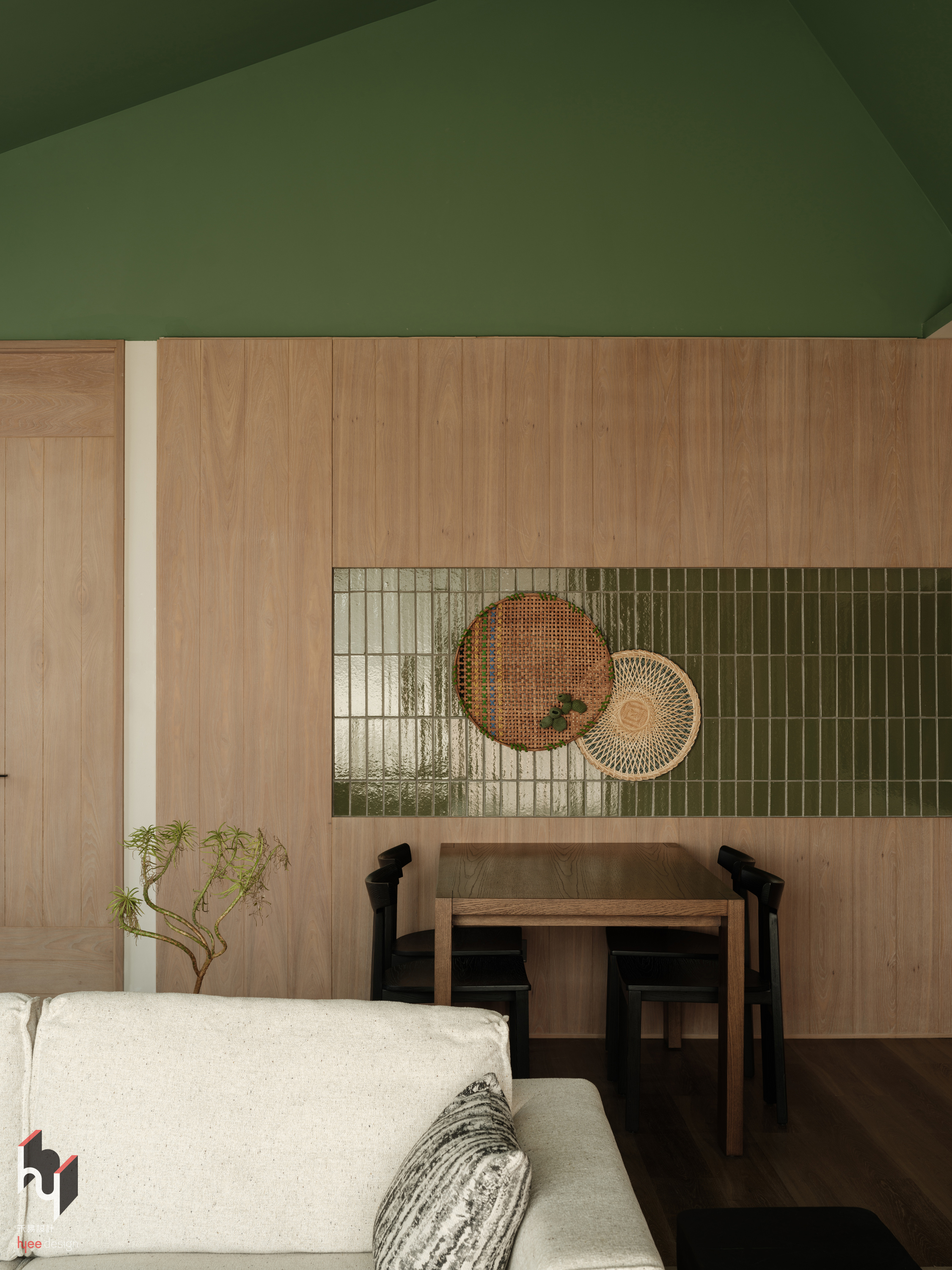 客房,绿色天花板与绿色小瓷砖墙面相呼应,为空间注入自然活力元素,与木质地板、家具的暖色调形成鲜明对比又和谐统一,创造出独特的视觉效果,打破传统空间色彩的单调感。