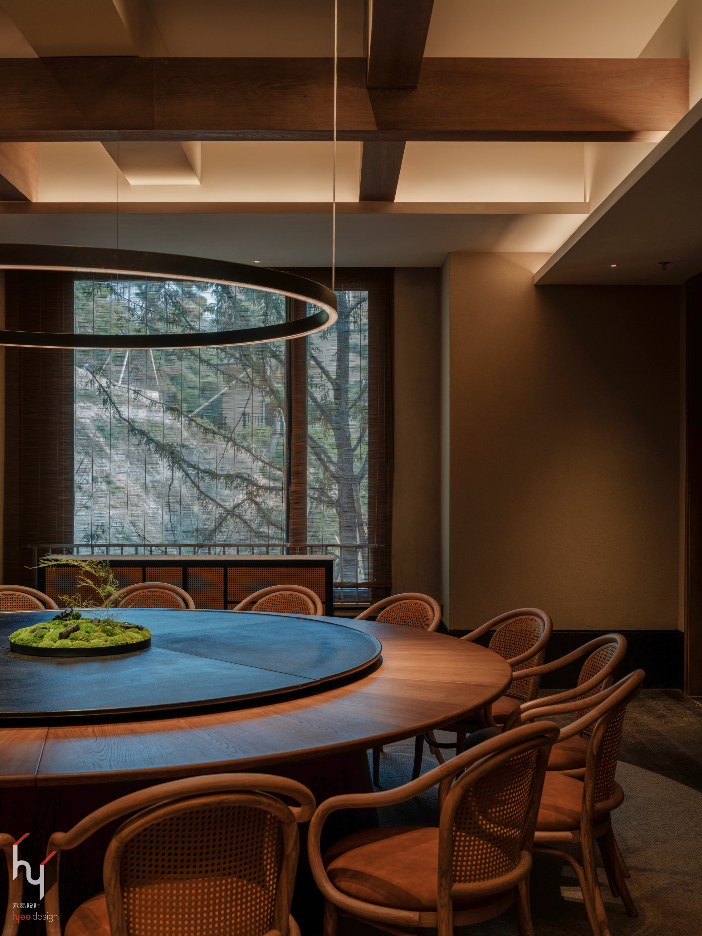 包房内,木质餐桌、藤编椅、深色墙面与金属吊灯相映成趣,不同材质的搭配丰富视觉与触感,自然与现代风格于此融合。大面积窗户将室外绿意引入,树木与室内交织如画,让用餐者在室内亦沉浸于自然气息之中。