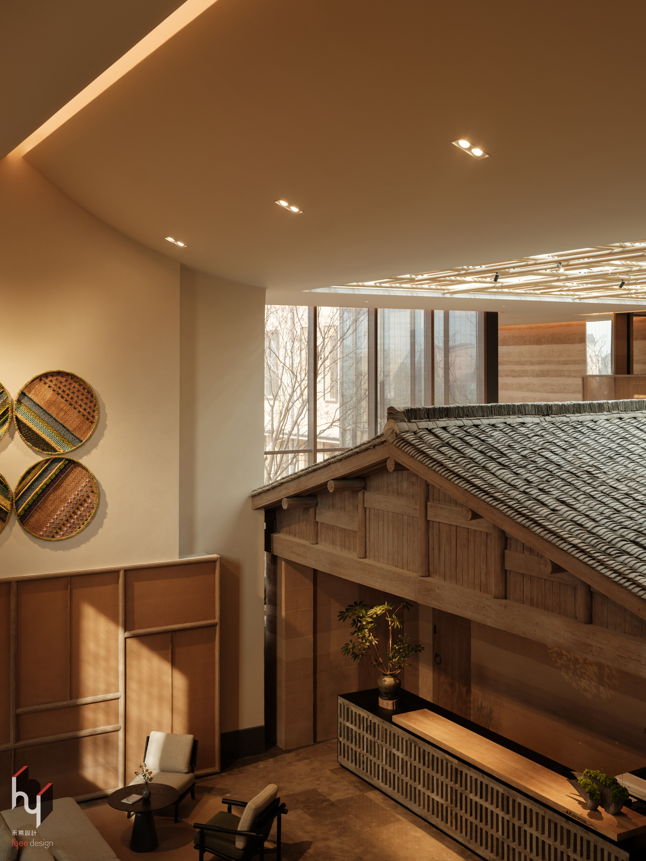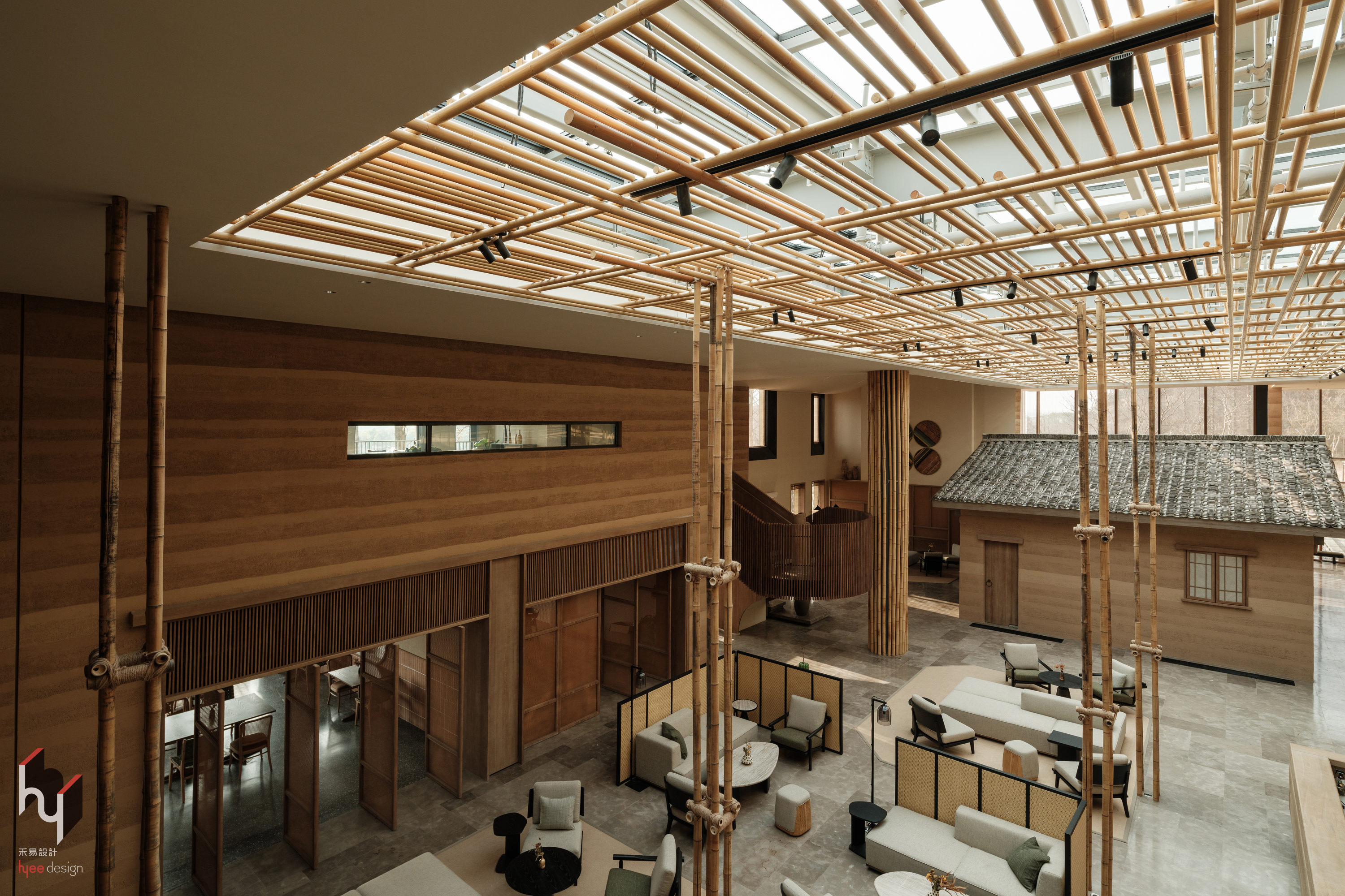 大堂吧,以竹为材构建庞大天窗框架,打破传统建筑结构形式,既展现竹材独特韧性美,又营造出通透、自然的顶部景观,让室内外空间产生微妙互动。