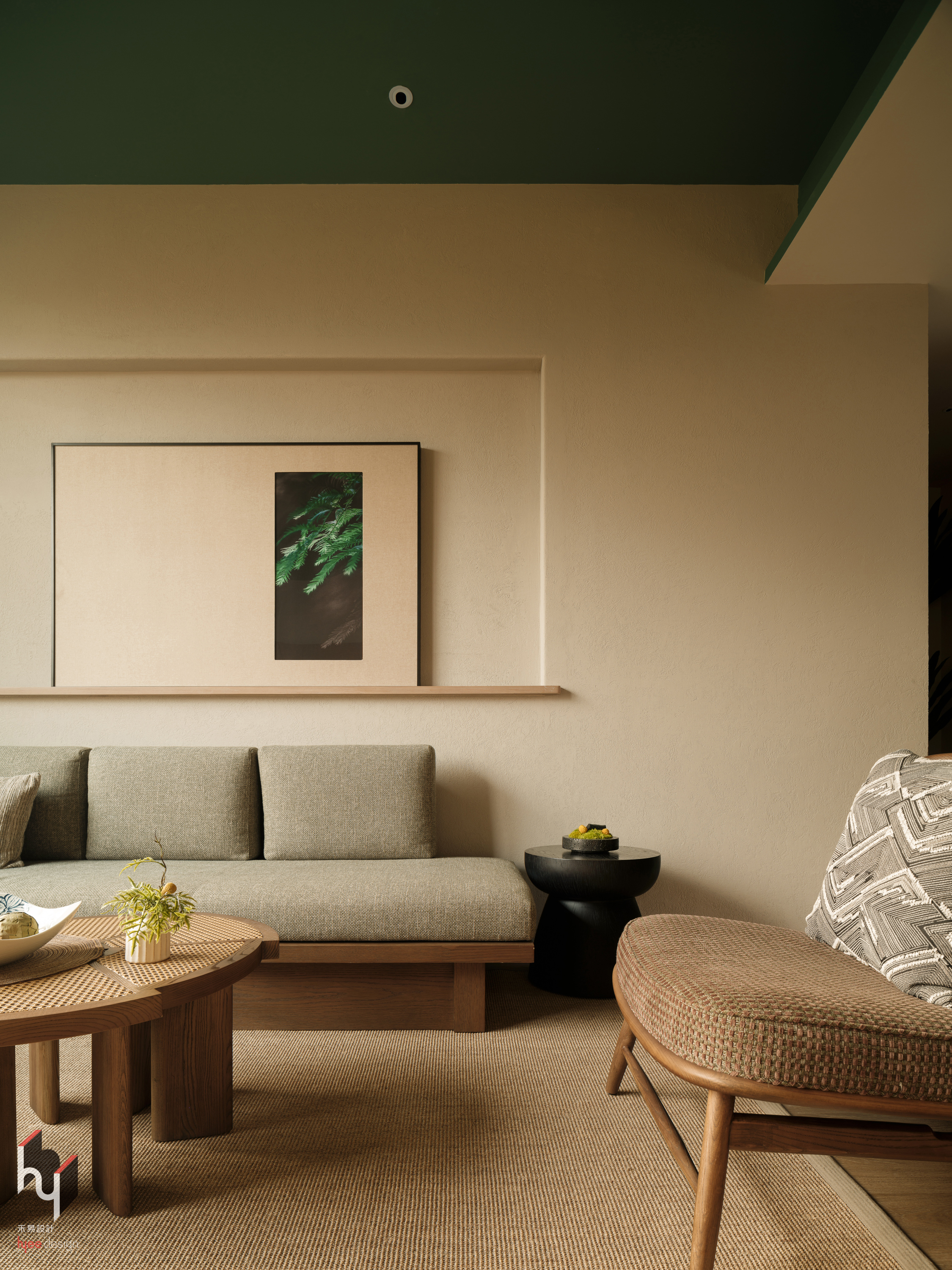 客房内,绿色天花板与玻璃砖彼此呼应,与木质墙面的暖色调大胆碰撞,营造出活泼而富有层次的空间氛围。木质纹理、玻璃光泽与编织盘的粗粝质感相互交织,在触觉与视觉上展现了自然材质与人工材质的和谐共生。