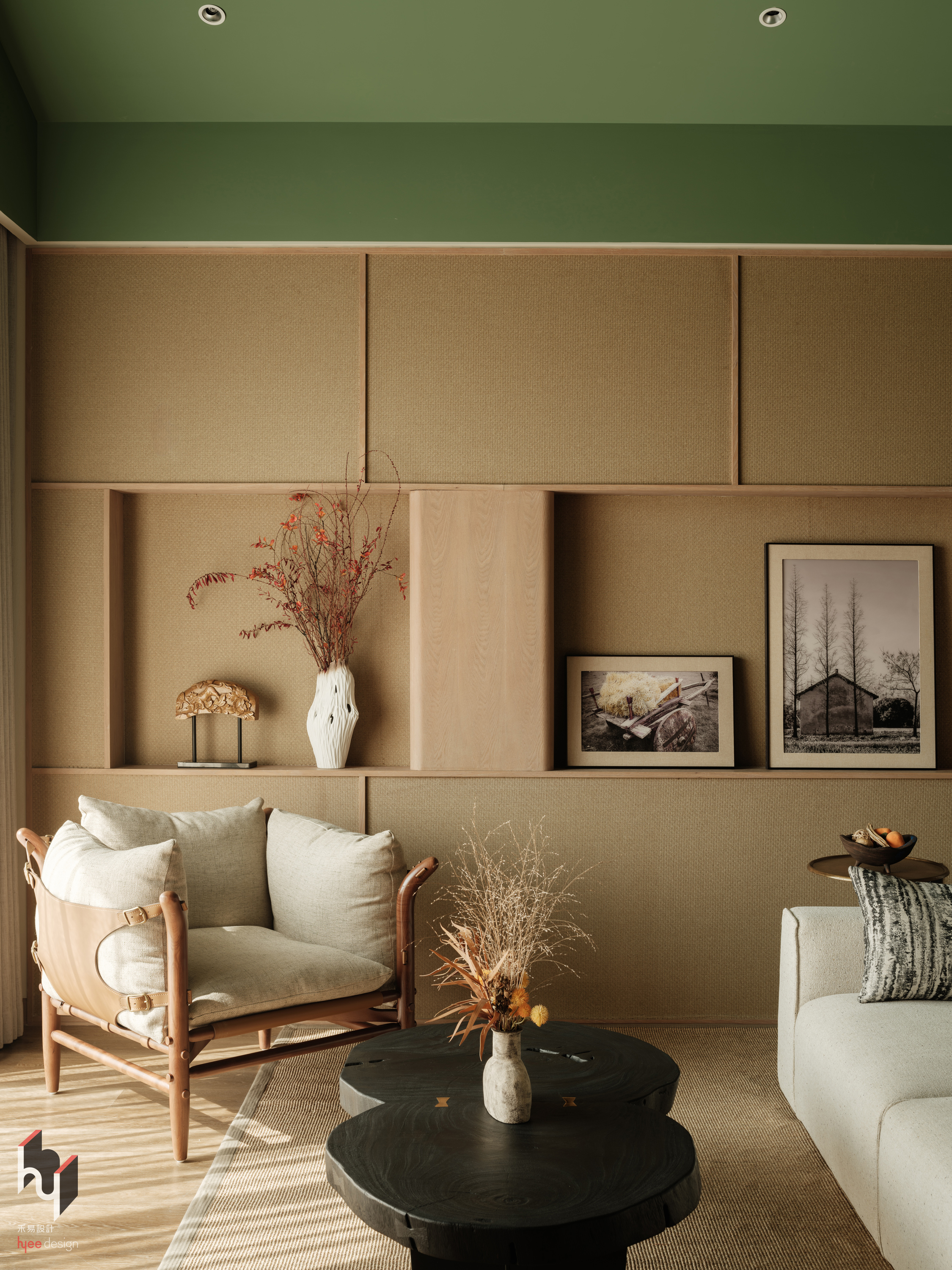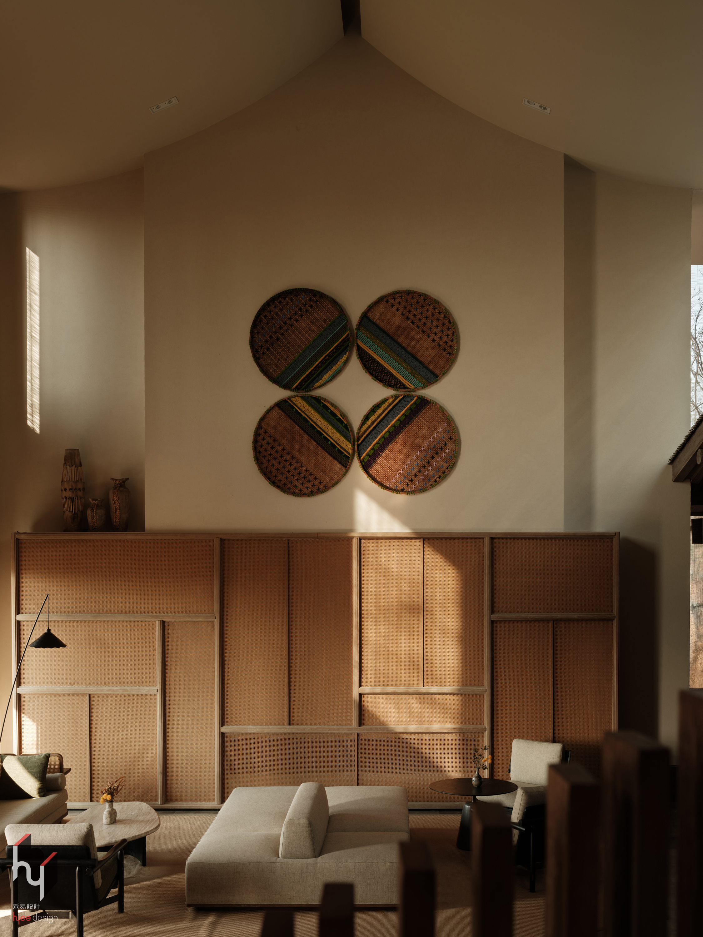 设计选材:在选材与细节处理上,设计秉持可持续理念,大量选用夯土、旧木、竹编等本土可再生材料,降低环境负荷的同时,呼应地域肌理。整体色调以浅木色、豆绿等低饱和度色彩为基础,与窗外自然景致和谐相融,共同营造出宁静放松的氛围。此外,空间中融入手工编织织物、金属镂空灯罩等精湛工艺细节,既提升了视觉的艺术层次,也延续了在地手工艺的温情与记忆,使空间在低调中蕴含人文深度。
