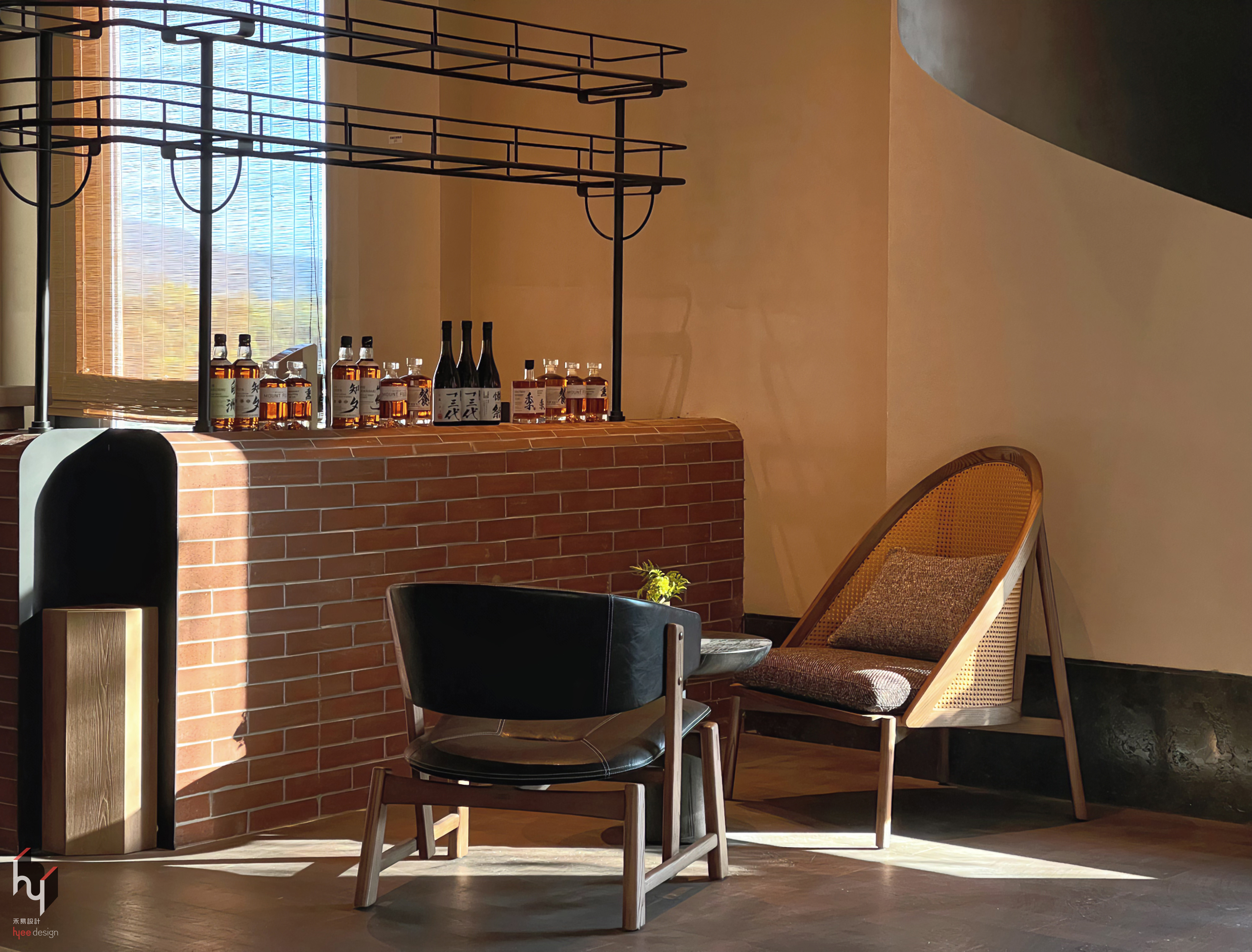 酒吧,红砖的粗糙质感、黑色金属的硬朗、皮质座椅的光滑以及藤编椅的编织纹理相互对比,丰富了空间的触觉和视觉感受,展现出自然与工业风格的巧妙结合。