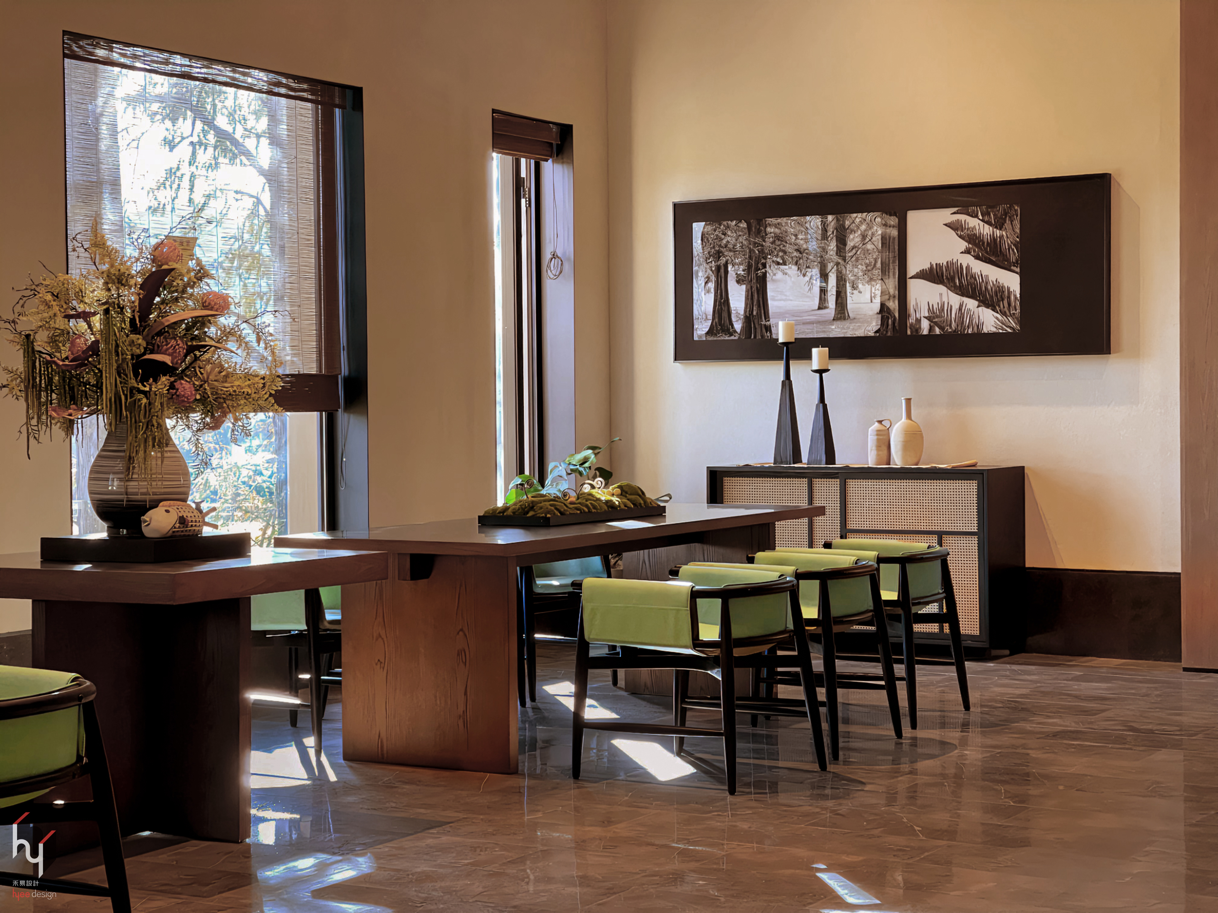 会议室,在整体沉稳的色调中,选用鲜亮的绿色餐椅作为点缀,形成强烈的色彩对比,瞬间吸引视线,为空间注入活力与生机,打破传统餐厅色彩搭配的常规。