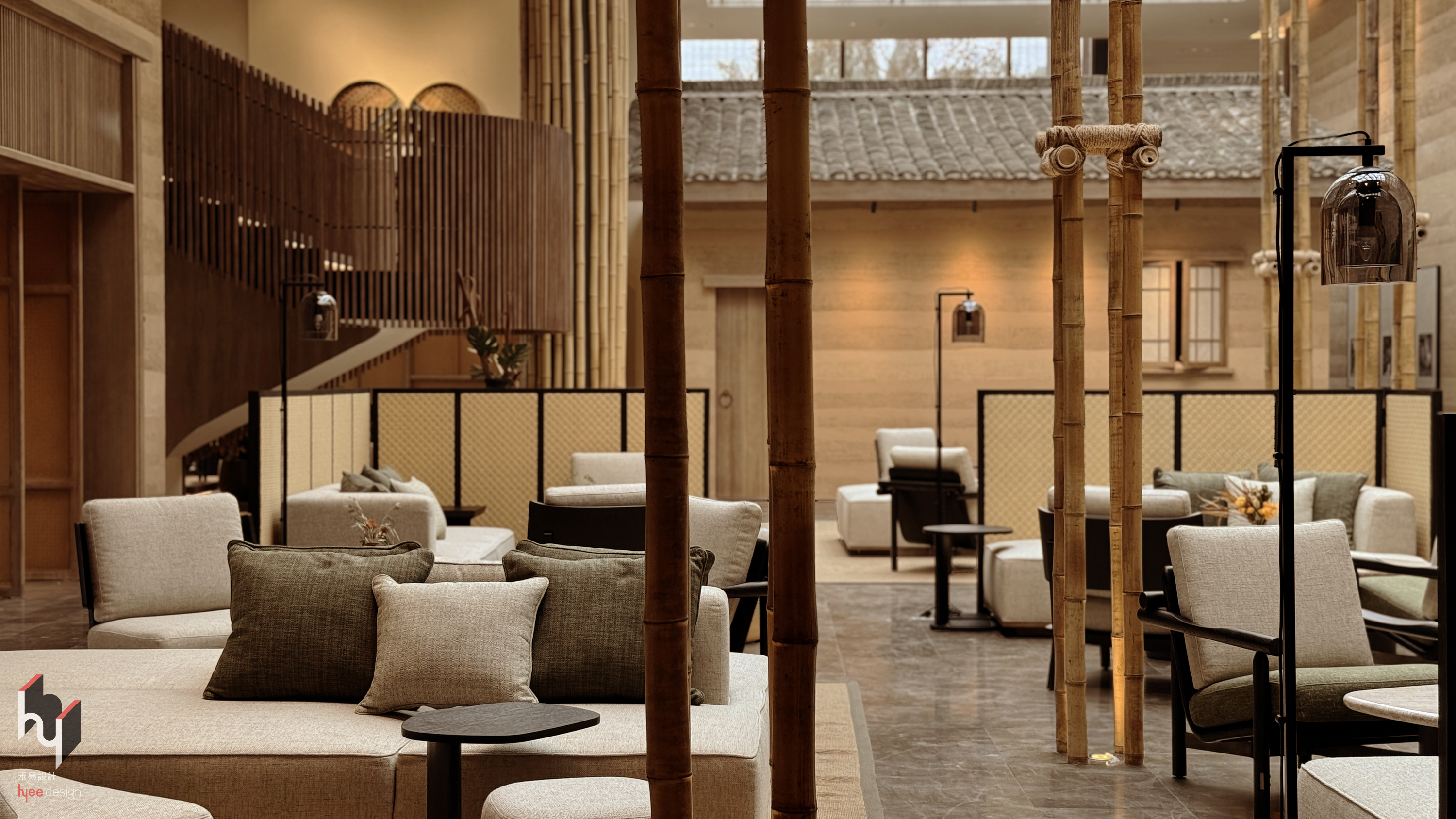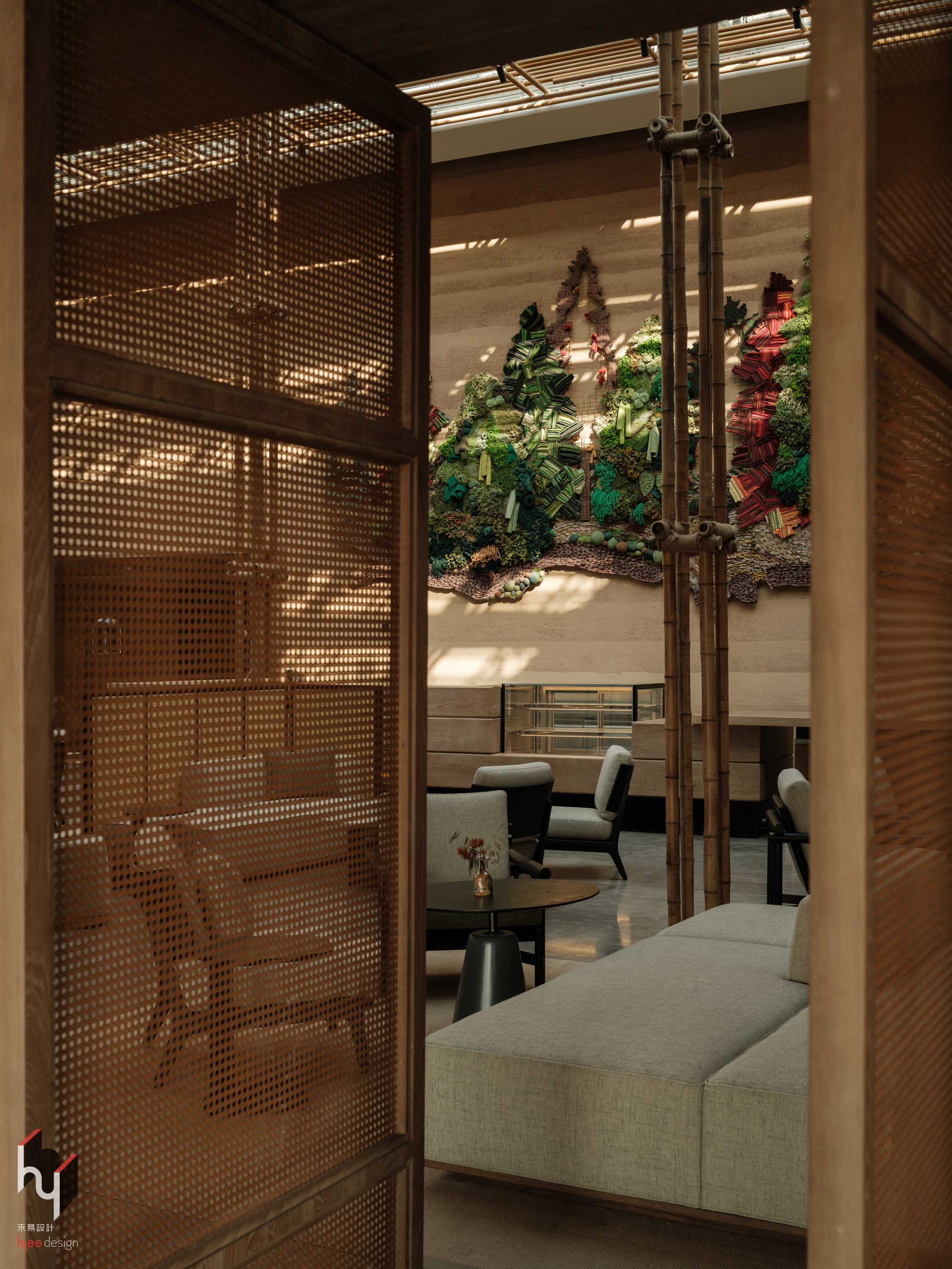 大堂吧,采用竹制格栅门作为空间分隔,既保留了空间的通透感与流动性,又增添了东方韵味与自然质感,形成独特的空间划分方式。
