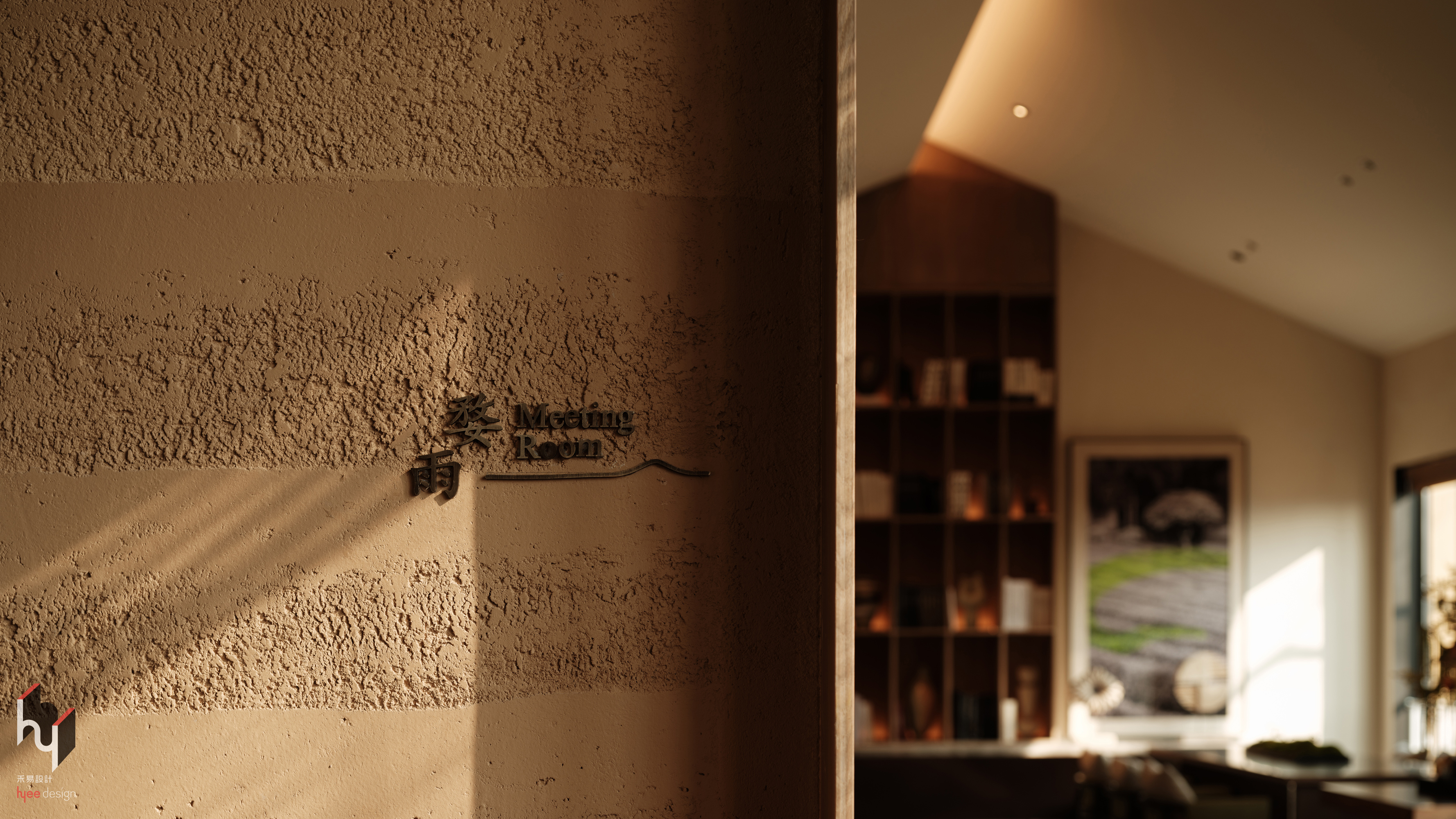 会议室,标识牌材质与墙面质感相协调,粗糙墙面凸显标识的精致,形成质感对比,强化视觉焦点,同时展现出自然质朴的风格。
