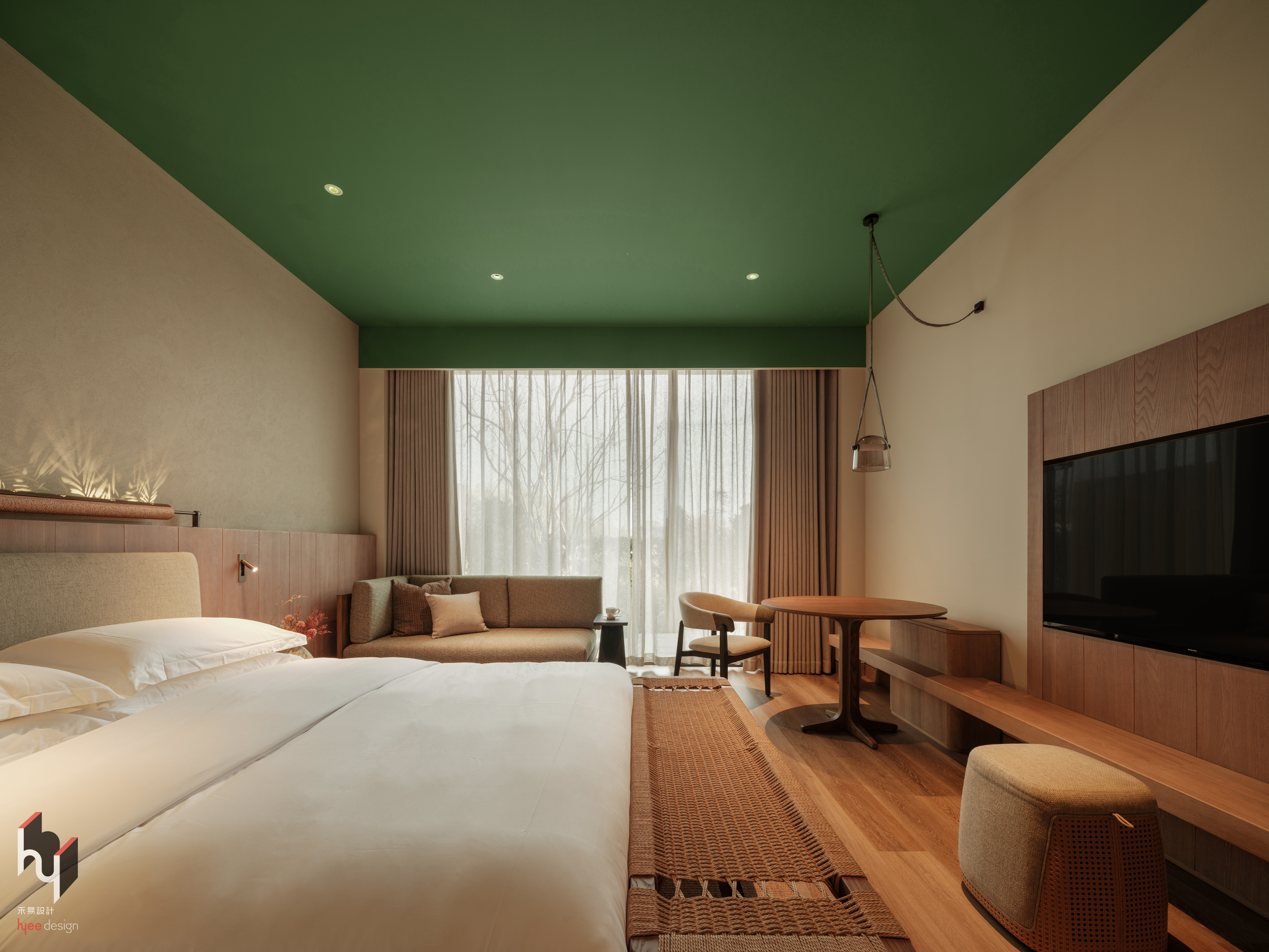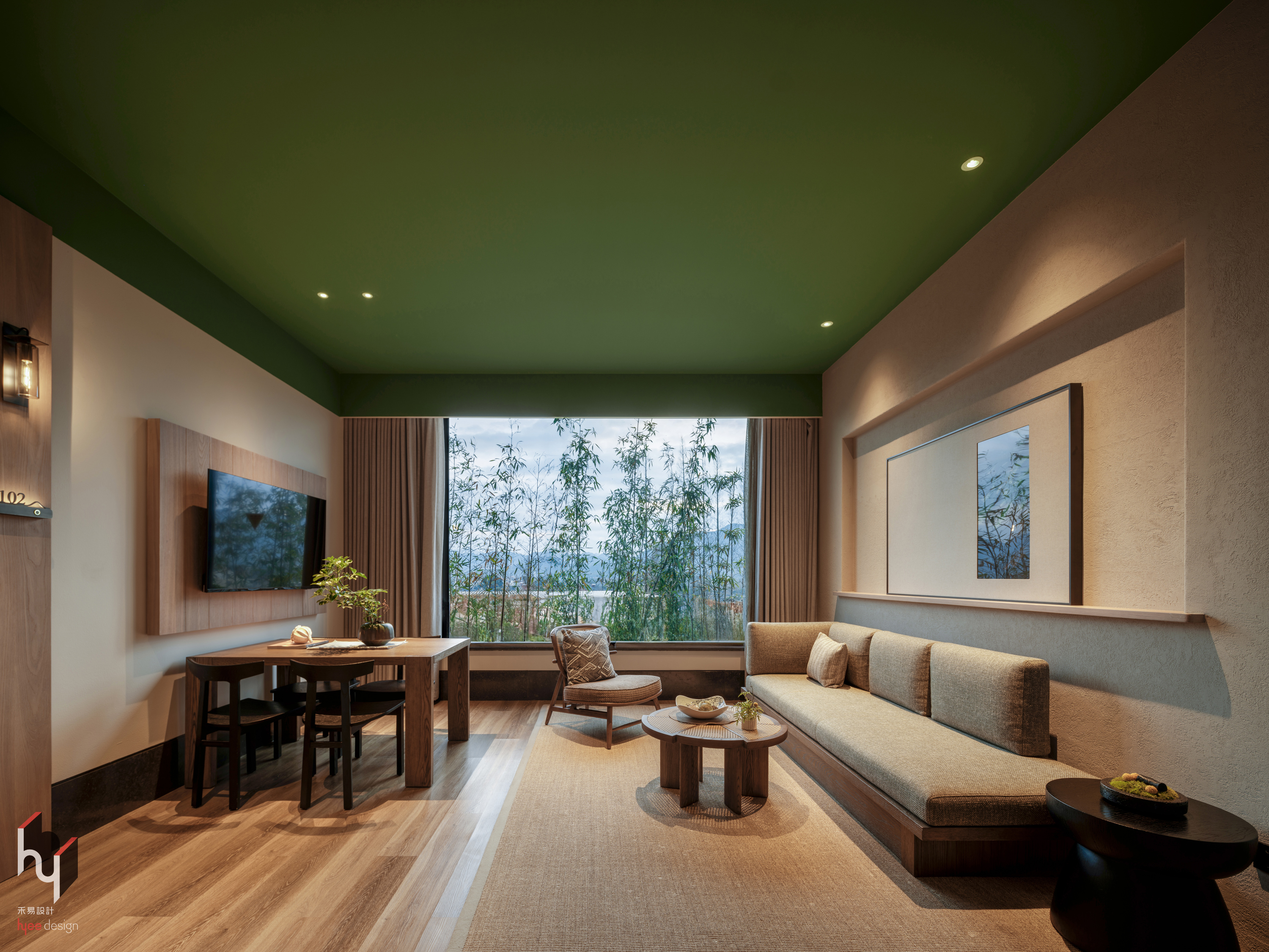 客房采用绿色天花板,大胆呼应窗外竹林,为空间注入自然活力。大面积落地窗将竹景引入室内,窗台绿植进一步延伸自然氛围,让人于室内沉浸于盎然绿意之中。