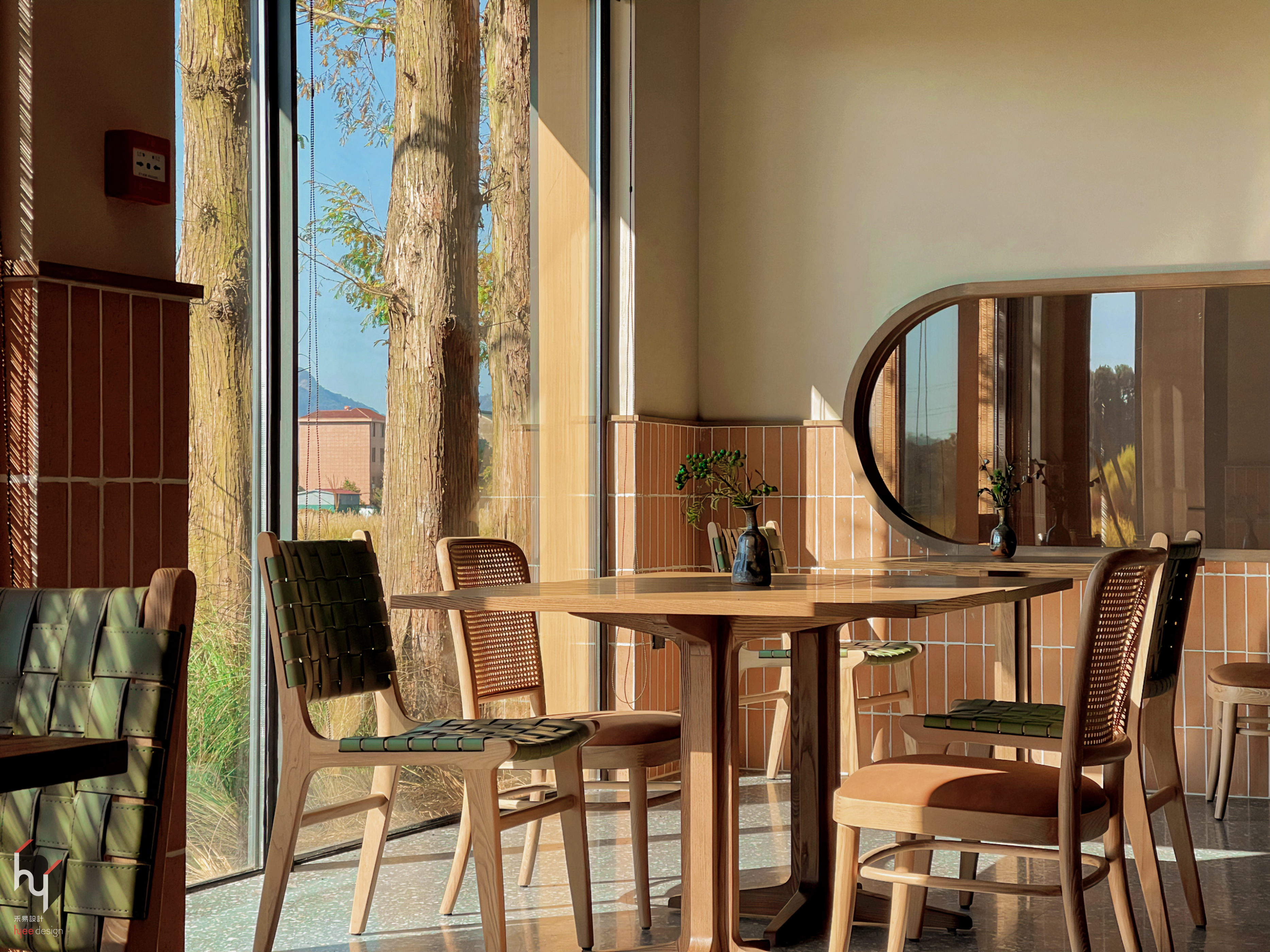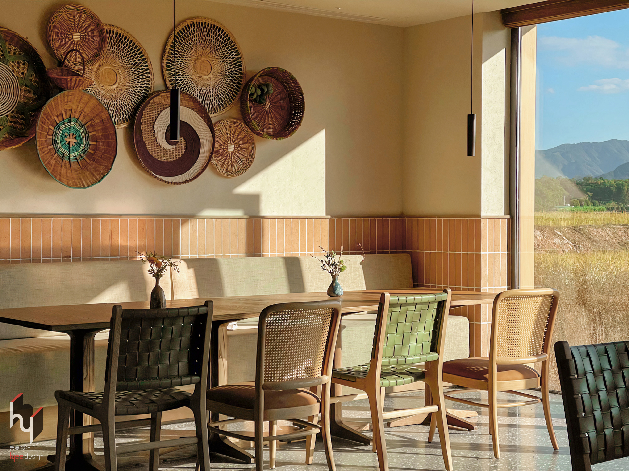 早餐厅以橙棕色小瓷砖铺就半墙,既保护墙面,又以其色调与质感注入复古自然的格调。阳光透过玻璃窗,在木质桌椅与编织椅面上洒落斑驳光影,随时间流转而变幻,为空间增添动态美感与温暖氛围。