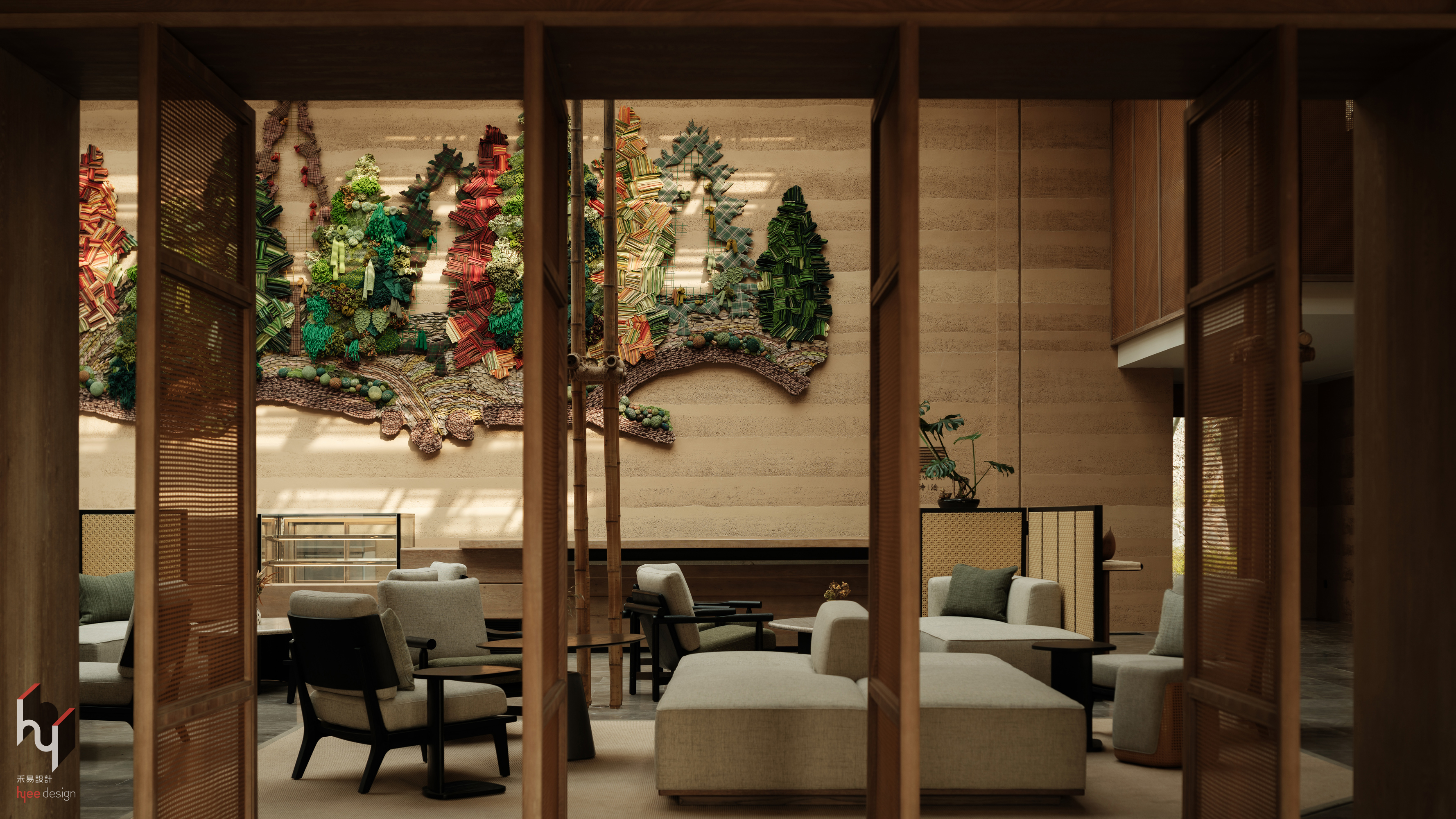 大堂吧采用竹制格栅门进行空间分隔,在保持通透流动的同时,亦注入东方韵味与自然肌理。墙面以多重材料塑造立体森林景致,打破传统平面装饰,将自然元素艺术化呈现,赋予空间视觉张力与沉浸氛围。