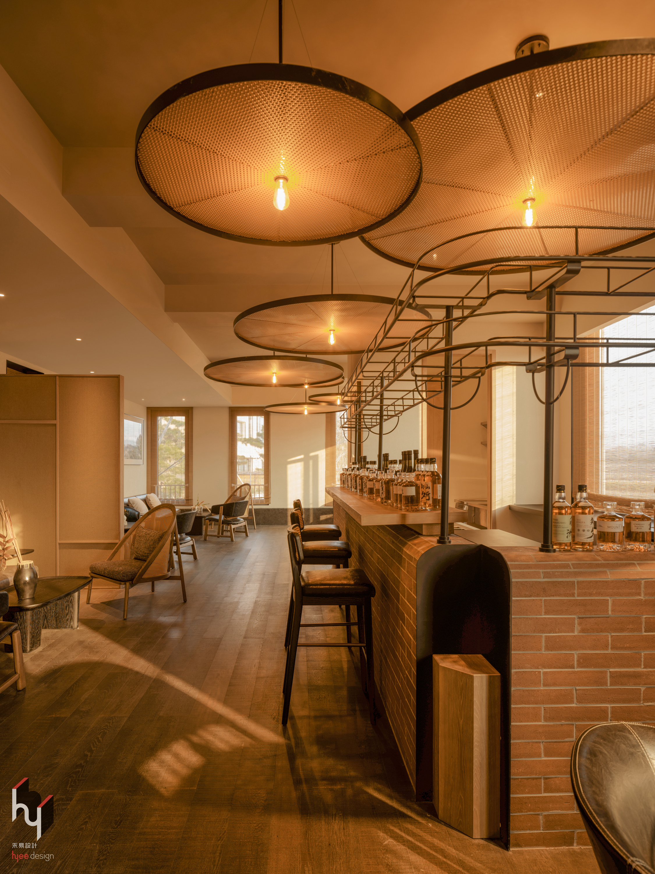 酒吧采用黑色金属框架悬挂式酒架,线条简洁、形态几何,赋予空间现代通透的视觉焦点。酒瓶于木质吧台整齐排列,标签统一朝外,既便于识别,亦通过丰富的品牌与款式陈列,展现专业品藏。
