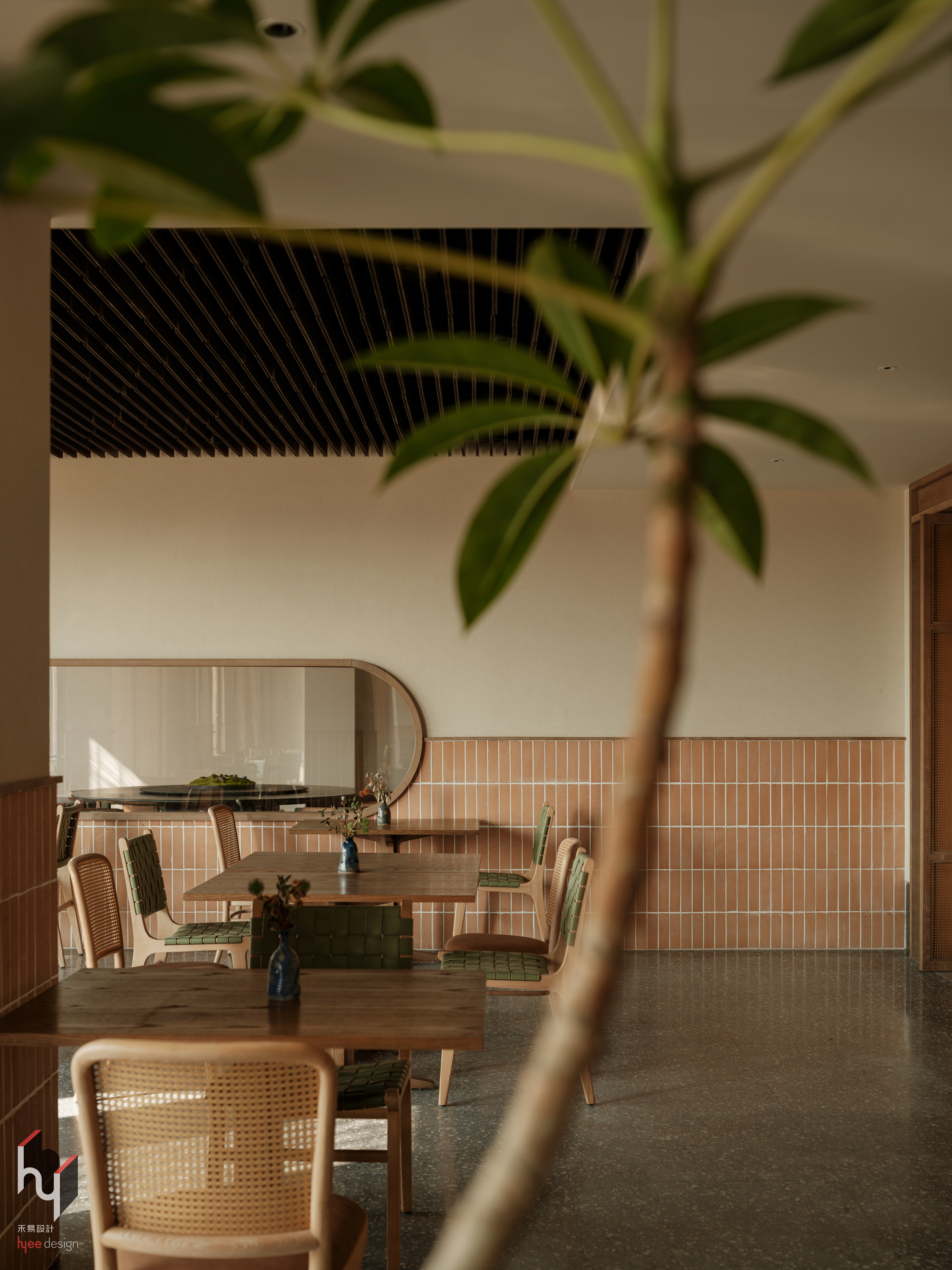 早餐厅以木质格栅与圆形镂空结合的隔断为特色,在有效划分区域的同时,赋予空间通透的韵律与趣味。木质、藤编、陶瓷等自然材质相互融合,在对比中达成和谐,共同塑造出既质朴自然又不失精致的整体氛围。