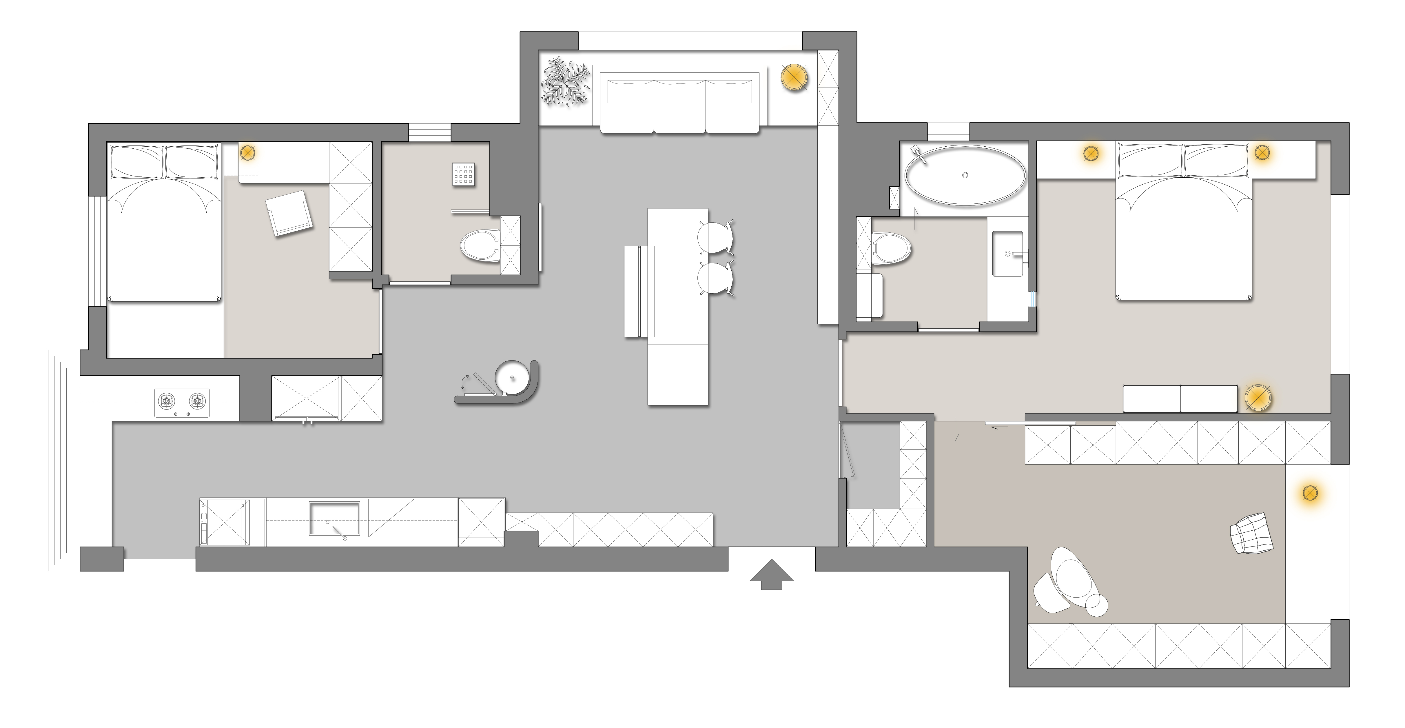 空间布局:本案在空间布局创新上,打破原始户型桎梏,摒弃传统分区的生硬割裂。将公共区域(客厅、餐厨等)进行开放式整合,消融空间边界,构建流畅洄游动线,让不同功能区自然衔接、交互渗透。利用结构改造,把原本零散的空间单元,重塑为连贯且富有层次的生活场景,既放大空间视觉尺度,又适配现代多元生活模式,实现功能与体验的双重升级,让家成为可生长、可互动的有机整体,重新定义居住空间的叙事逻辑 。