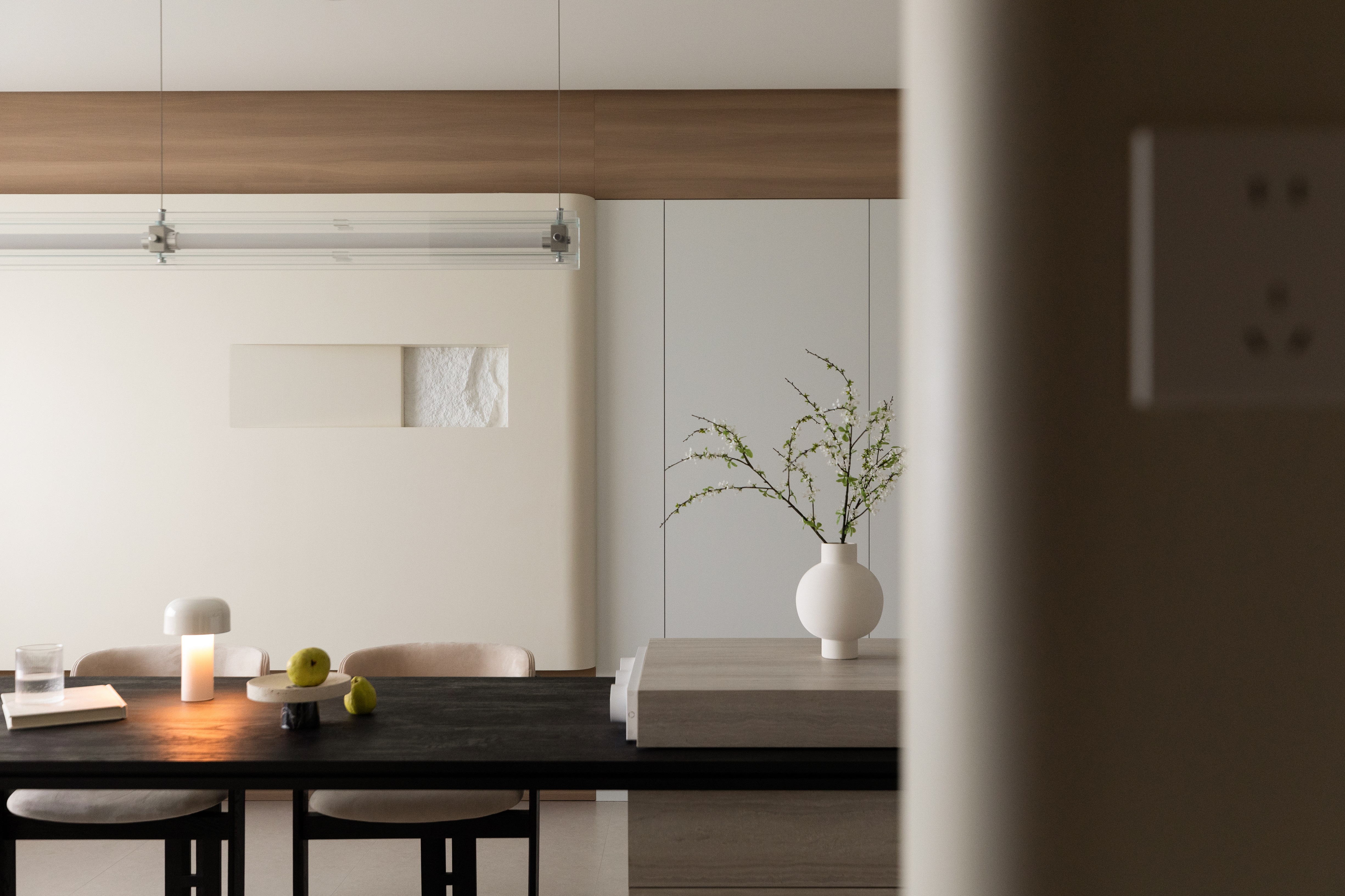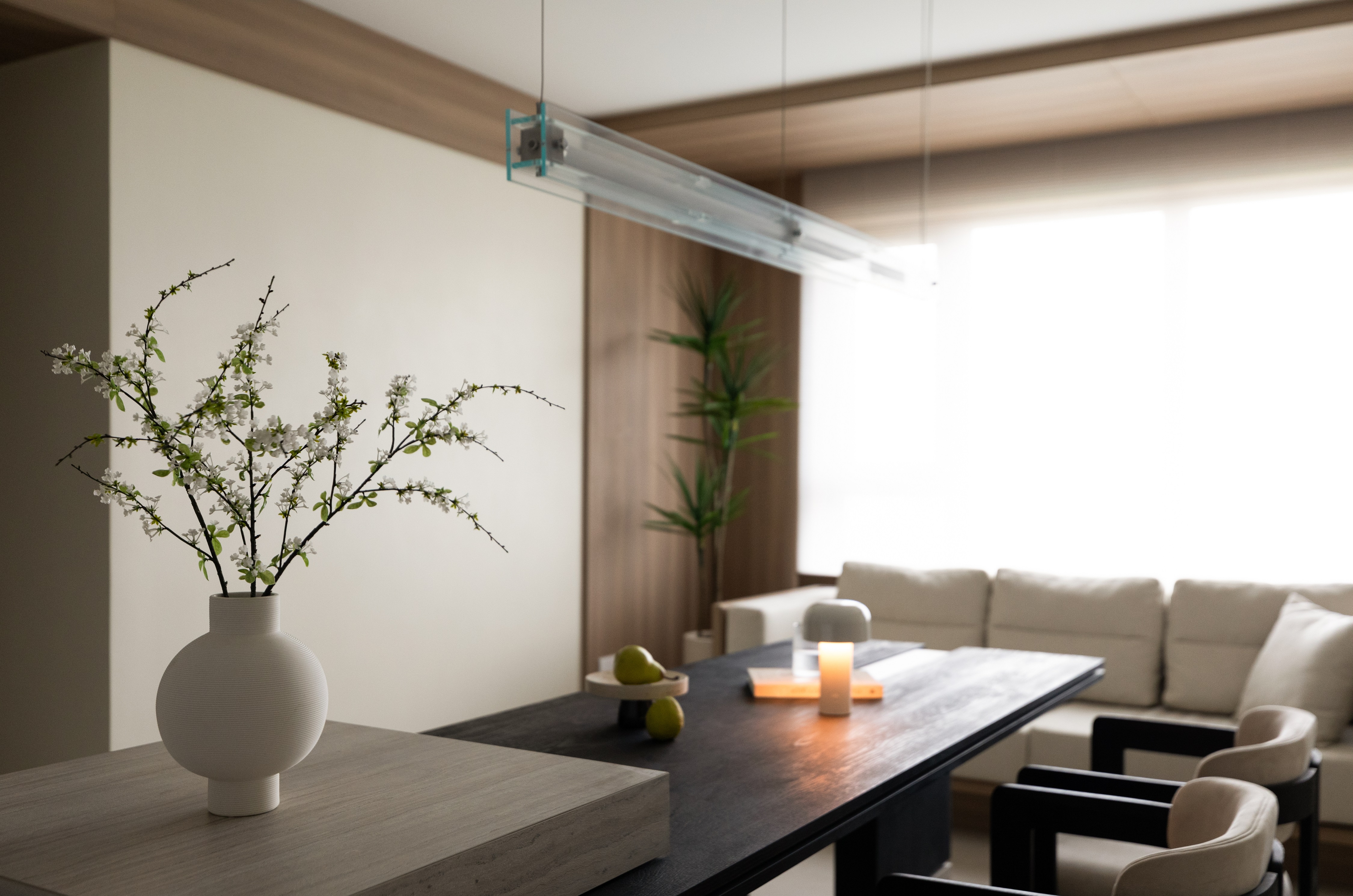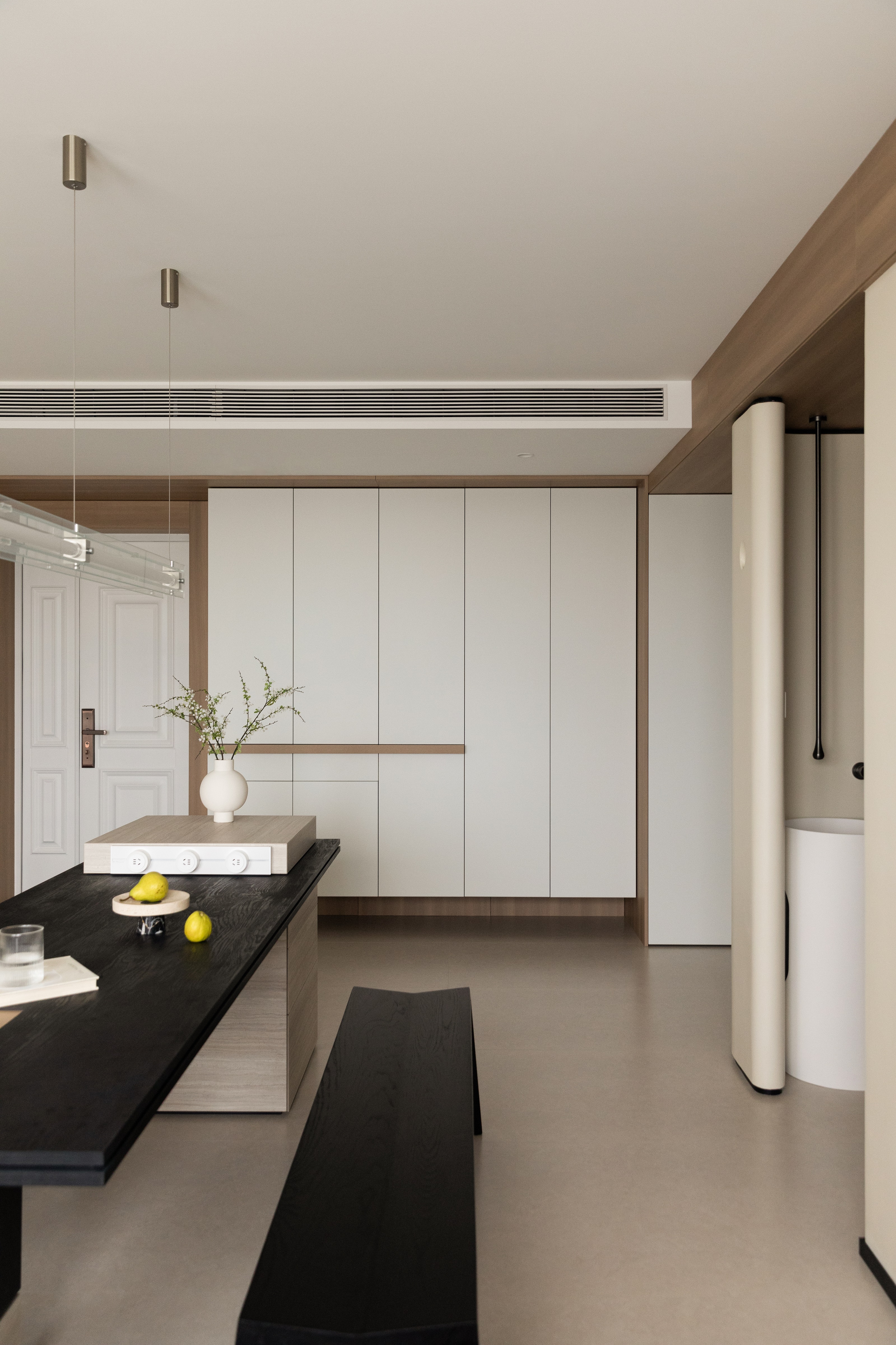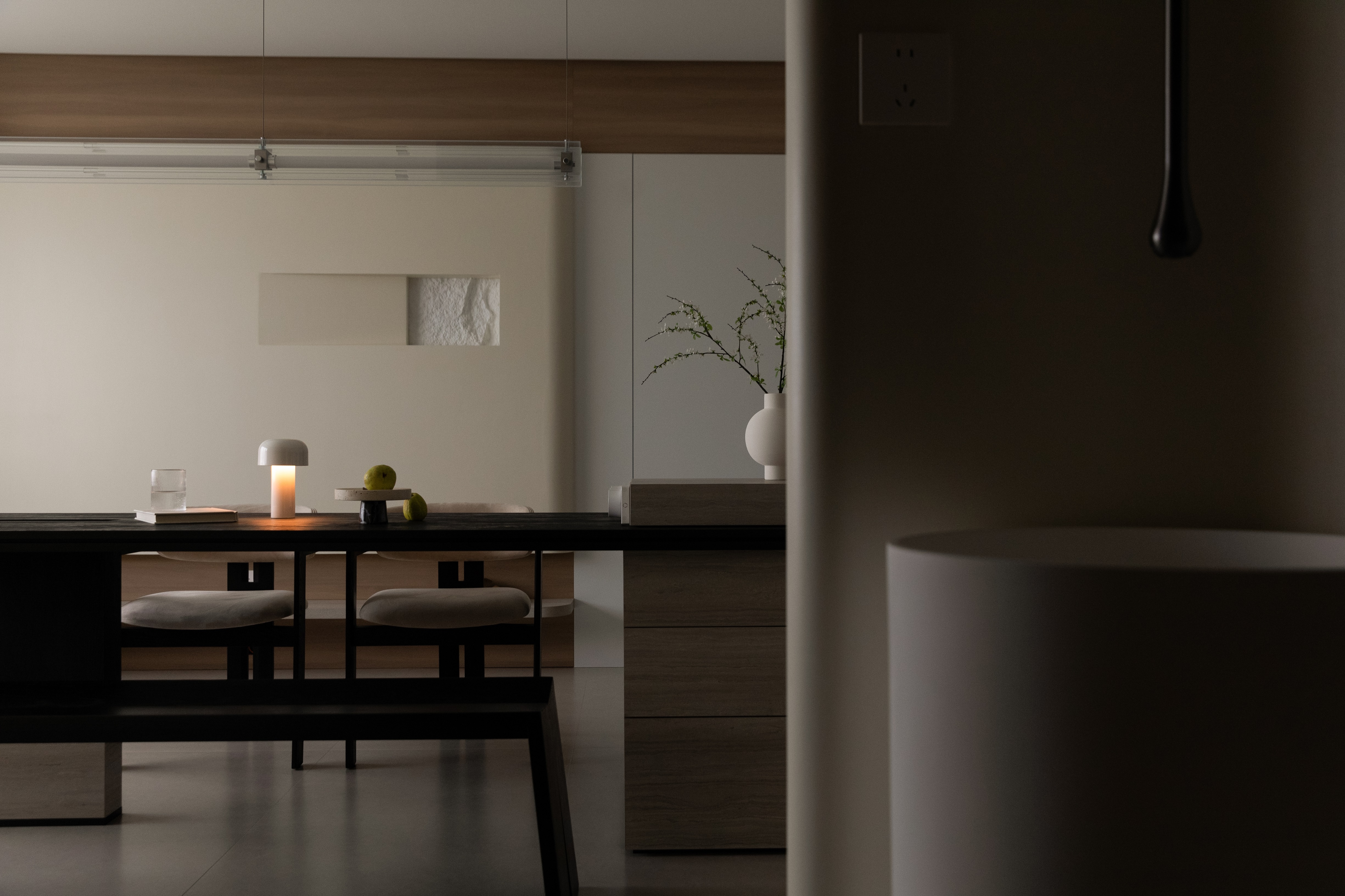 以「去客厅化」思维重构起居范式,摒弃传统沙发围合定式,借地台沙发与黑色炭烧木餐桌构建开放交互场。木质温润打底,微水泥的素净、洞石岩板的粗粝暗涌层次,炭烧木的沉敛与柔光砖的清透形成对话。蜂巢帘柔滤日光,绿植隐植角落,让自然材质在极简框架里,生长出简静交融的呼吸感,孵育松弛的生活场域 。