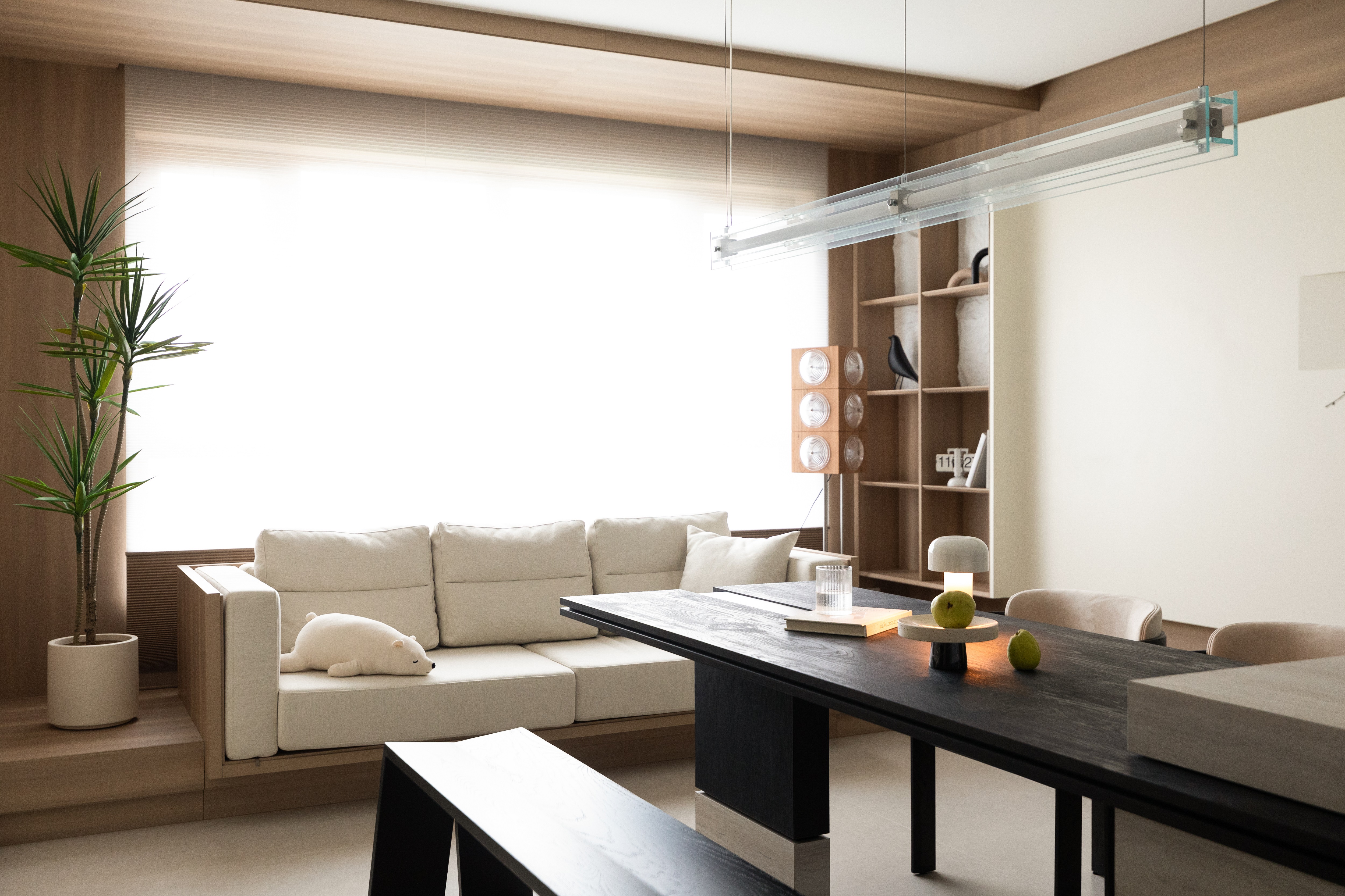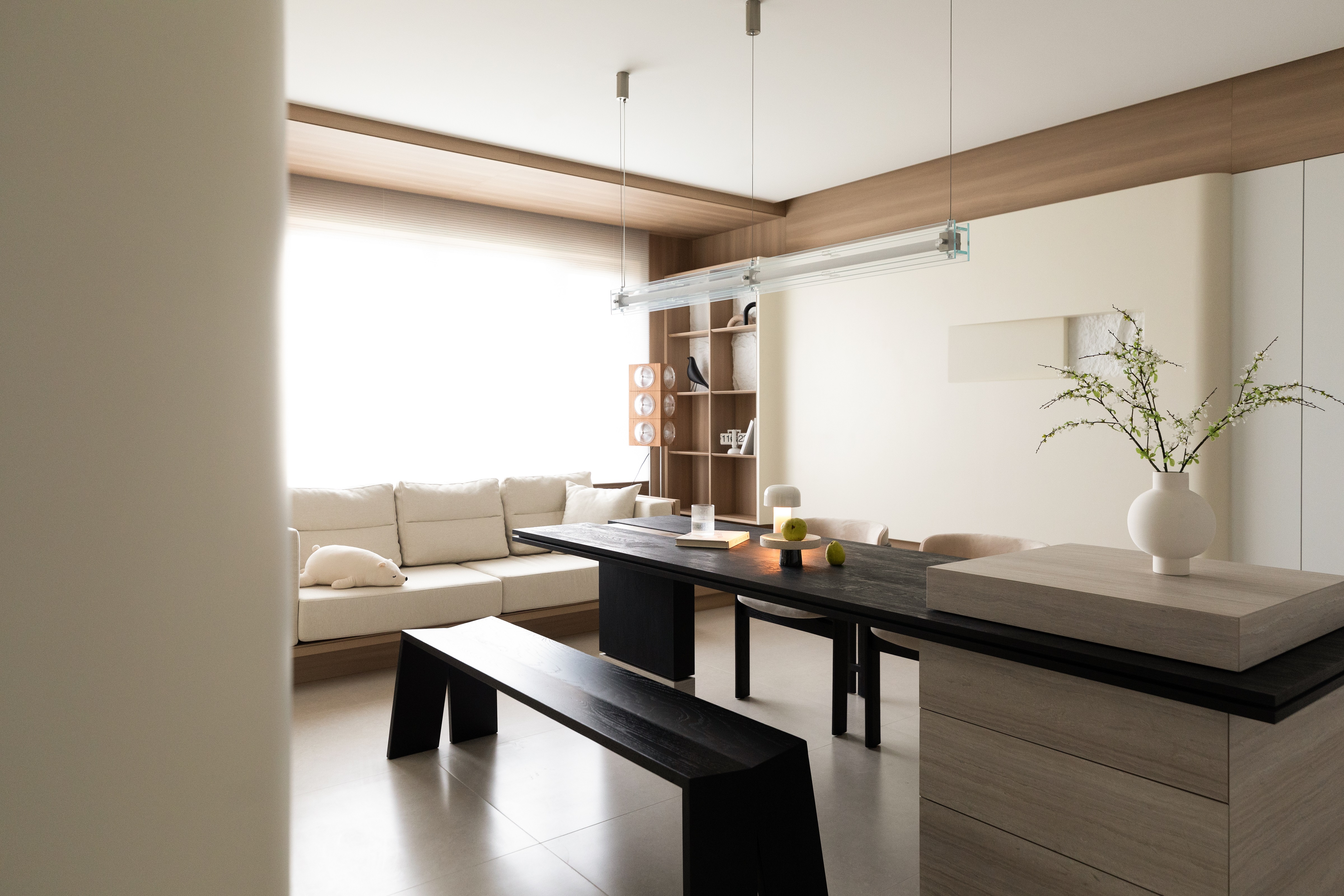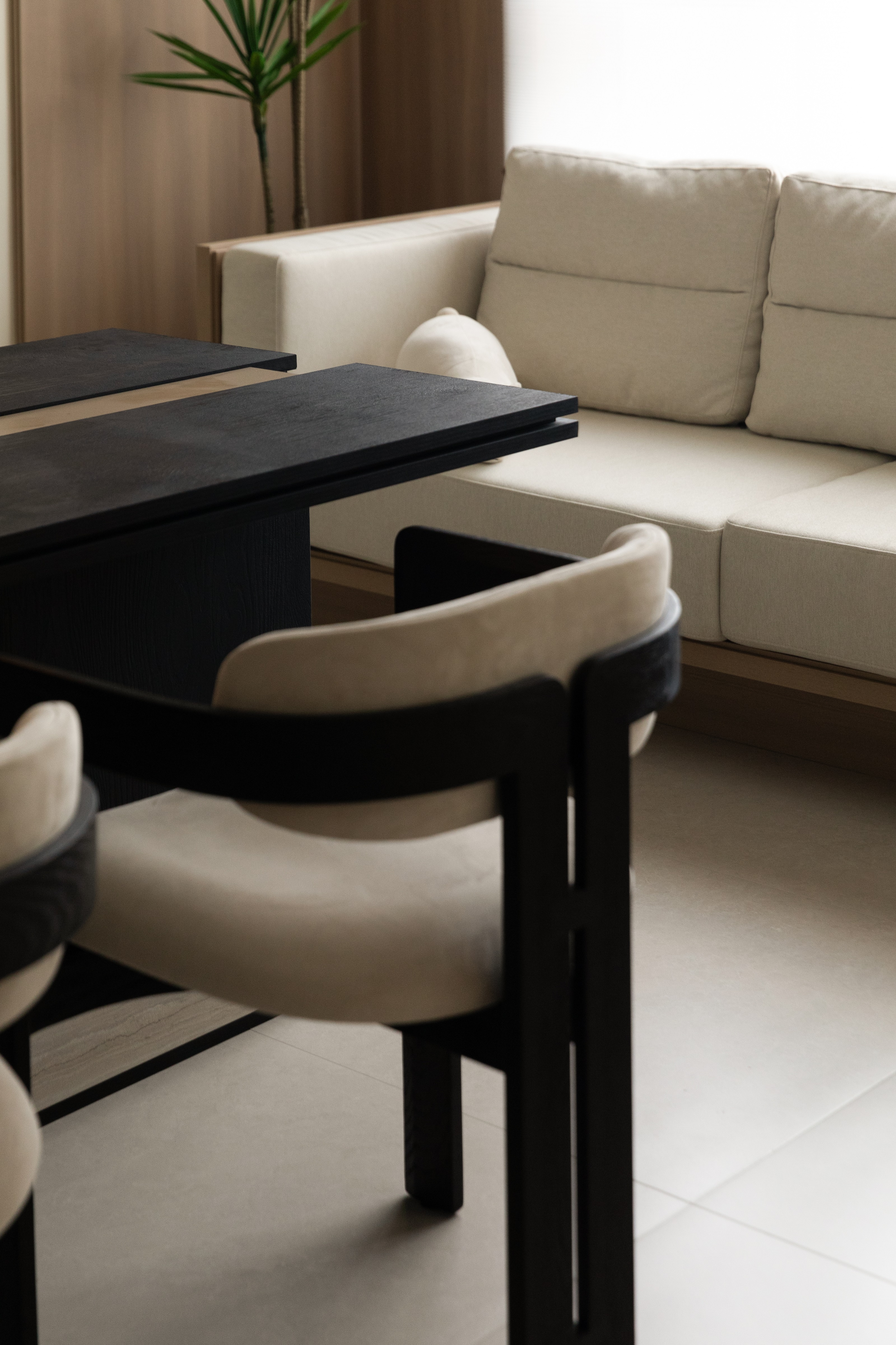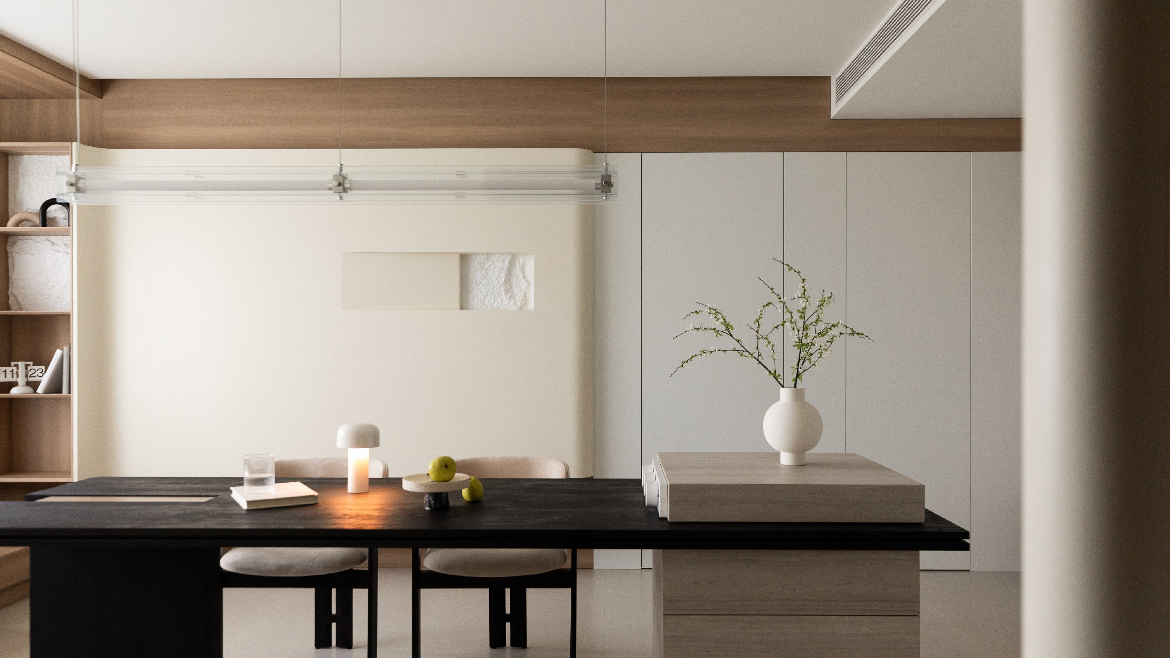 以「去客厅化」思维重构起居范式,摒弃传统沙发围合定式,借地台沙发与黑色炭烧木餐桌构建开放交互场。木质温润打底,微水泥的素净、洞石岩板的粗粝暗涌层次,炭烧木的沉敛与柔光砖的清透形成对话。蜂巢帘柔滤日光,绿植隐植角落,让自然材质在极简框架里,生长出简静交融的呼吸感,孵育松弛的生活场域 。