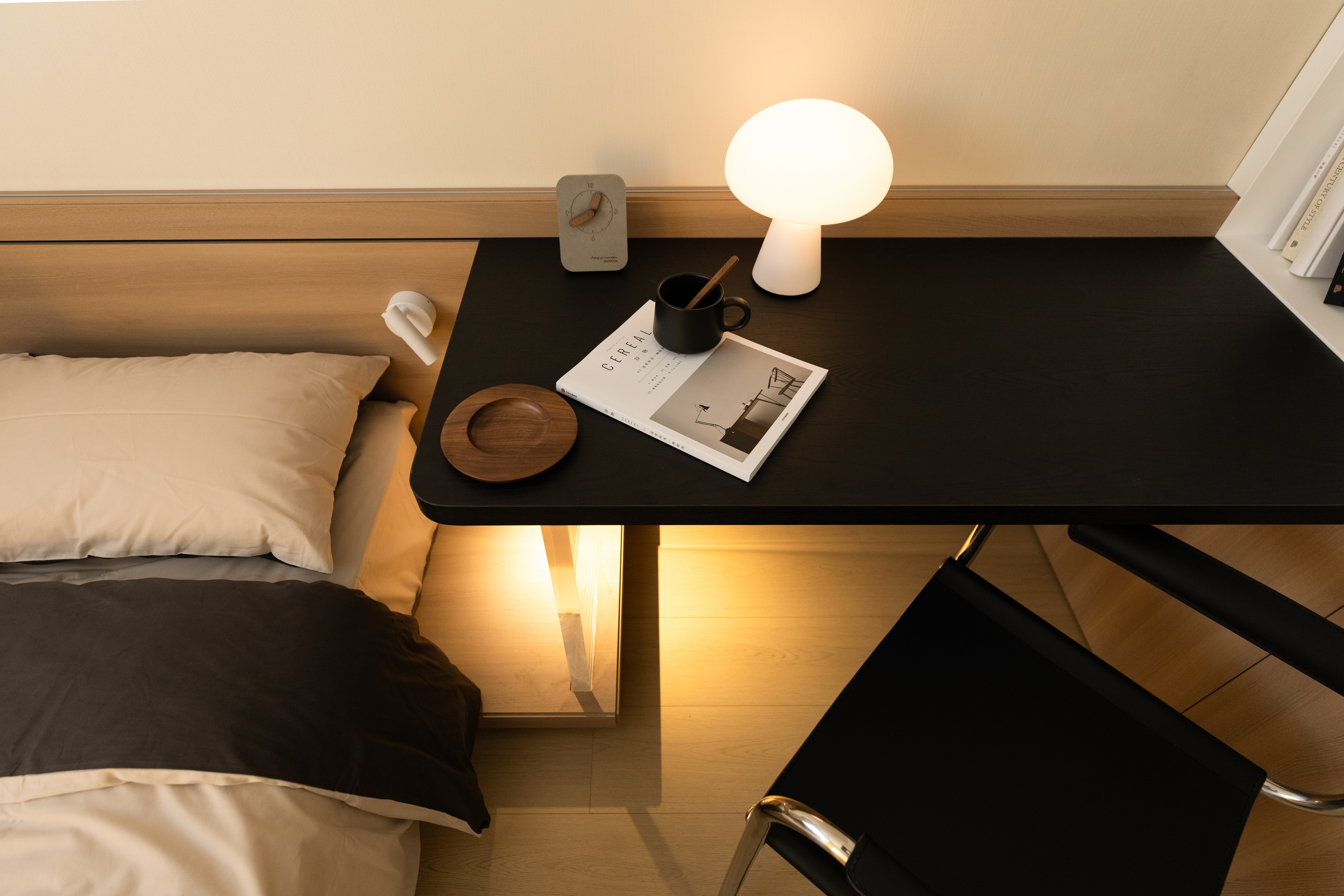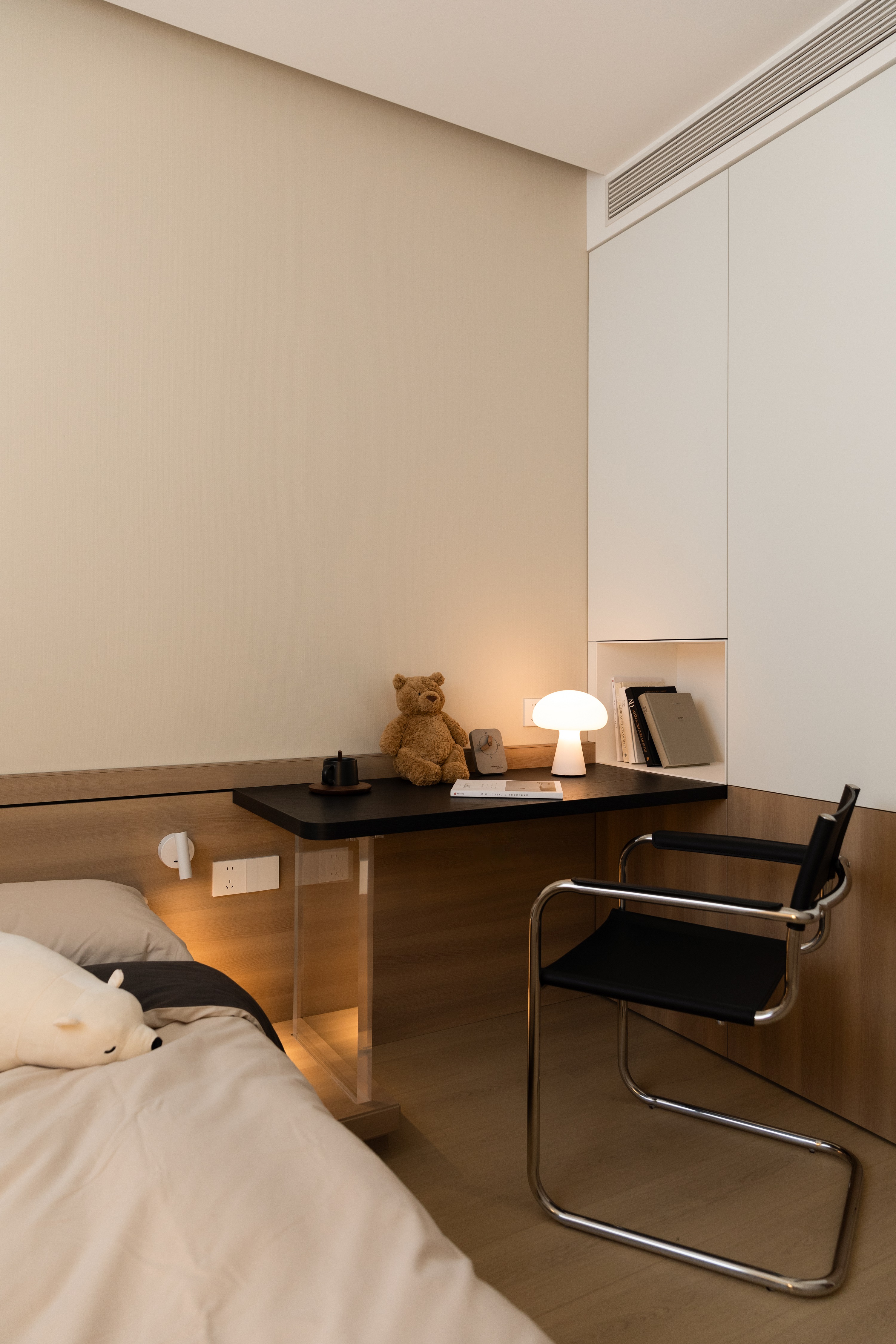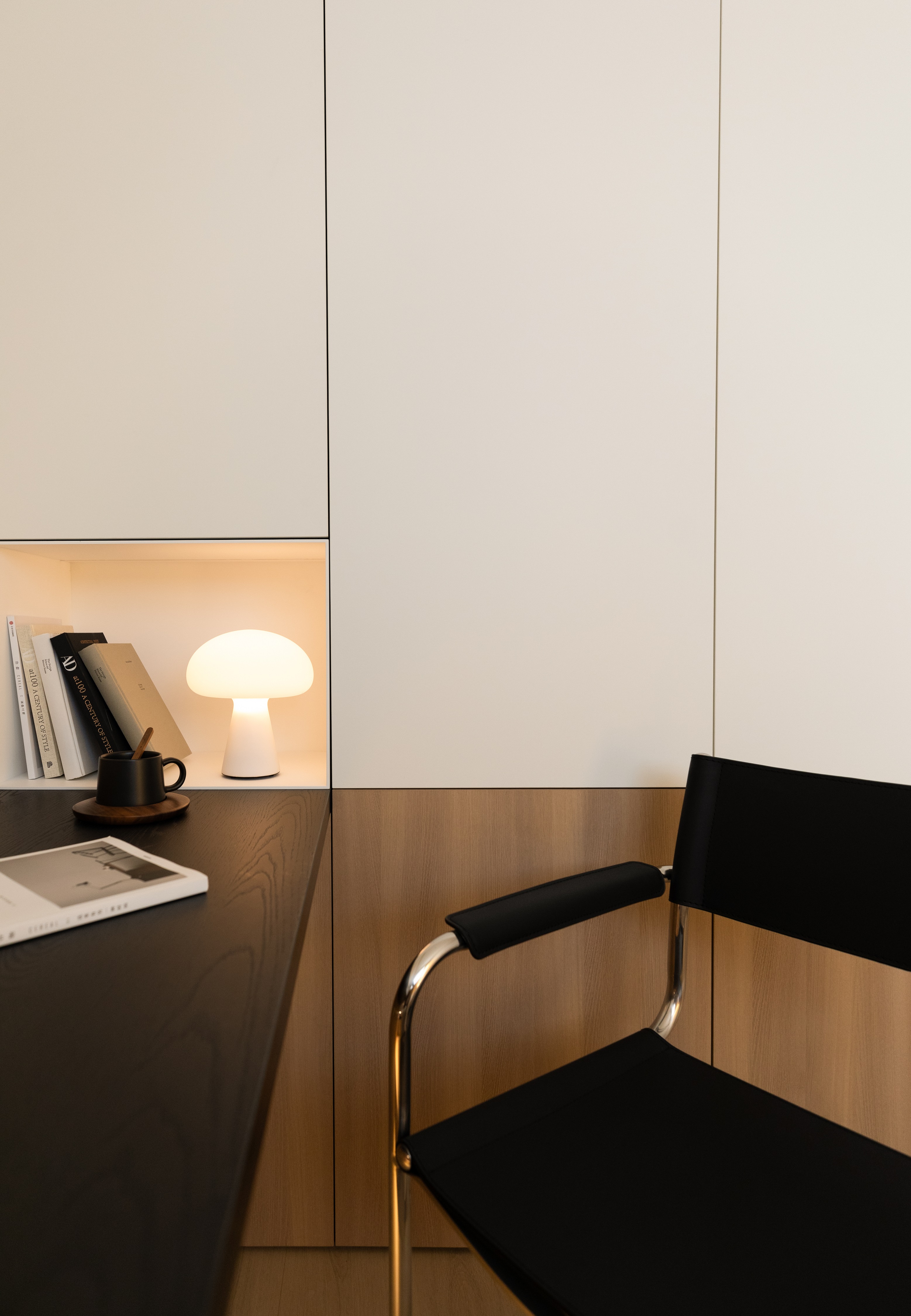 本案业主会在未来两三年后要宝宝,所以我们将次卧以「时间友好型过渡空间」为内核,以米杏墙布与原木基底构建温润场域,黑色家具以克制对比锚定极简秩序;当下,低饱和床品包裹休憩氛围,悬浮书桌与通高柜体形成 “轻办公 + 收纳” 系统,蘑菇灯暖光为阅读区晕染松弛感,环保耐磨材质与圆角细节,现阶段是品质表达,未来将成为安全屏障;几年后,无需结构变动,仅通过萌趣软装(如帐篷、手作陈列)与功能切换(书桌承接学习、柜体释放玩具收纳),即可自然转译儿童房属性,让空间如 “时间容器”,从容衔接现在与未来的使用场景 。