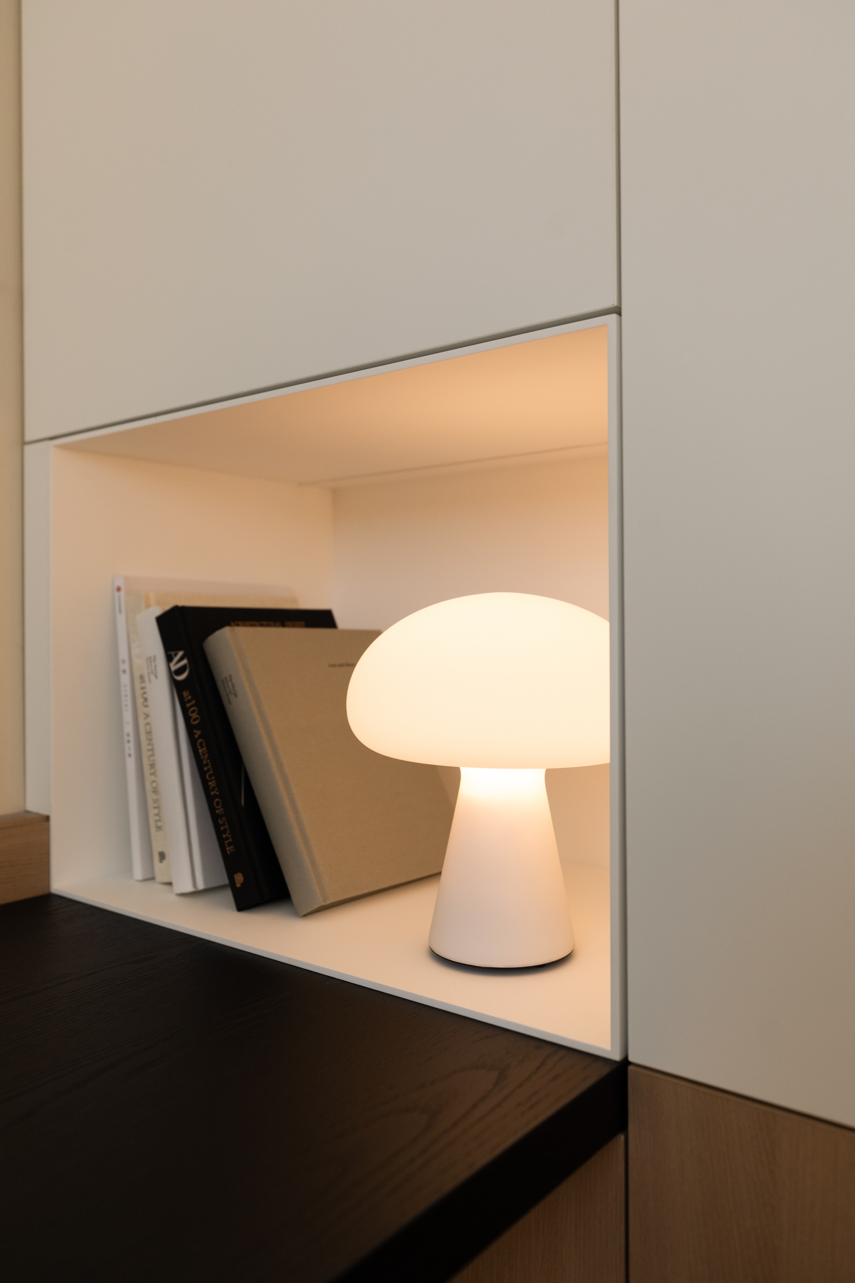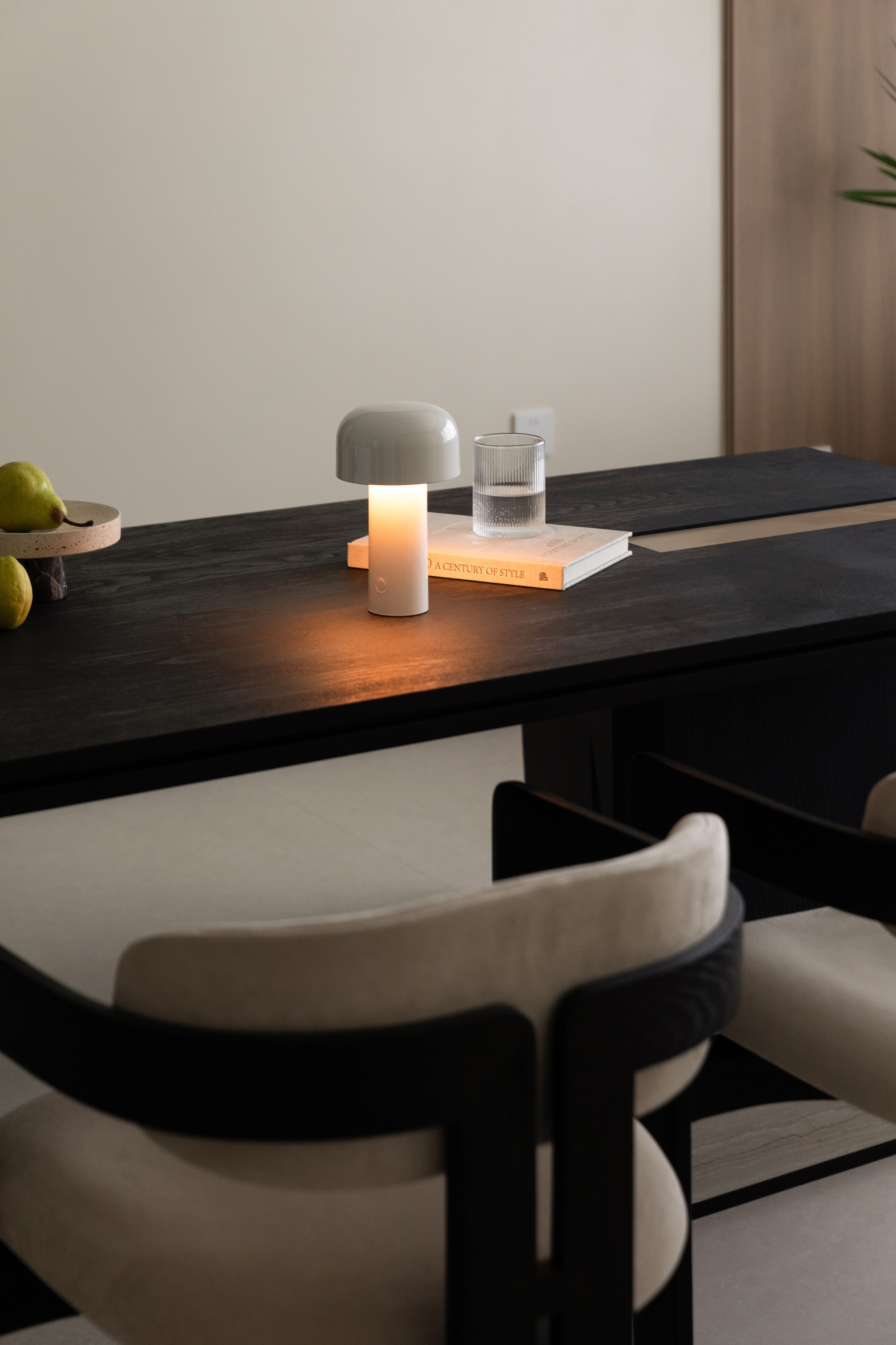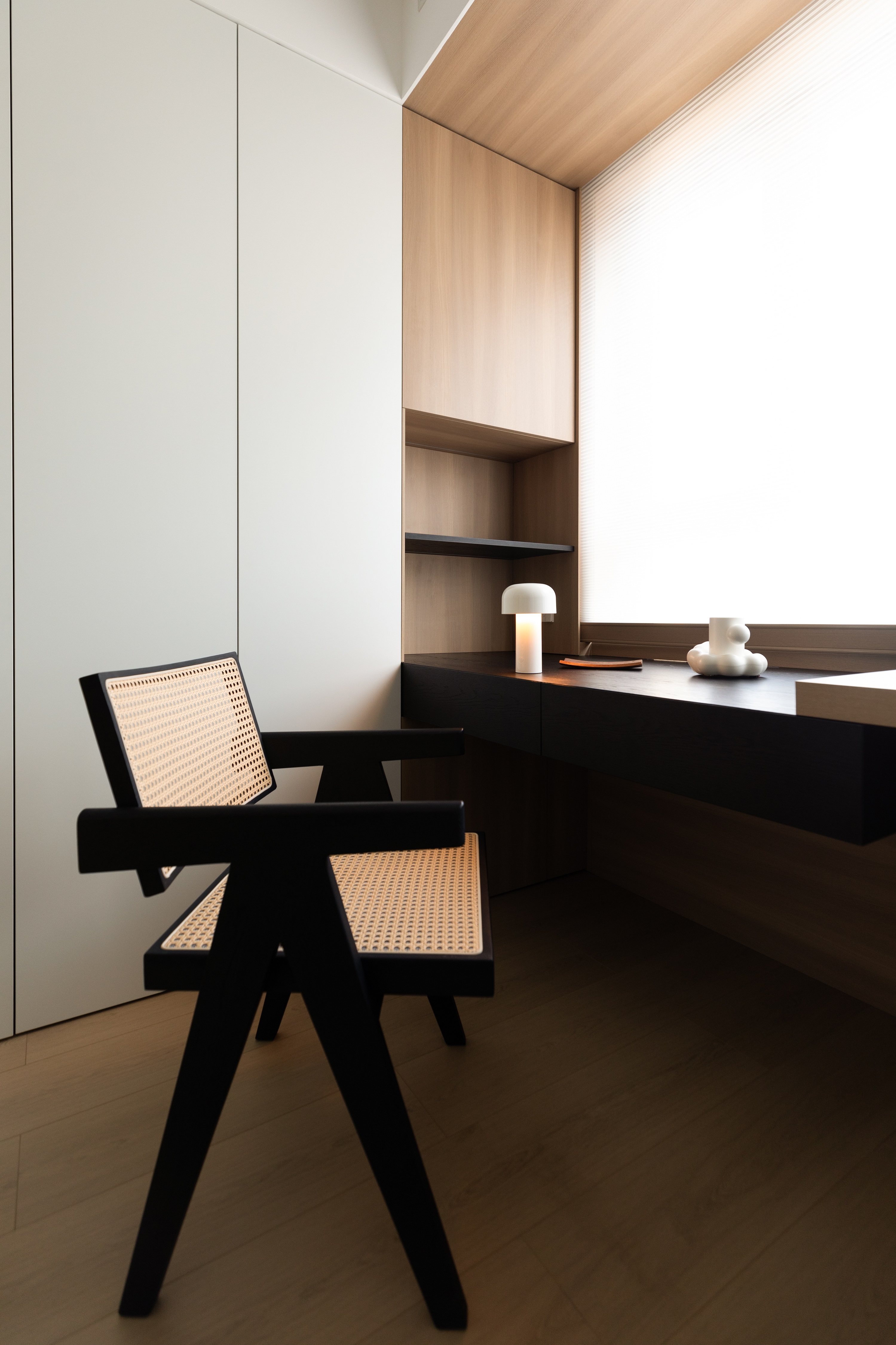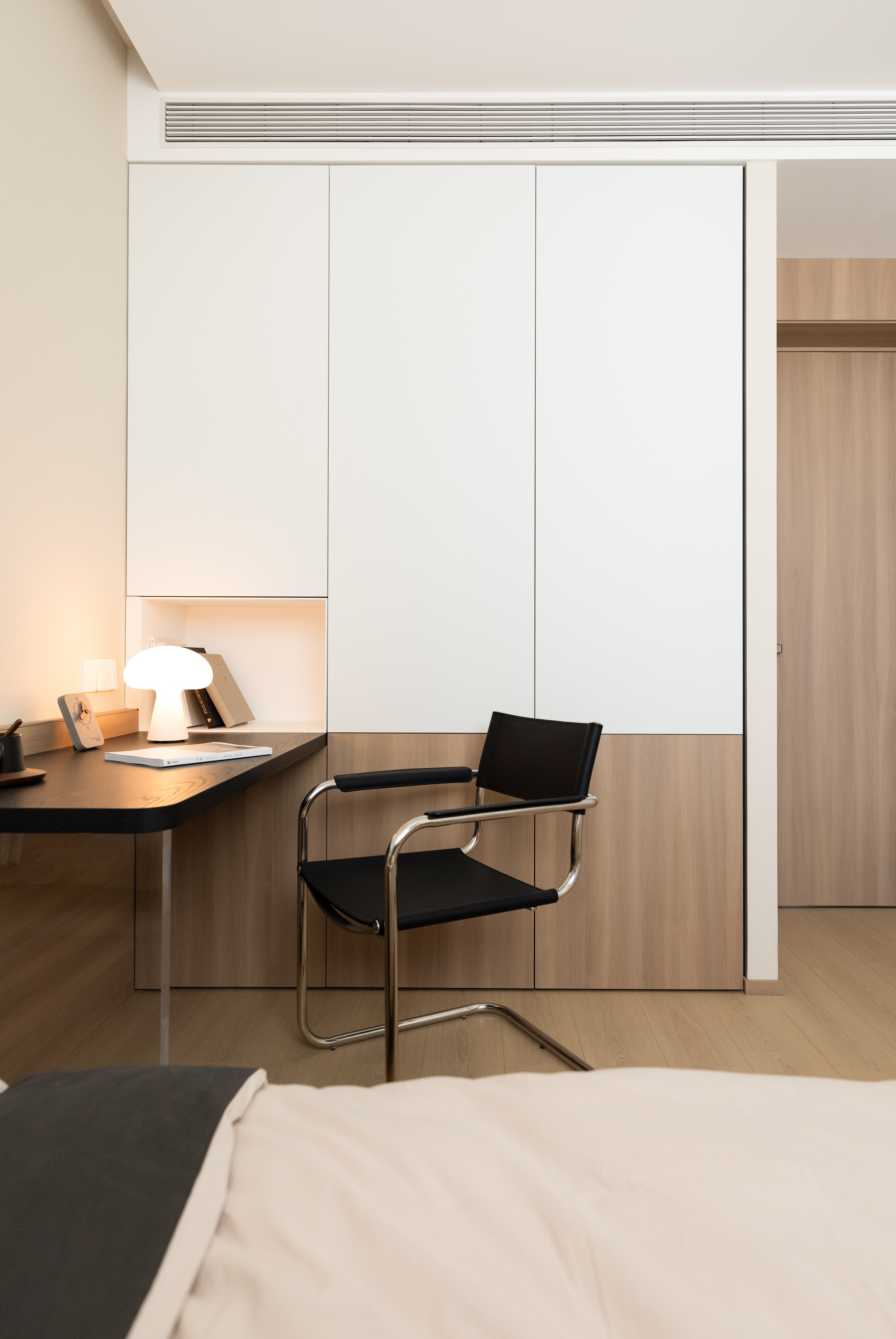 本案业主会在未来两三年后要宝宝,所以我们将次卧以「时间友好型过渡空间」为内核,以米杏墙布与原木基底构建温润场域,黑色家具以克制对比锚定极简秩序;当下,低饱和床品包裹休憩氛围,悬浮书桌与通高柜体形成 “轻办公 + 收纳” 系统,蘑菇灯暖光为阅读区晕染松弛感,环保耐磨材质与圆角细节,现阶段是品质表达,未来将成为安全屏障;几年后,无需结构变动,仅通过萌趣软装(如帐篷、手作陈列)与功能切换(书桌承接学习、柜体释放玩具收纳),即可自然转译儿童房属性,让空间如 “时间容器”,从容衔接现在与未来的使用场景 。