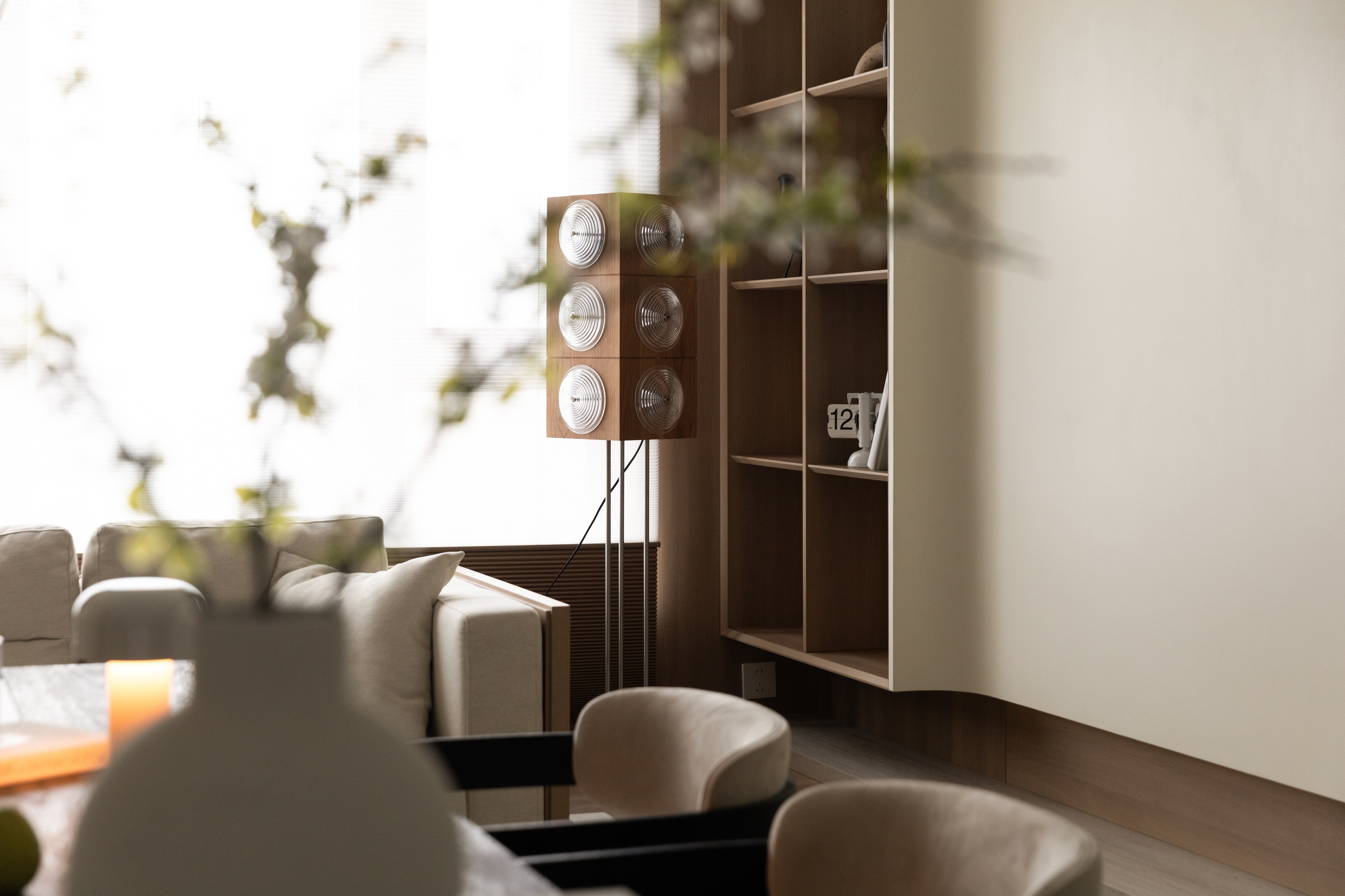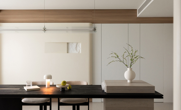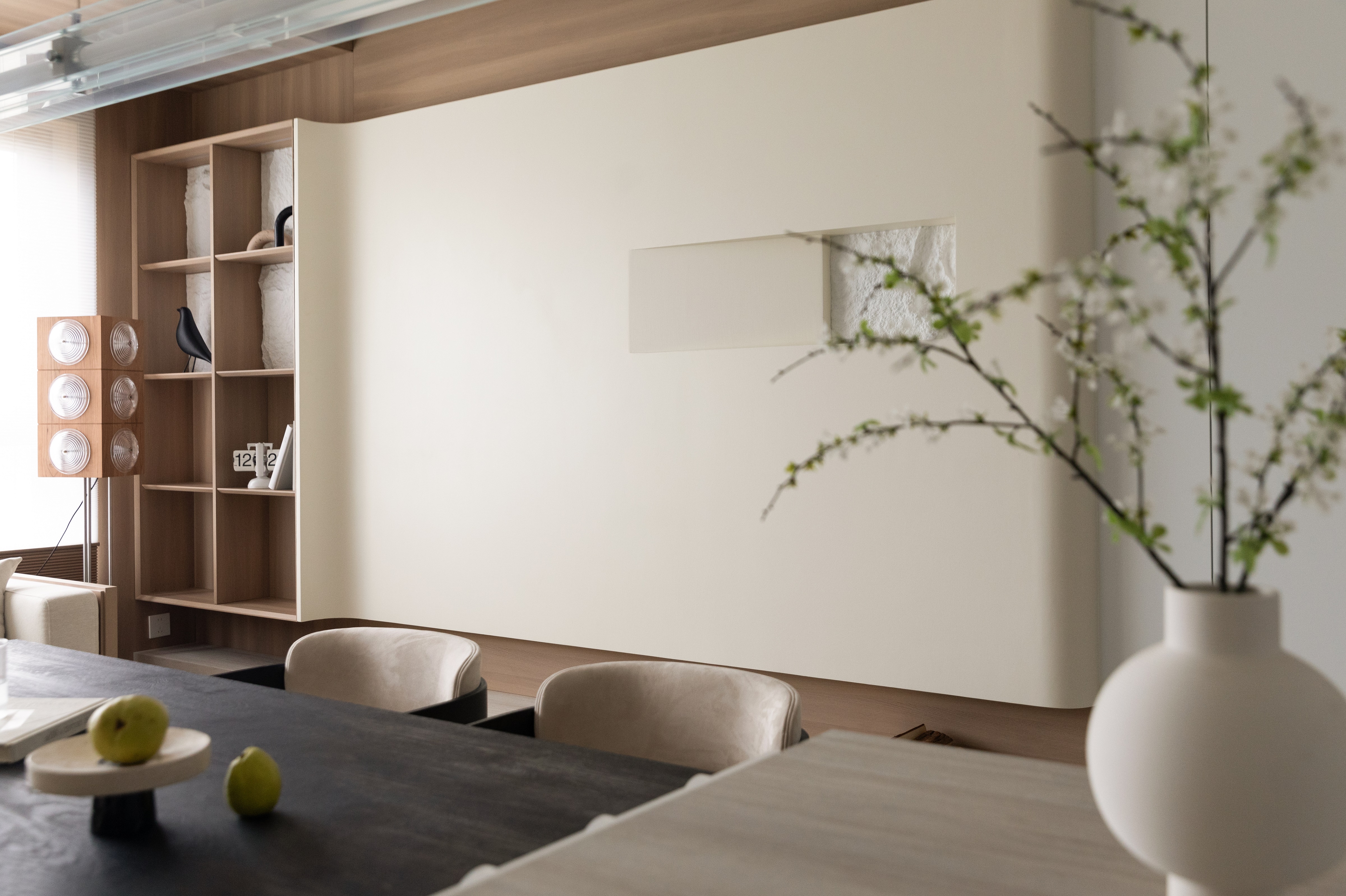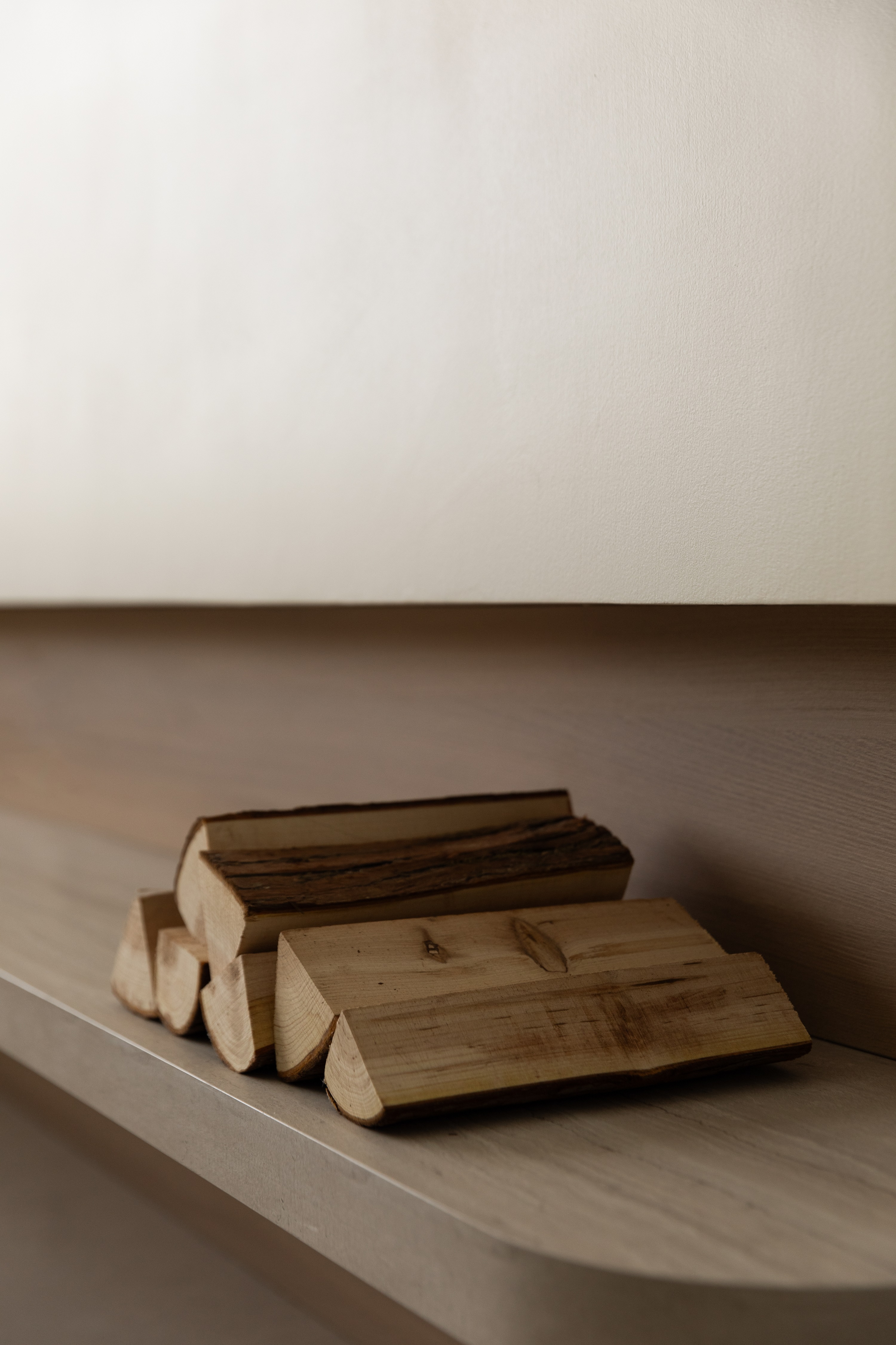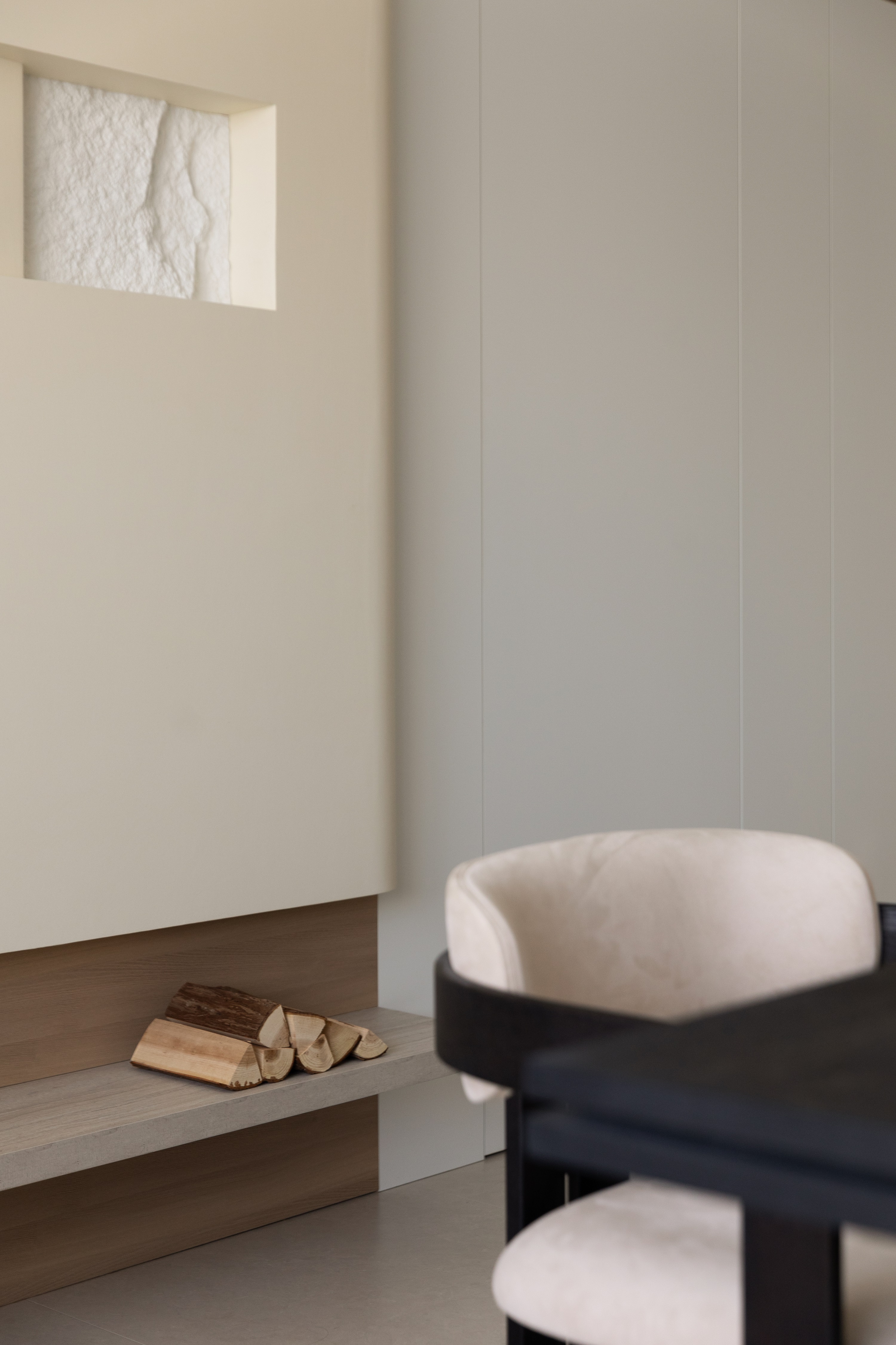 以克制的姿态呼应空间调性;墙面嵌入式石材、原木搁架的柴火陈列,更添简约式「素净秩序感」。整体以 「减法设计」 为核,让质朴材质在留白中对话,家具在秩序里舒展,诠释当代人居的素净与精致。