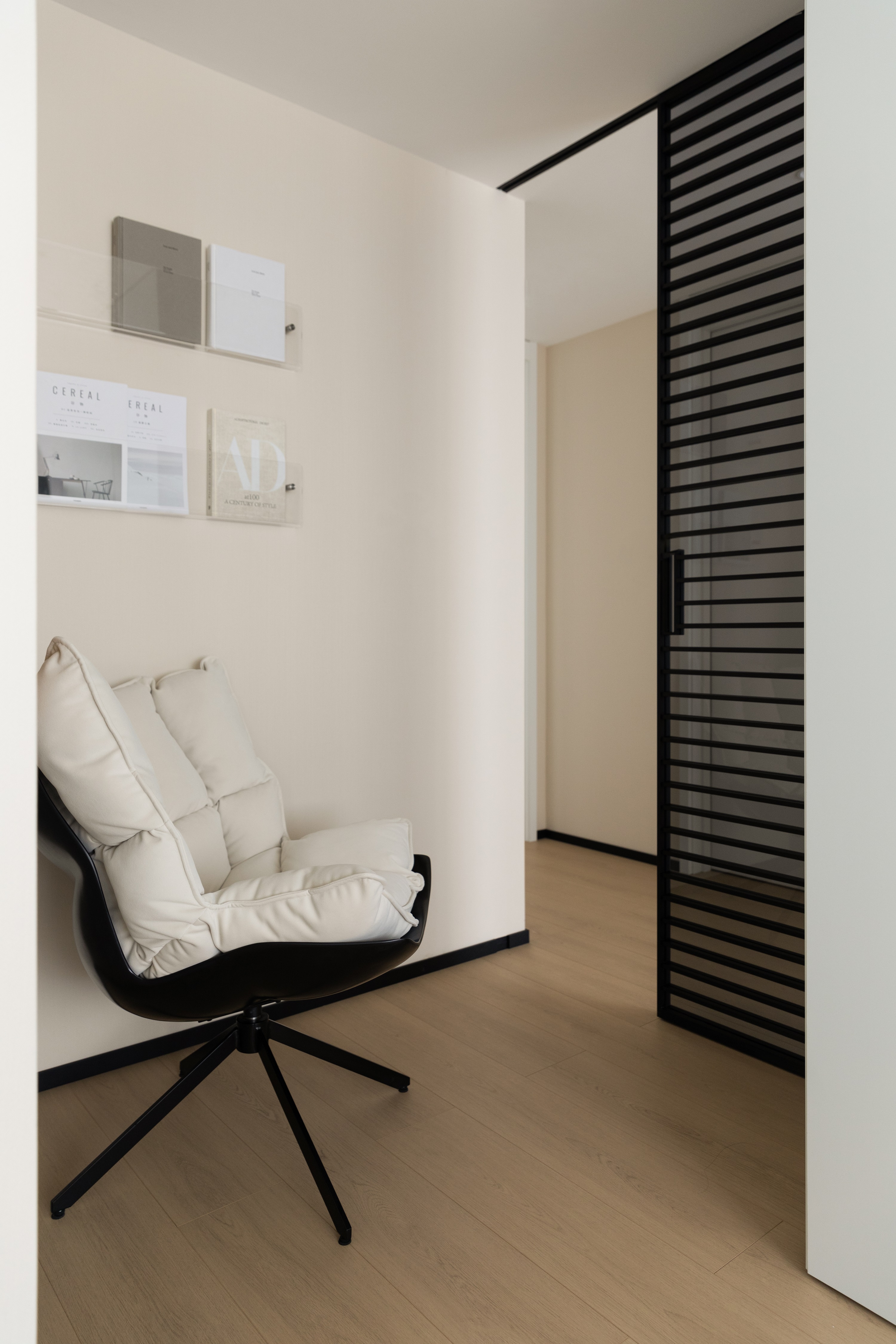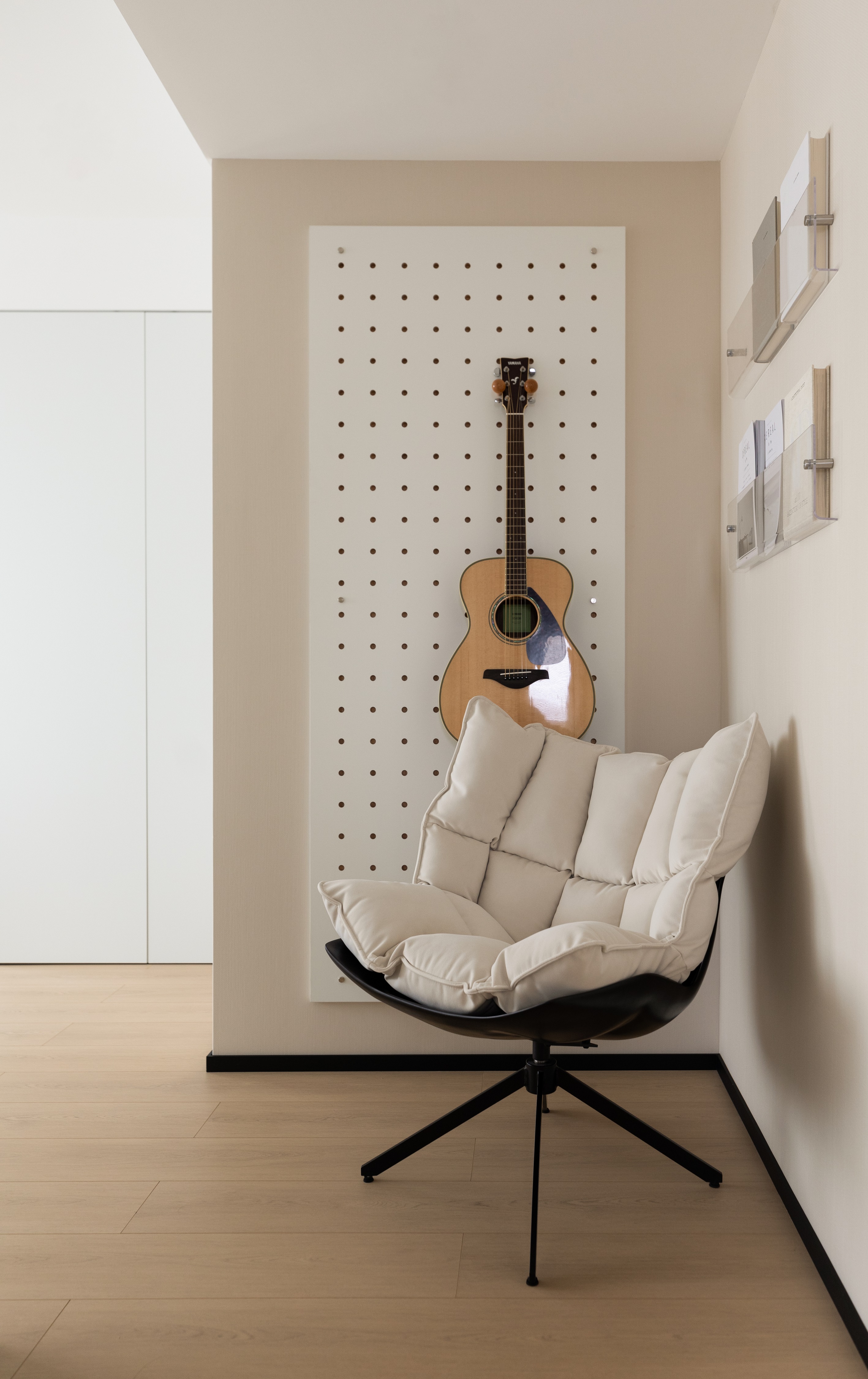 衣帽间在极简主义的语境中,以米白、木色与黑色构建静谧底色,通过功能与形式的互融,演绎生活的诗意表达。标志性单椅以几何框架承载柔软坐感,刚柔并济。一侧,透明展示架将刊物化作流动展品;转译间,洞洞板又赋予乐器陈列的艺术张力,日常物件挣脱实用桎梏,成为空间的叙事符号。材质间的对话(木之温润、金属之俐落、亚克力之通透),与留白的克制,共同勾勒出兼具秩序与温度的当代角落,让每一处陈设都成为功能与美学的共生载体 。