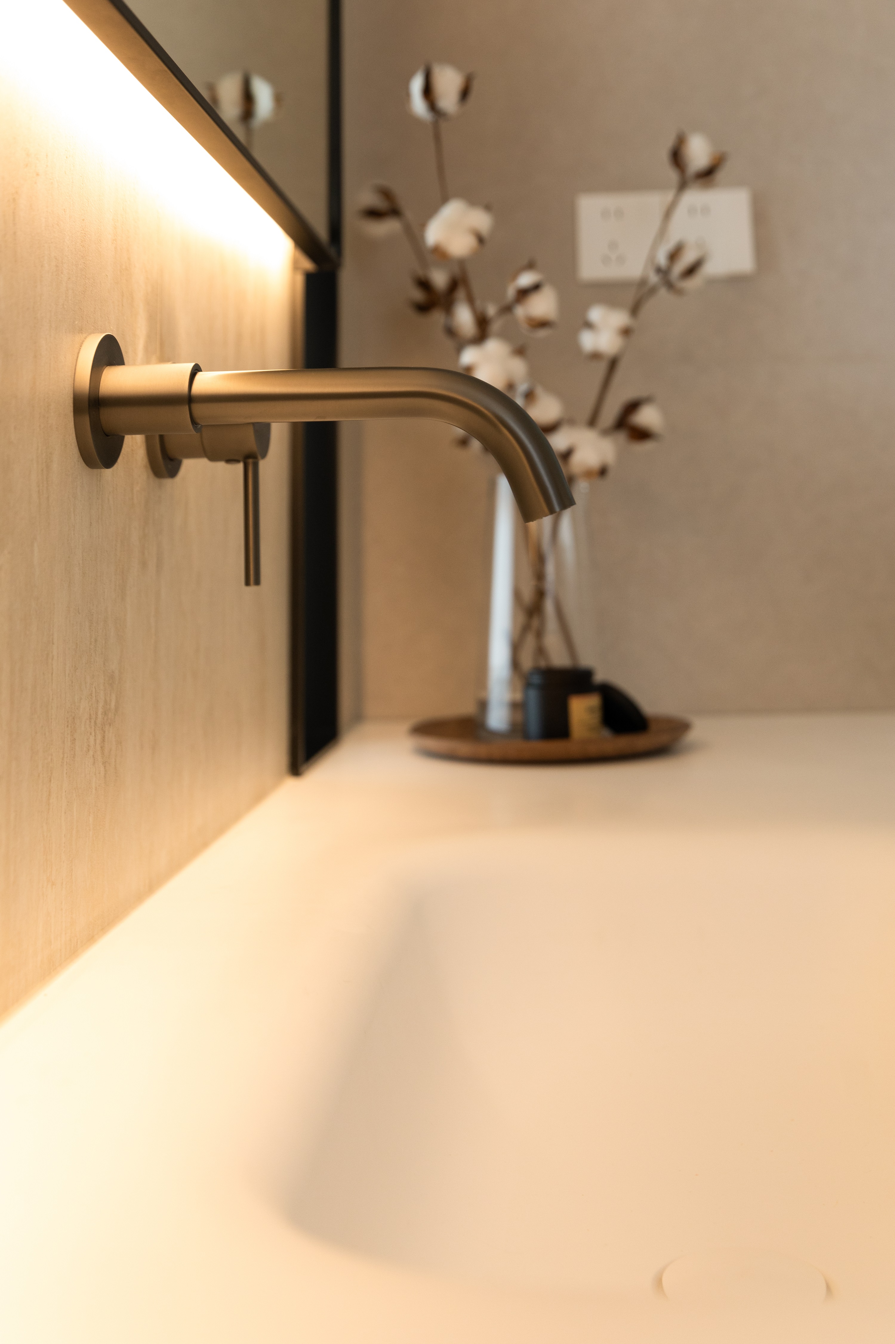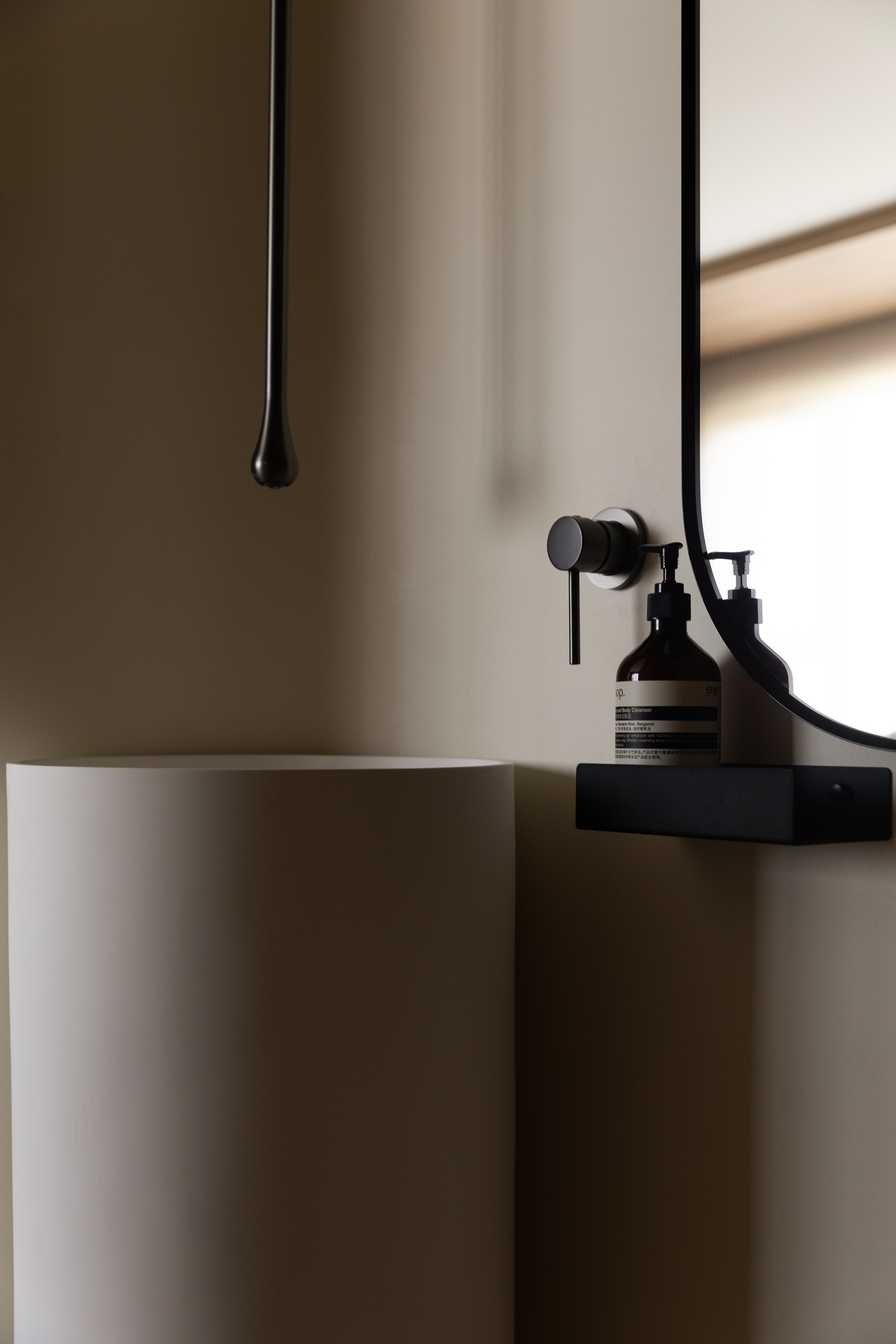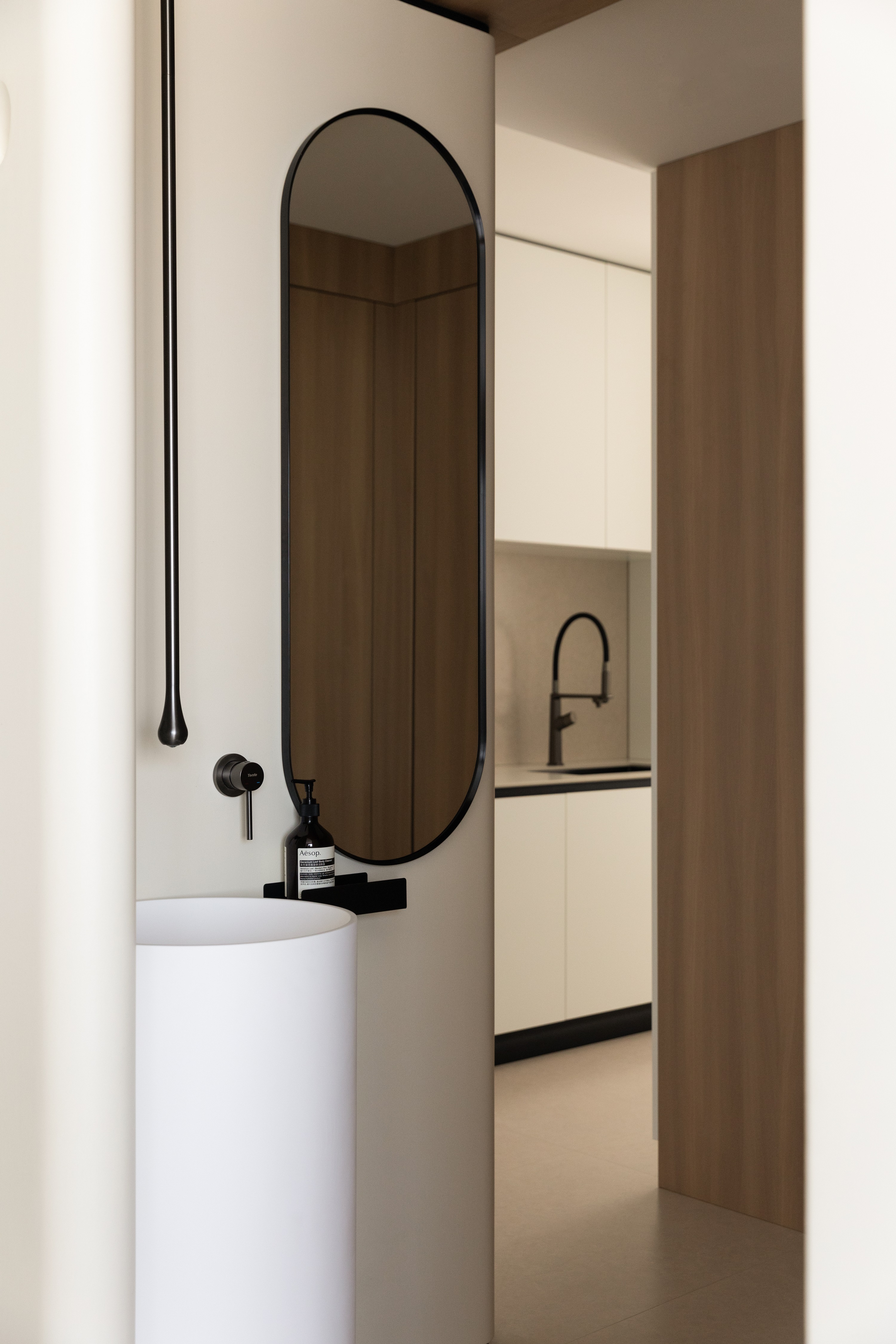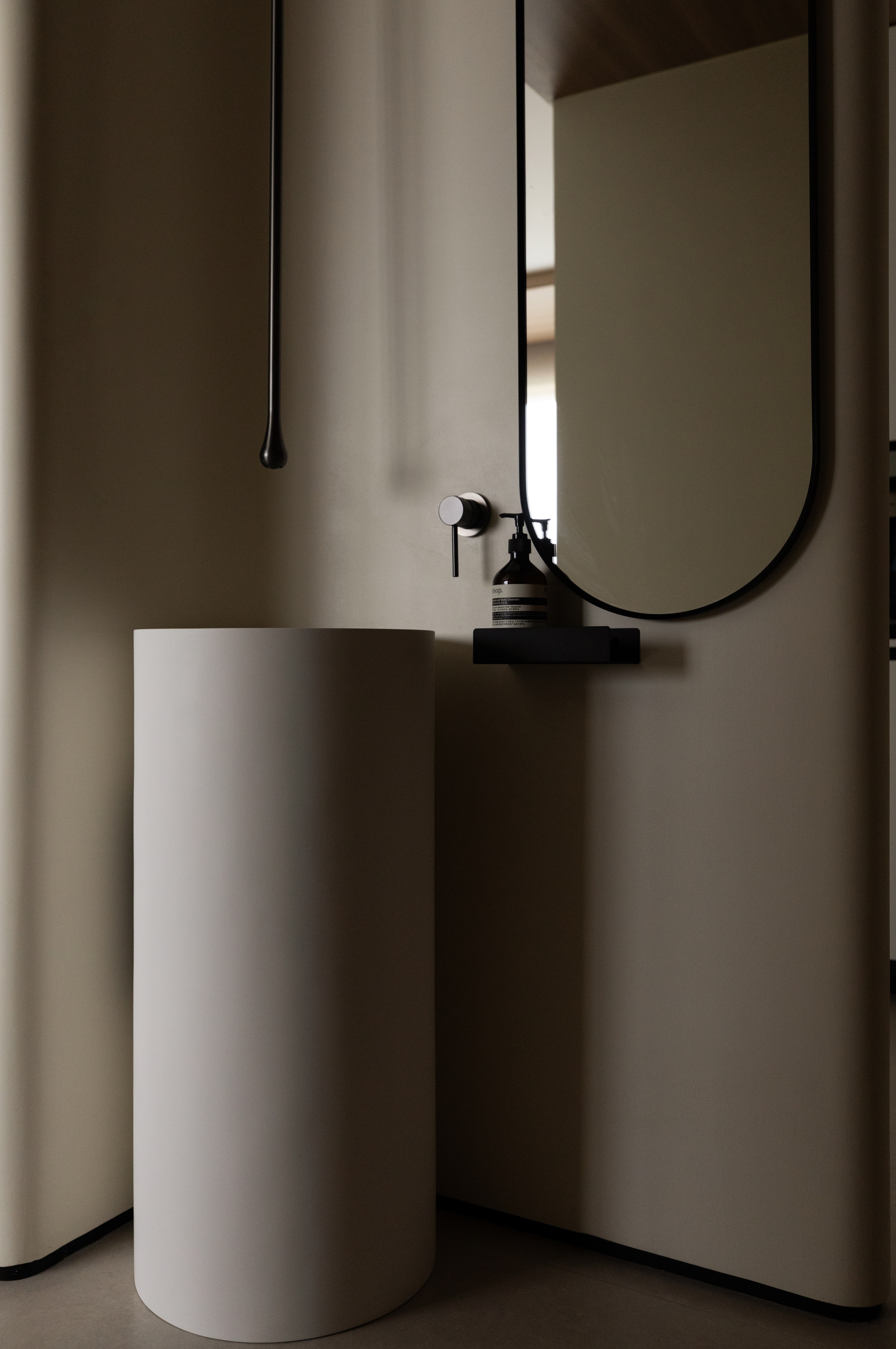 暖柔米白基底碰撞深黑金属构件,借明暗层次晕染克制高级感,圆柱洗手台的圆润、弧边镜的流畅与黑色哑光金属的垂坠龙头,柔化空间棱角,置物架以极简轮廓承载实用、消弭设计与生活的边界,更通过开放式衔接打破场域壁垒,让质朴材质与凝练设计共释当代松弛感,于 “减法” 逻辑中寻得质感与温度的平衡。