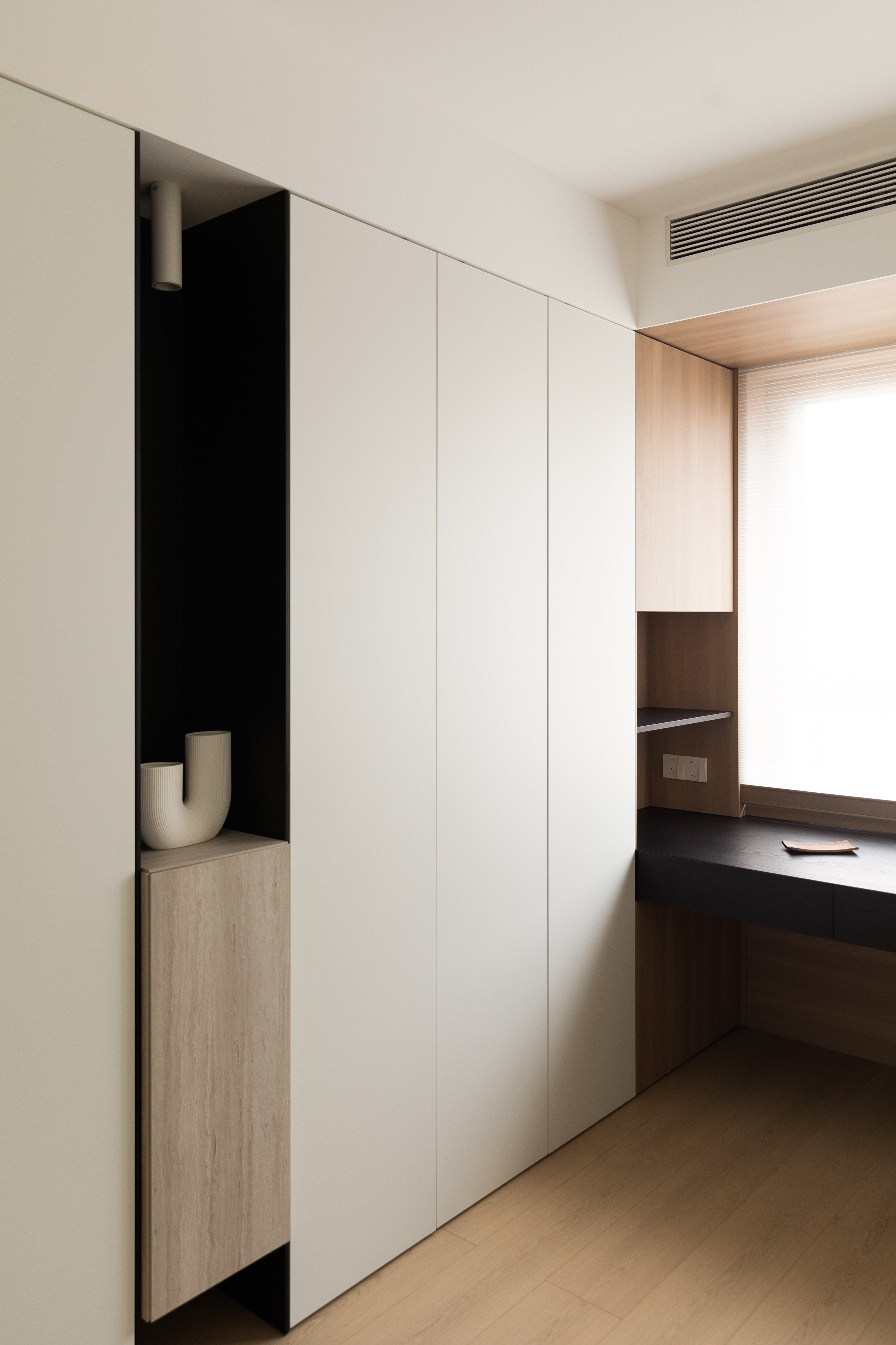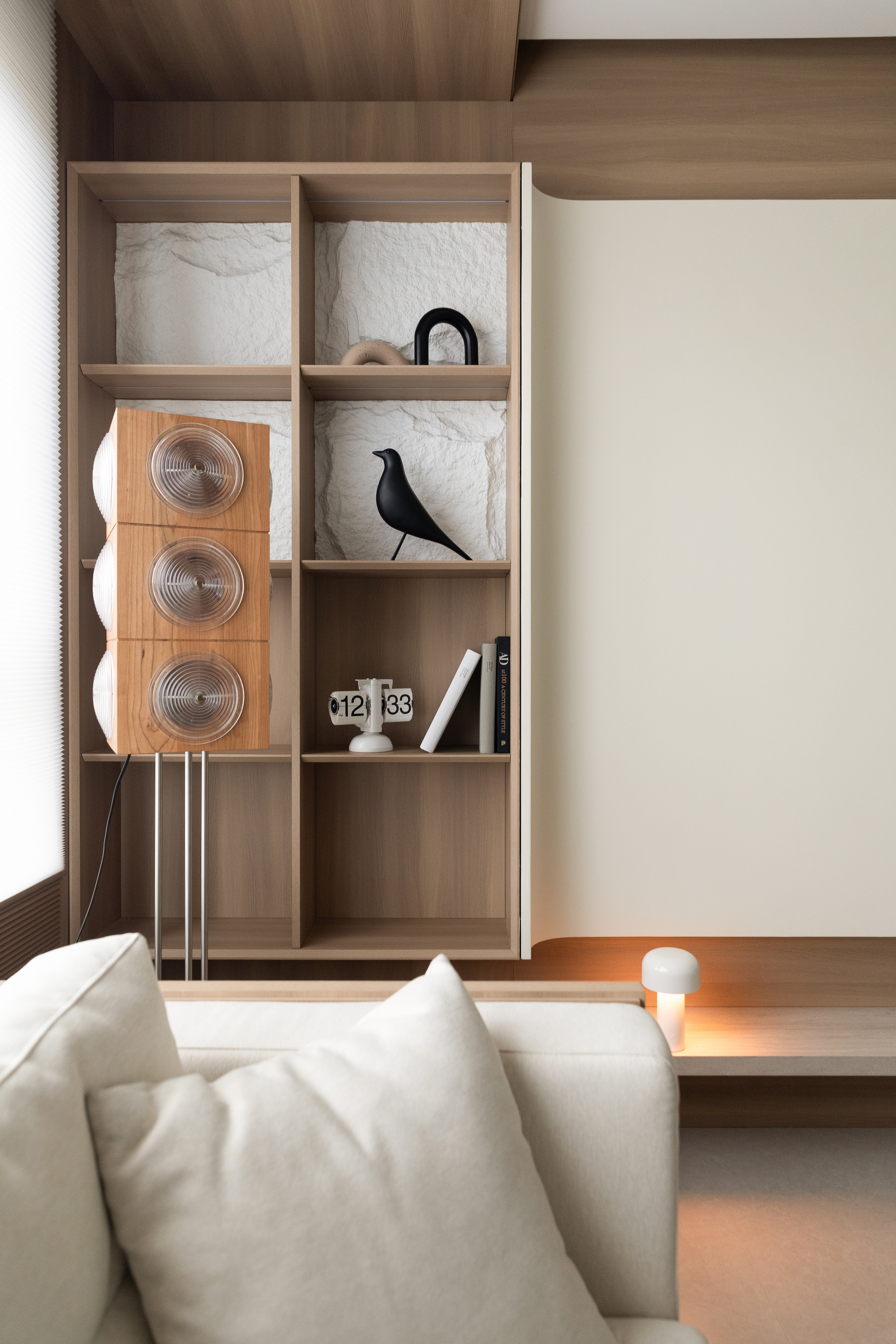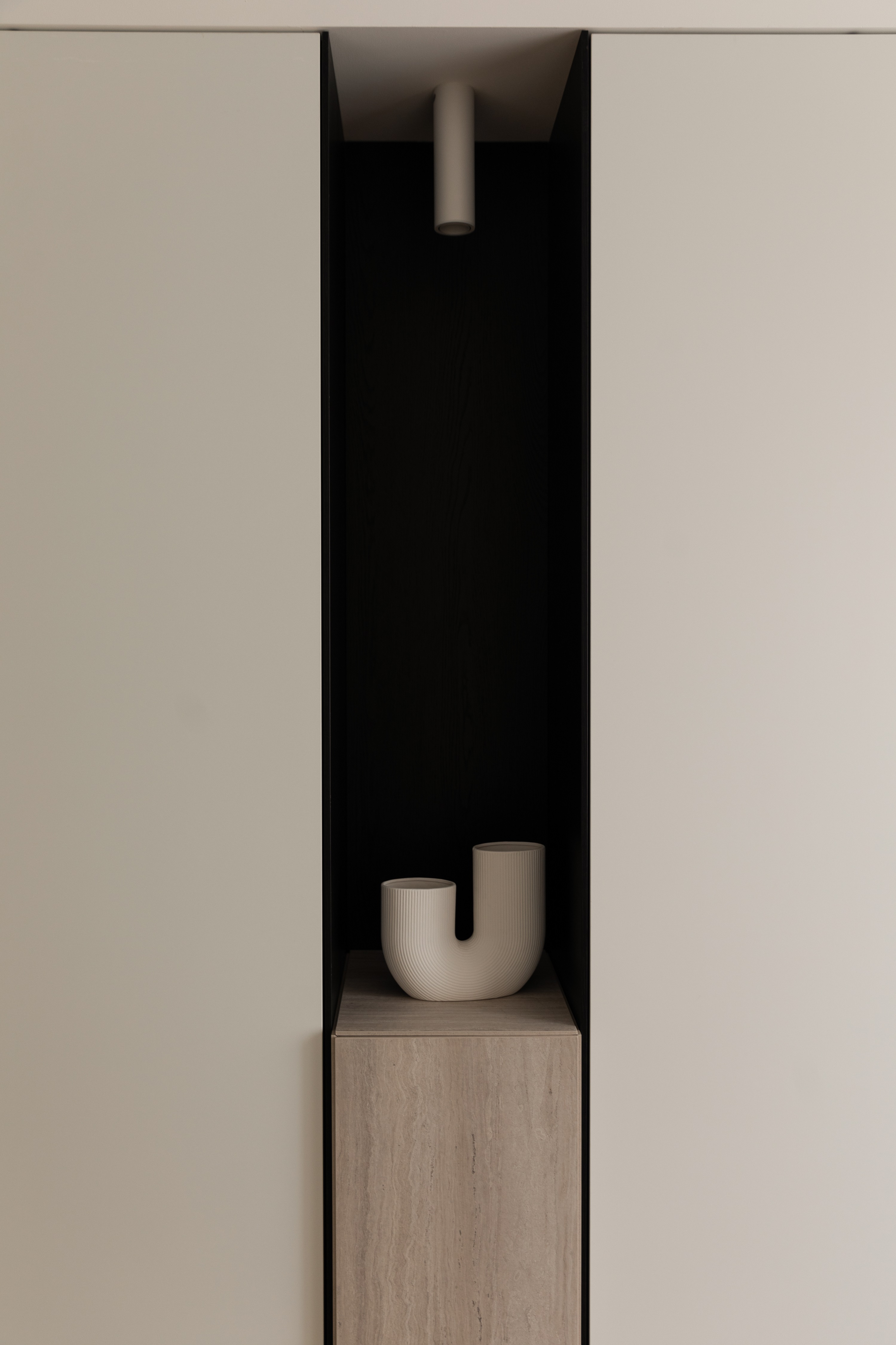 嵌入式暗龛以黑为底,洞石基座托举素白饰品,明装筒灯垂照,于柜体缝隙间,凝萃克制的仪式感 。