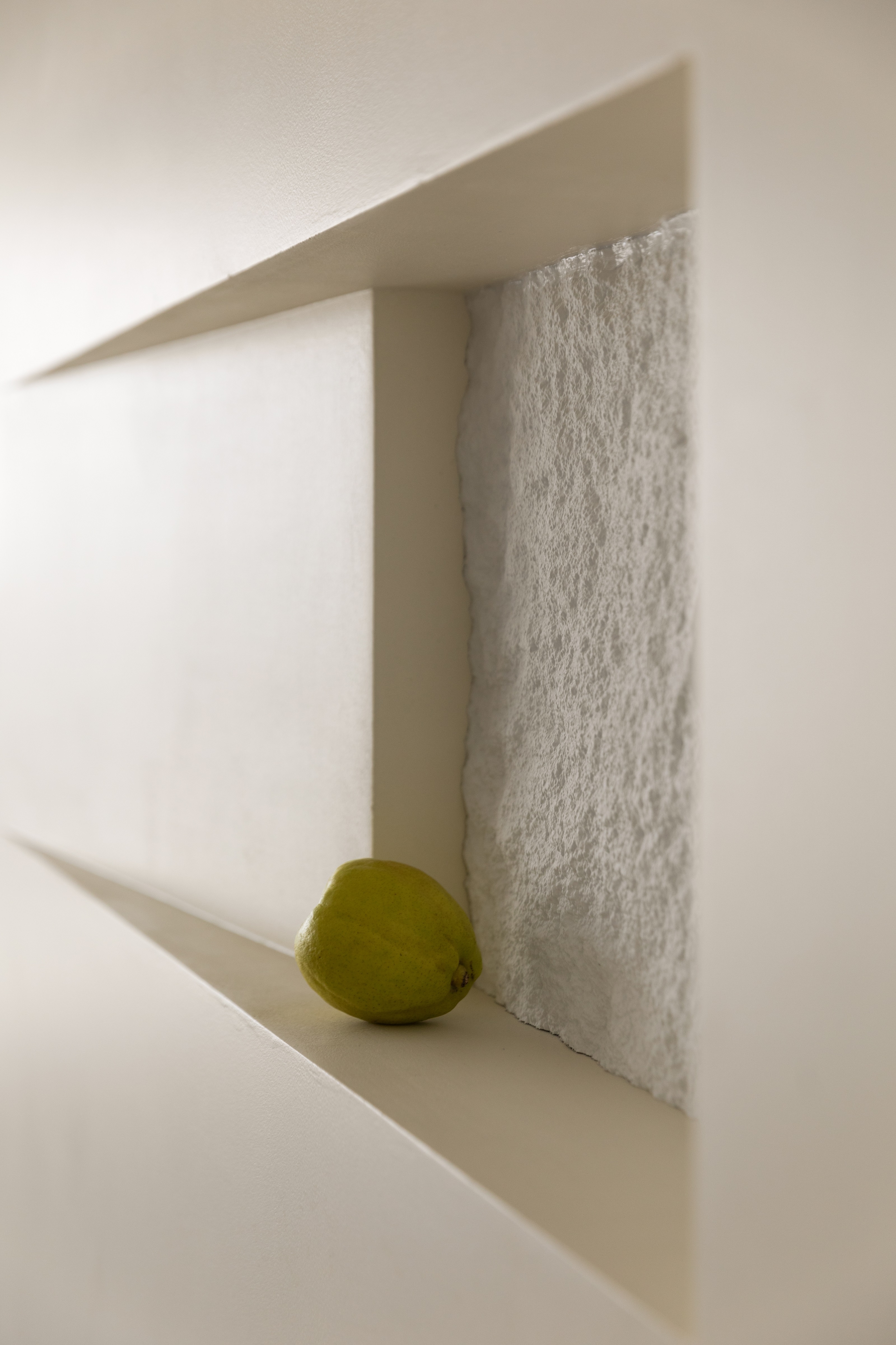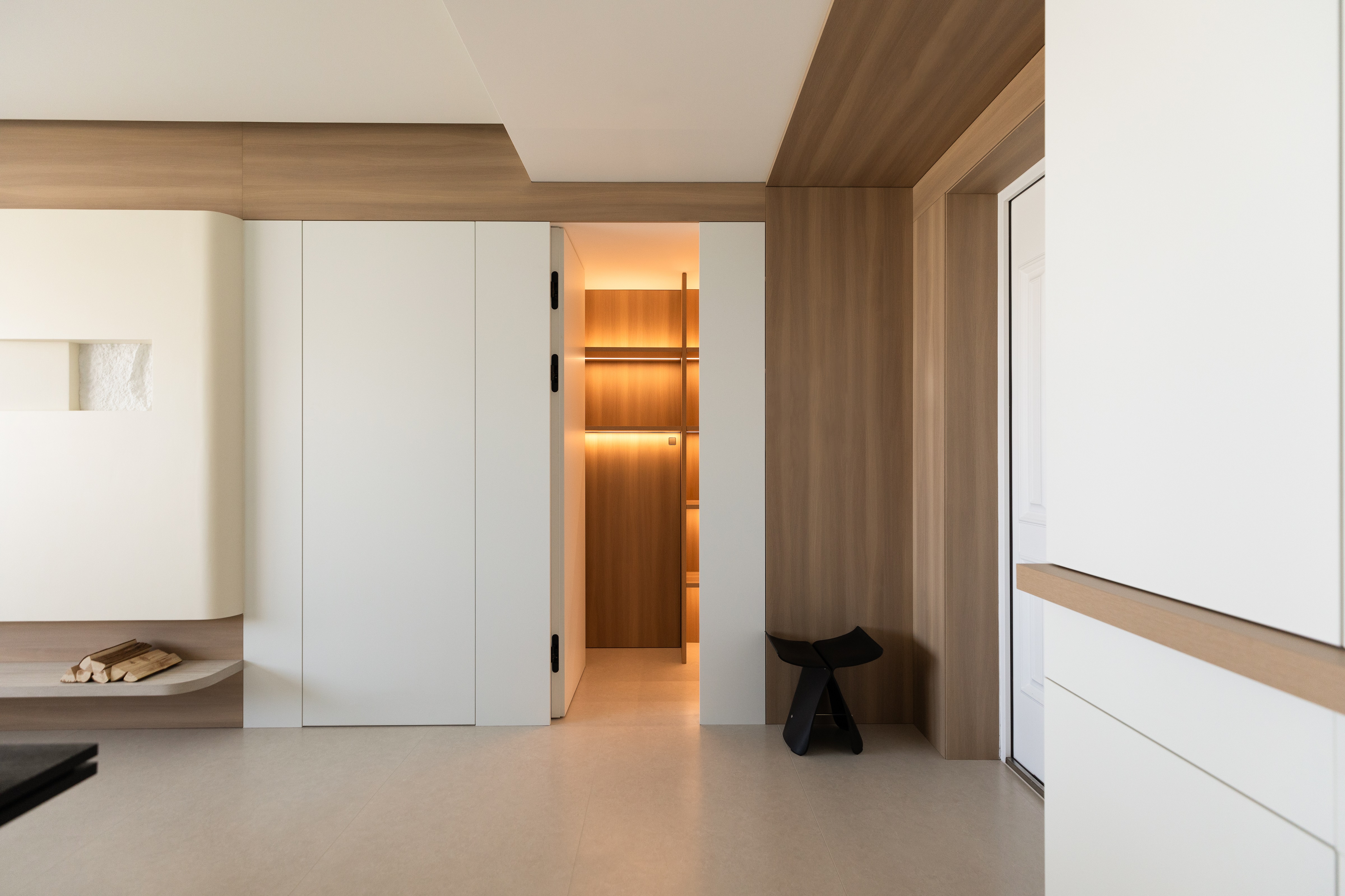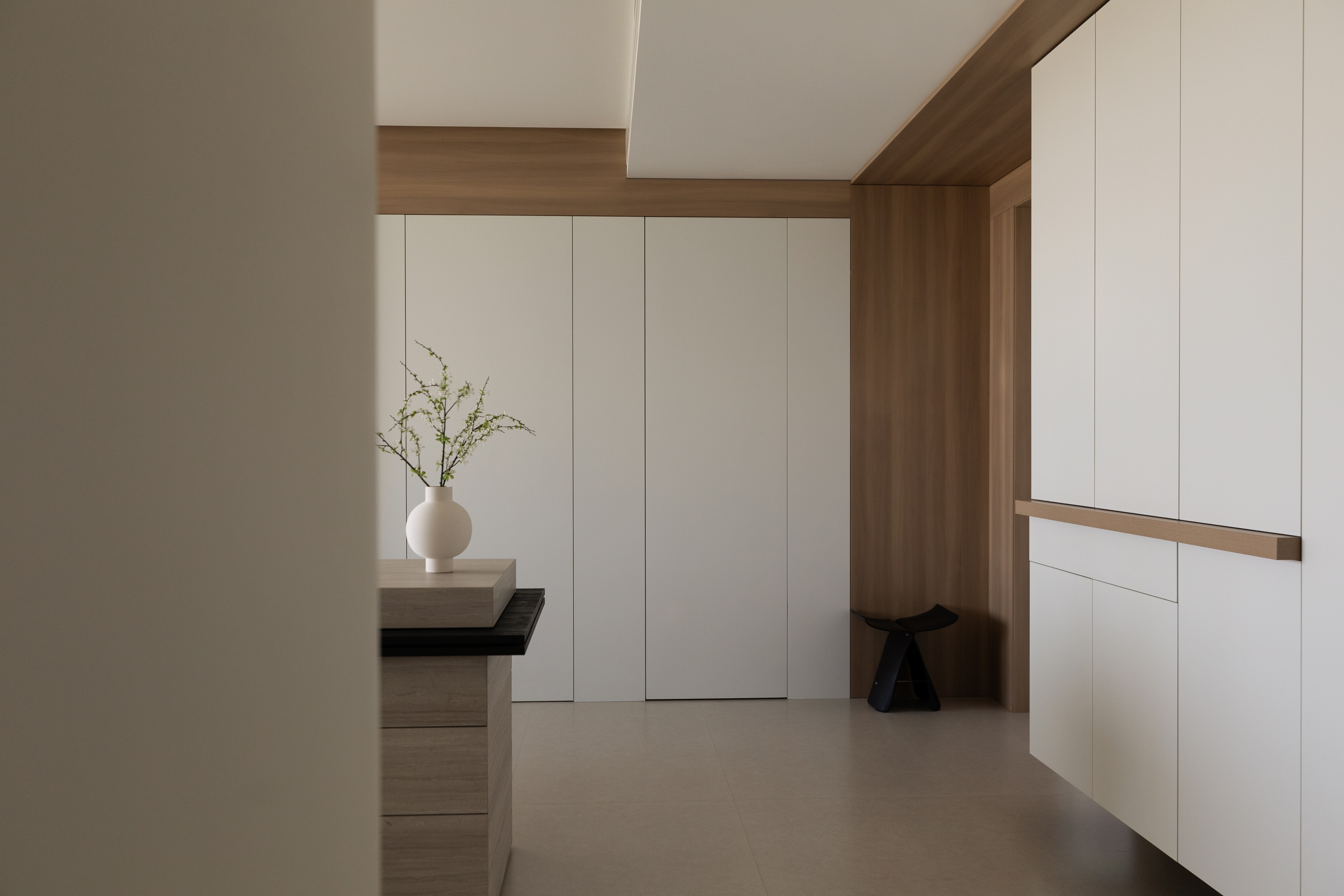 嵌入式暗龛以黑为底,洞石基座托举素白饰品,明装筒灯垂照,于柜体缝隙间,凝萃克制的仪式感 。
