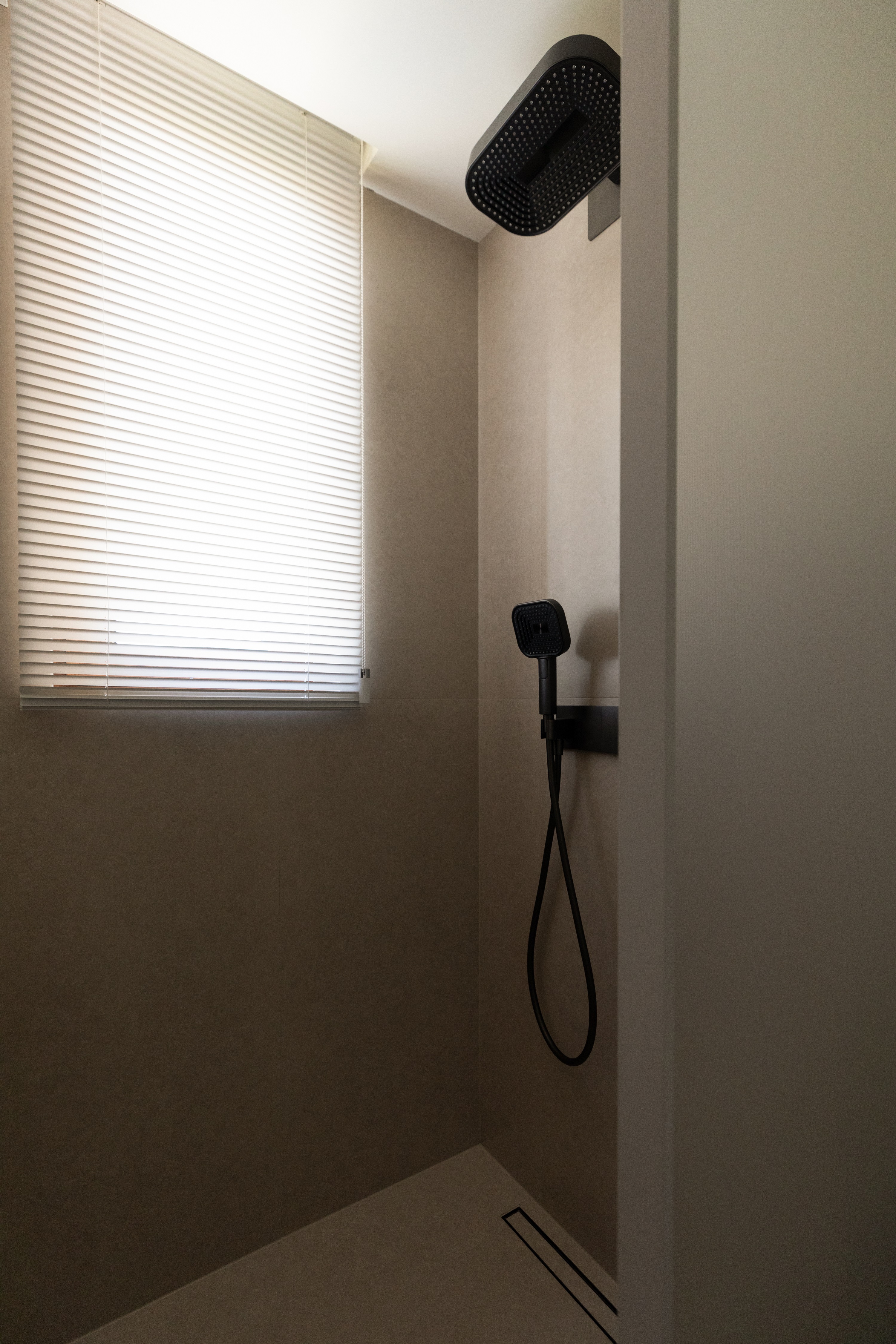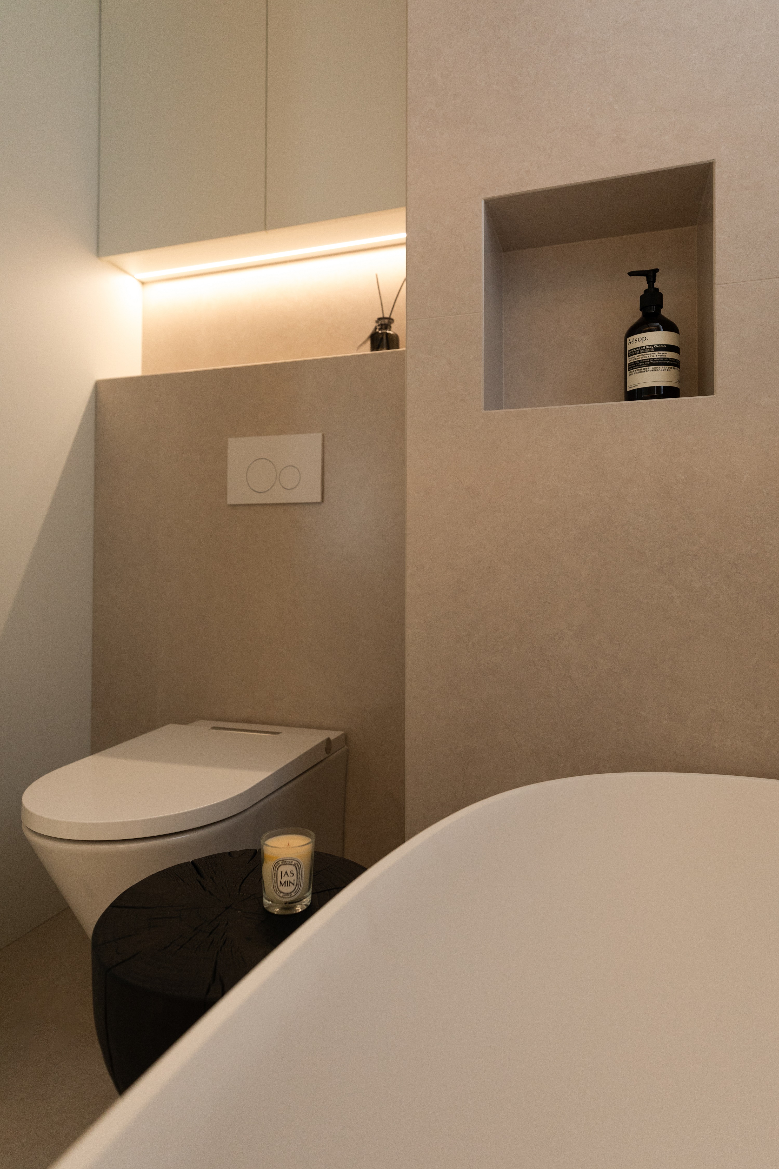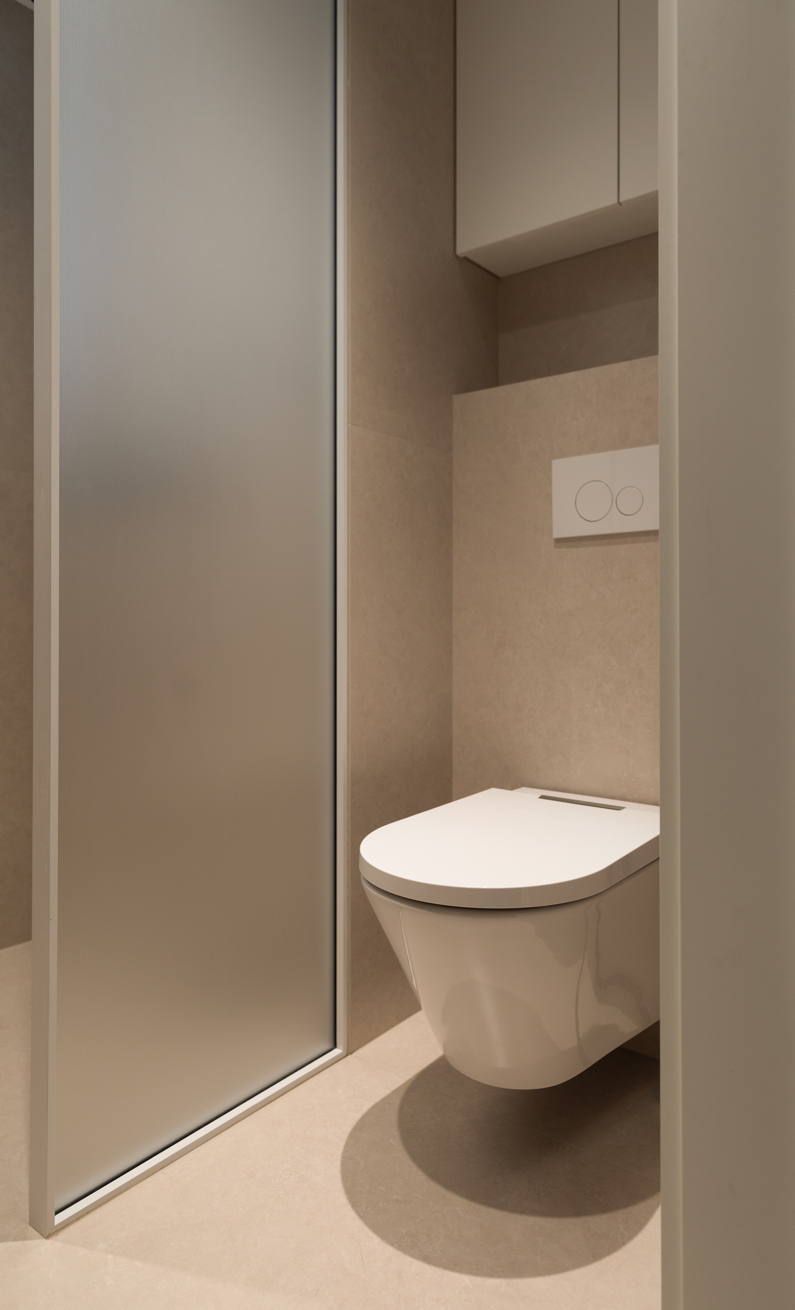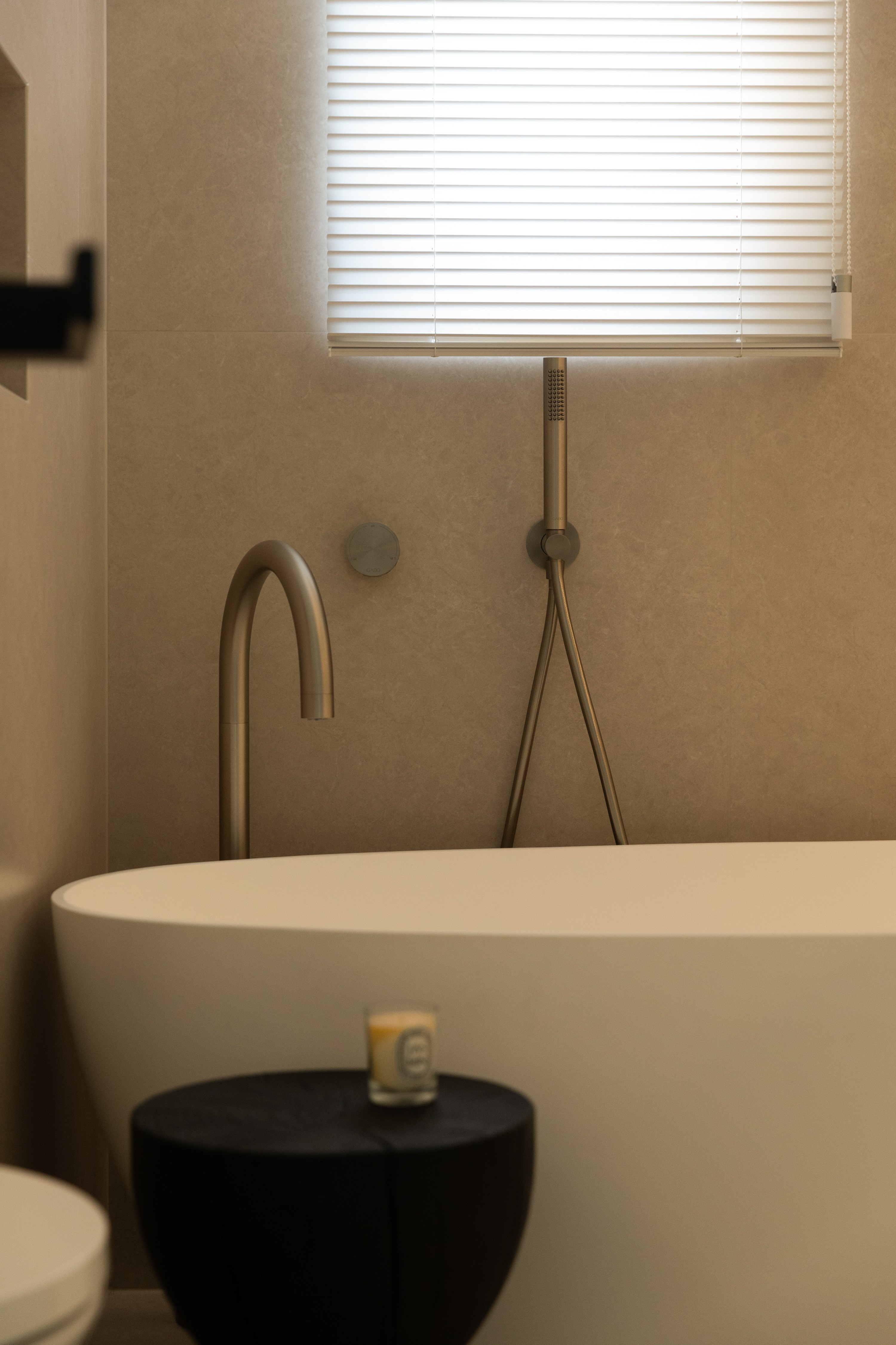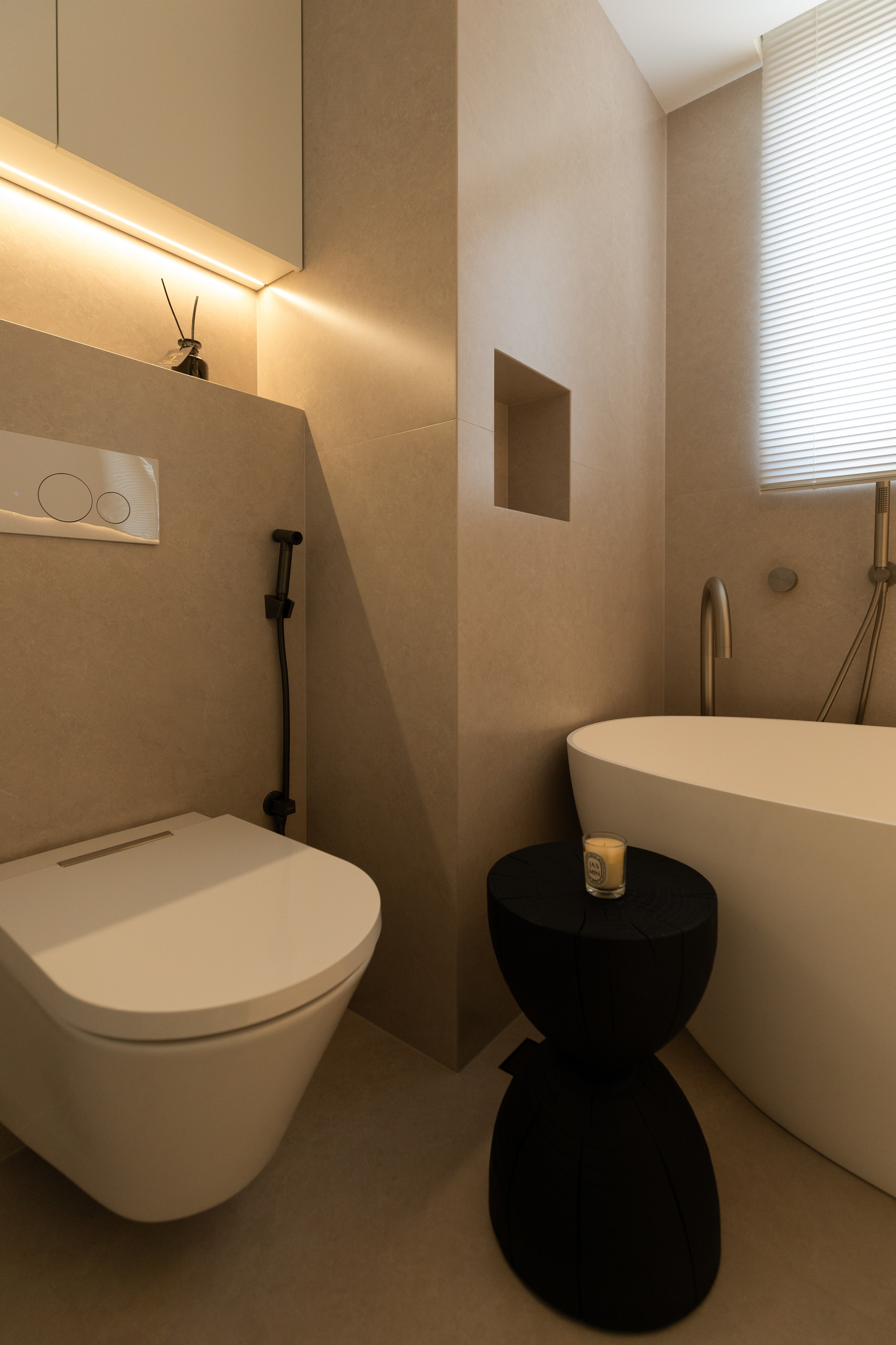 嵌入式壁龛藏纳秩序,黑色边几与香薰、干花交织层次;浴缸临窗而立,百叶滤入柔光,让沐浴成为沉浸式感官休憩。墙排马桶隐于墙侧,功能与美学共生,每处细节皆锚定舒适与格调的平衡,诠释当代私域的奢适哲学。