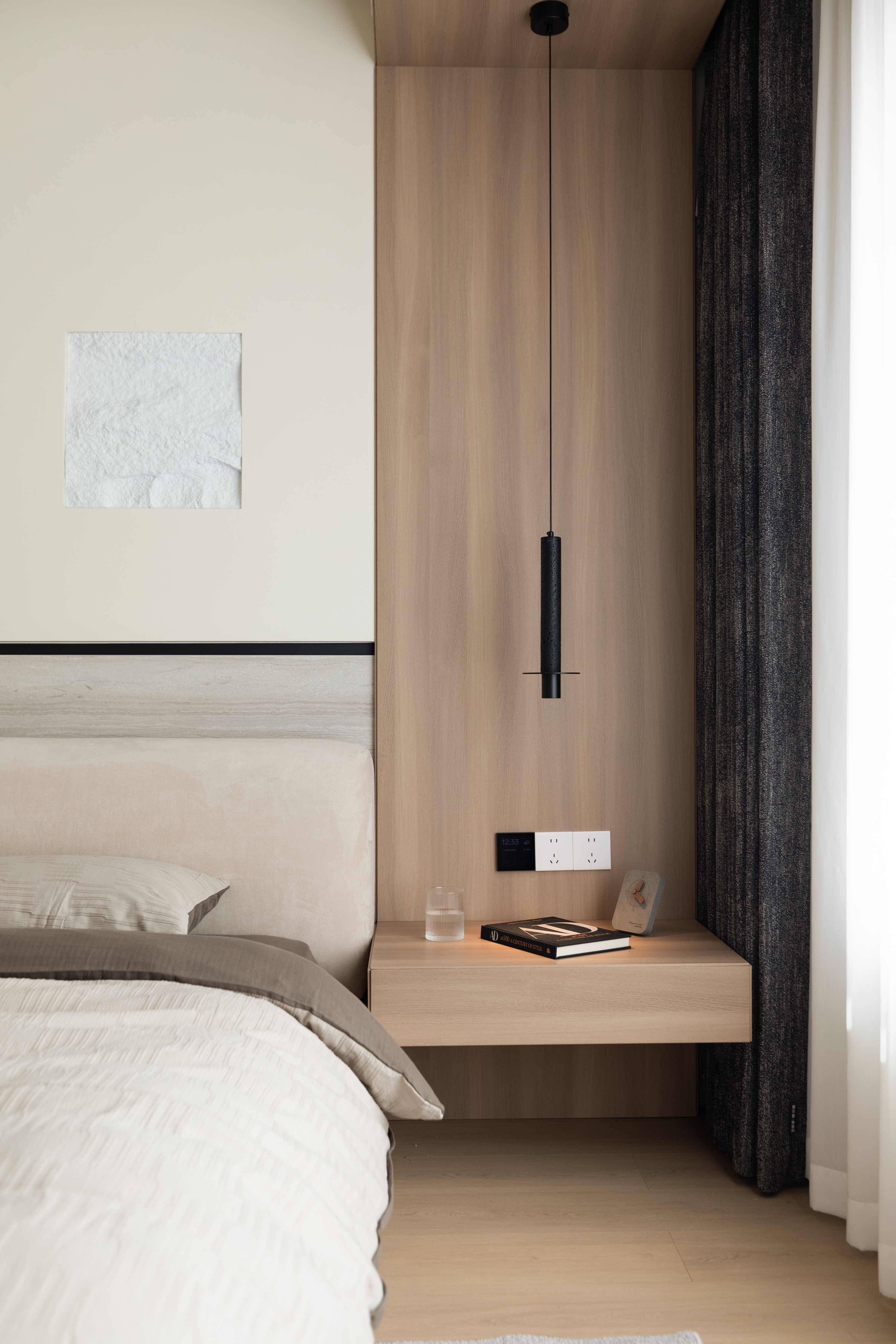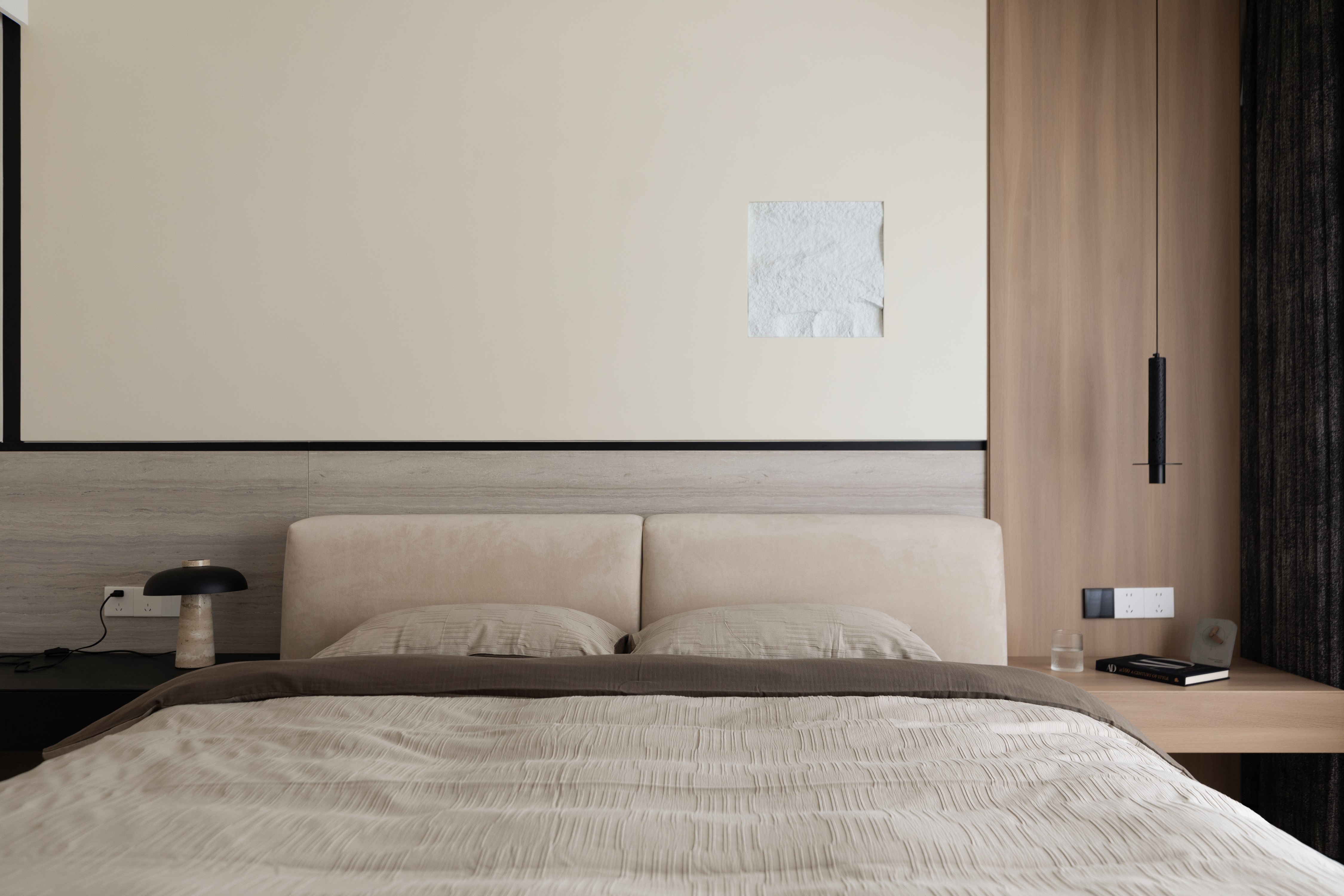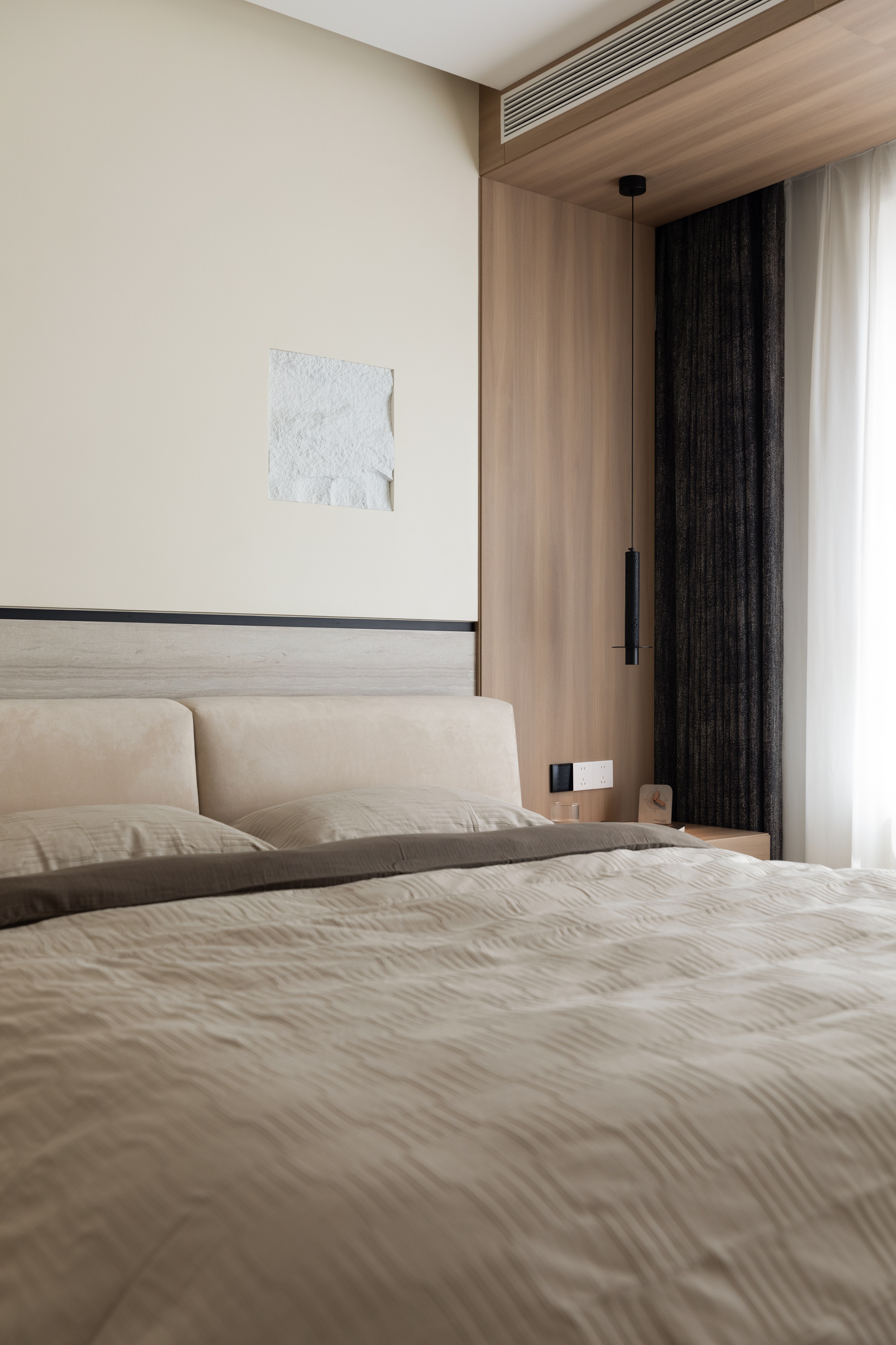 主卧以米杏系为底色,糅合绒面、木作与石纹肌理,营造温润静谧氛围。悬浮 bedside 不对称布局,黑色线条勾勒利落轮廓,灯具与陈设隐于秩序,以简素笔法诠释当代休憩场域的高级质感 。