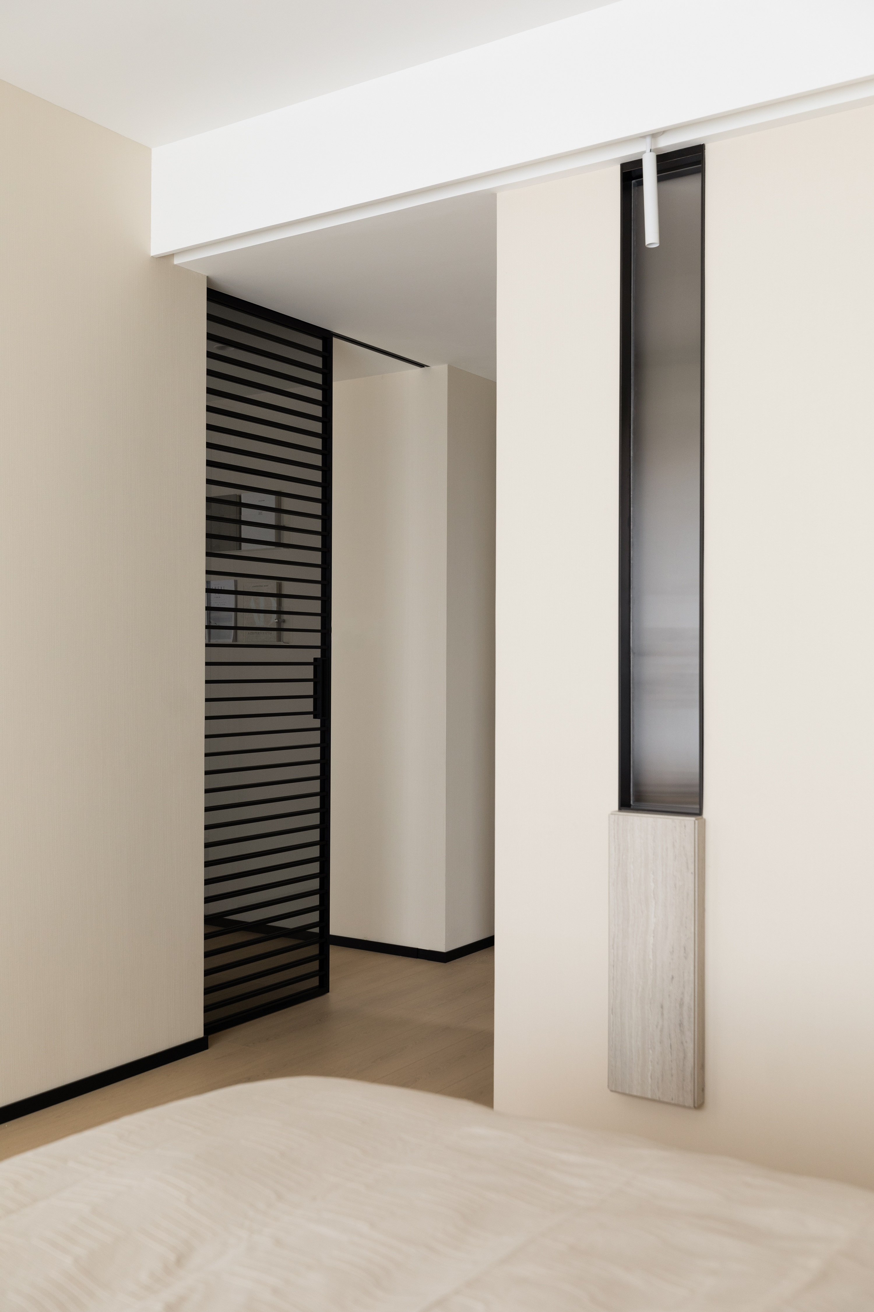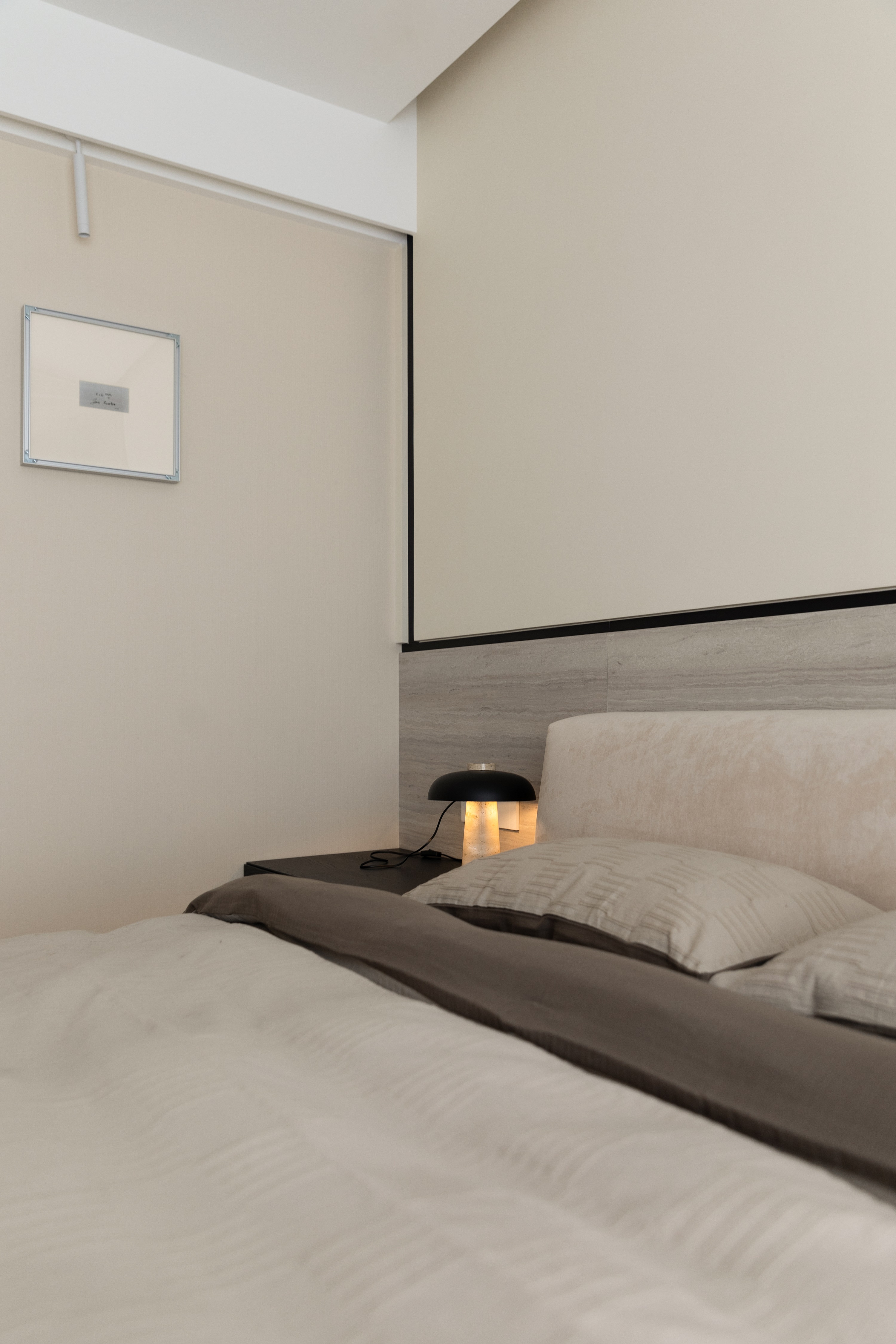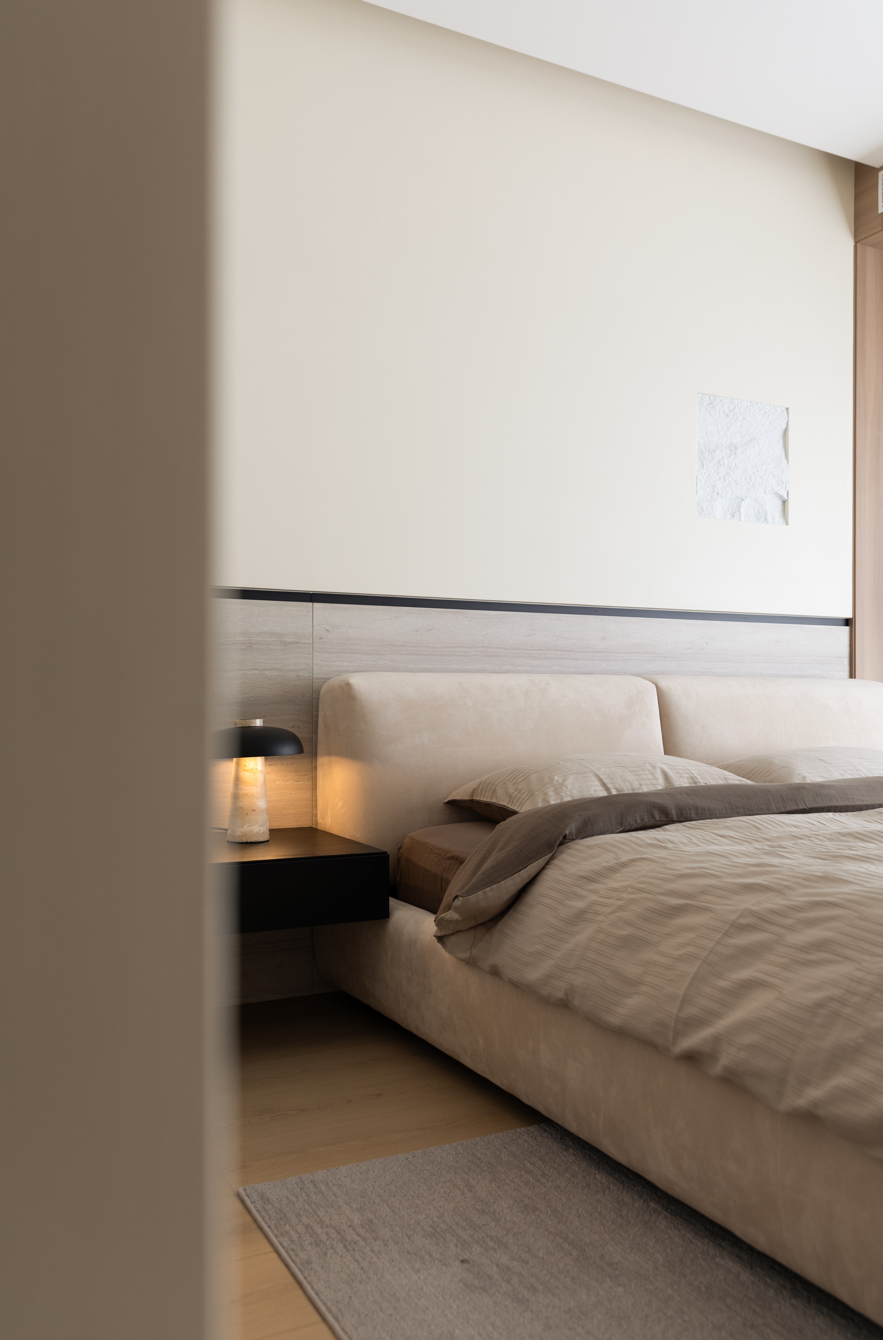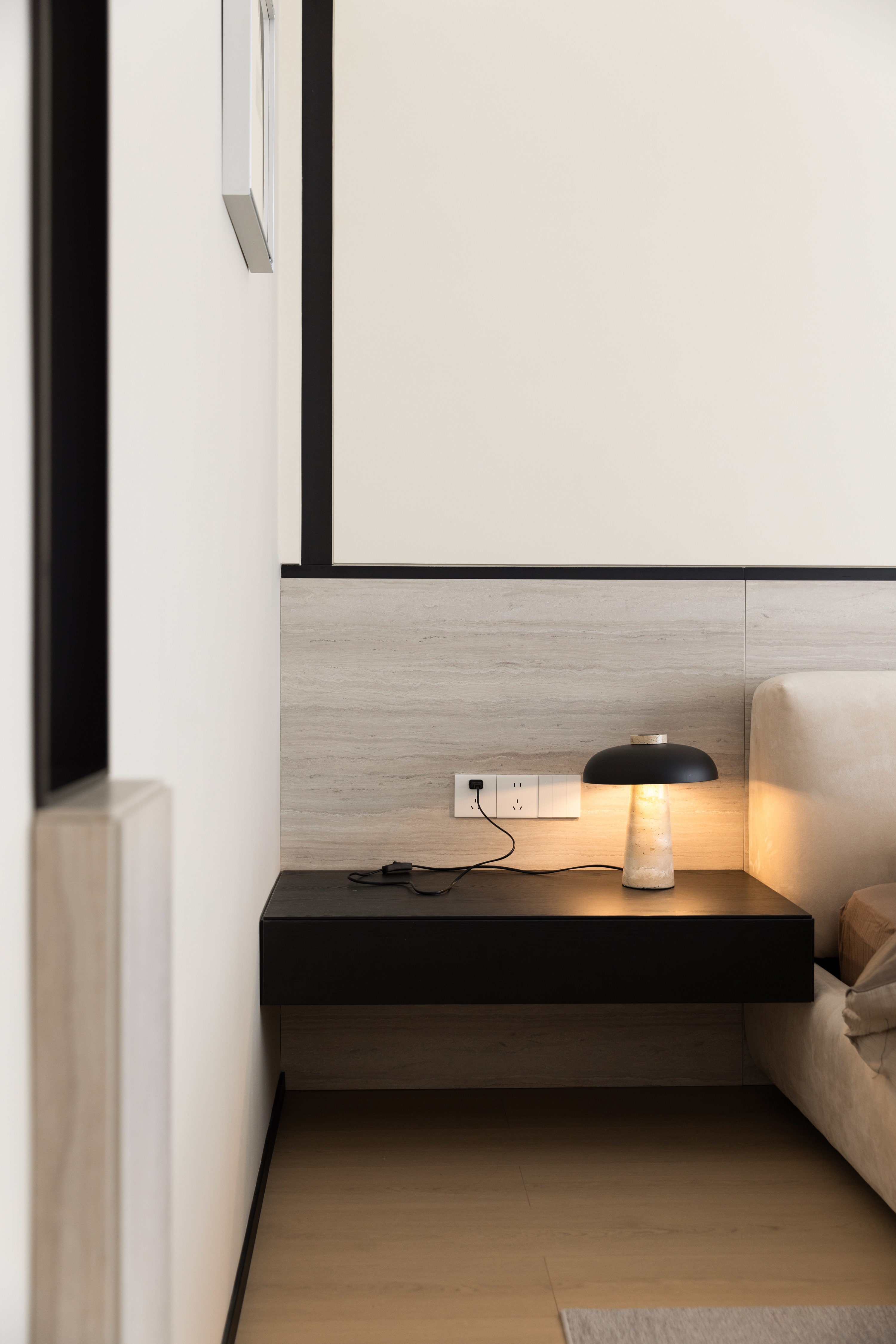 主卧以米杏系为底色,糅合绒面、木作与石纹肌理,营造温润静谧氛围。悬浮 bedside 不对称布局,黑色线条勾勒利落轮廓,灯具与陈设隐于秩序,以简素笔法诠释当代休憩场域的高级质感 。