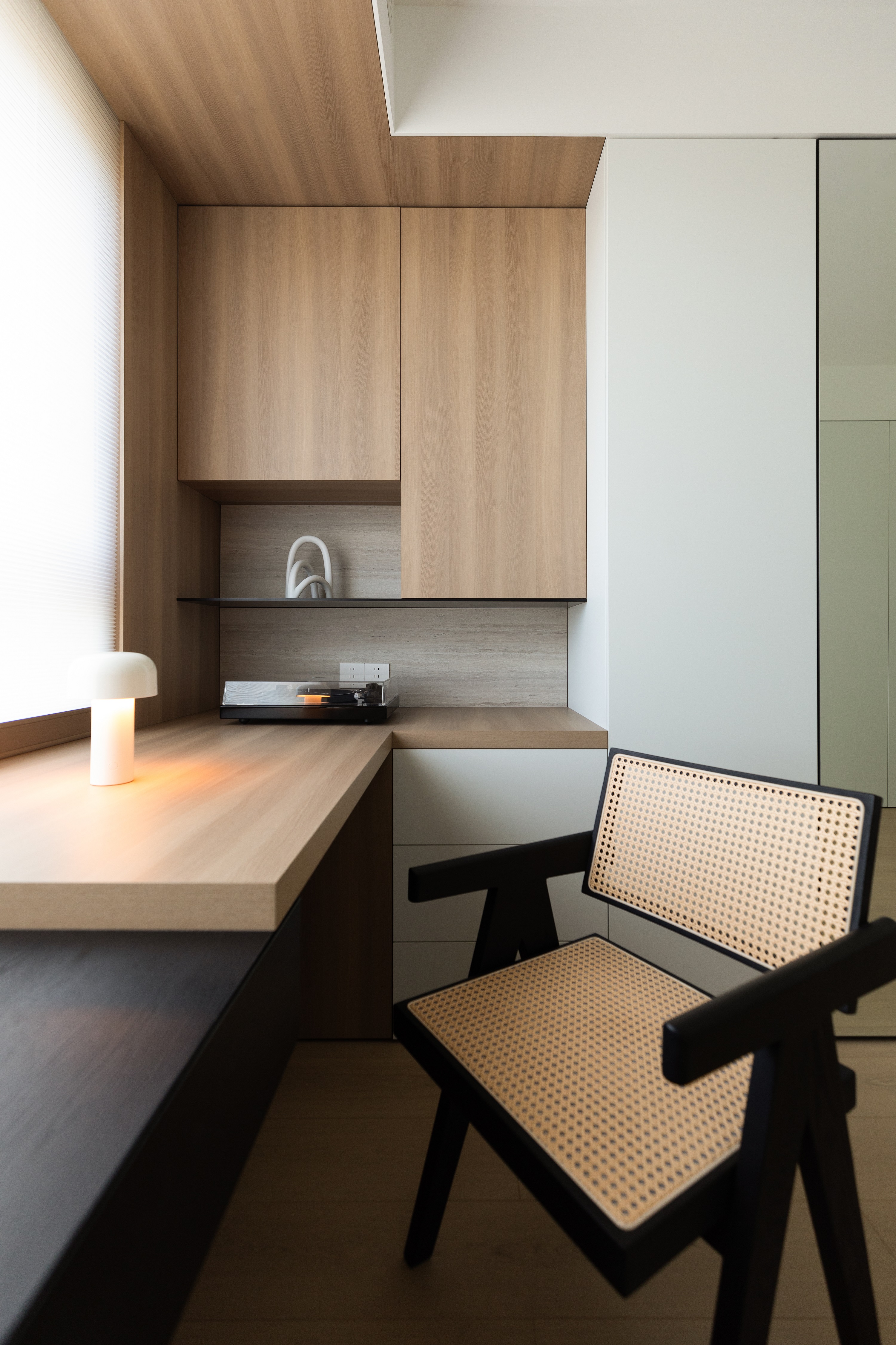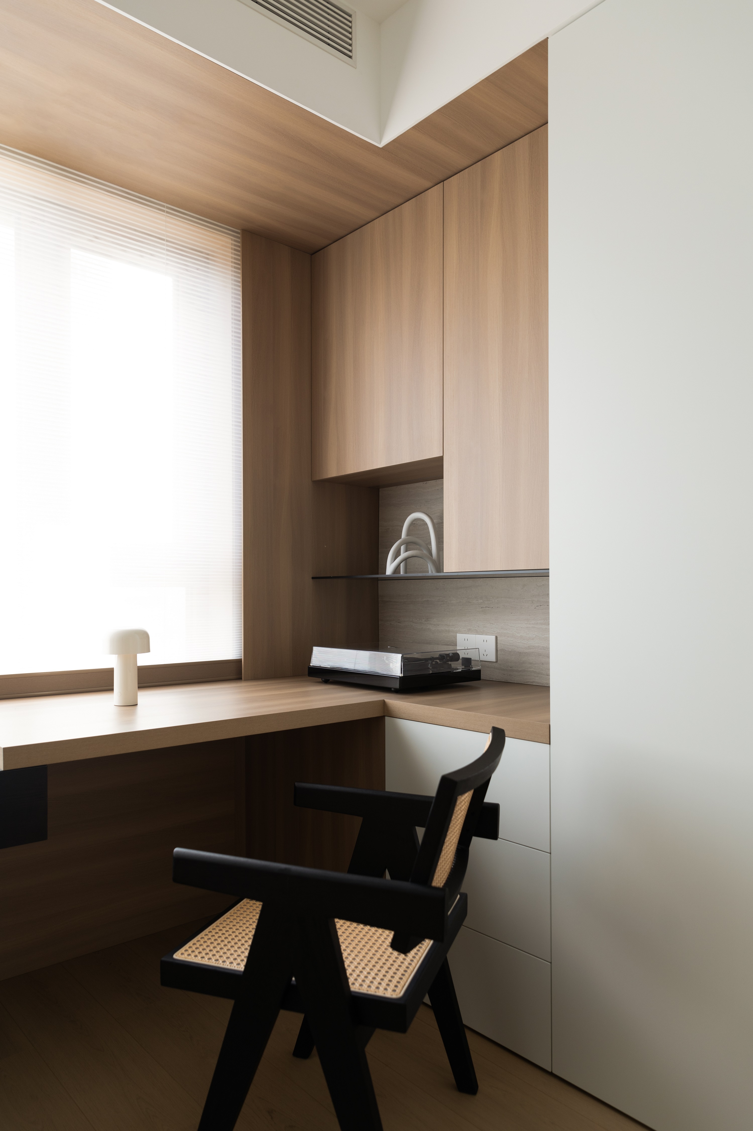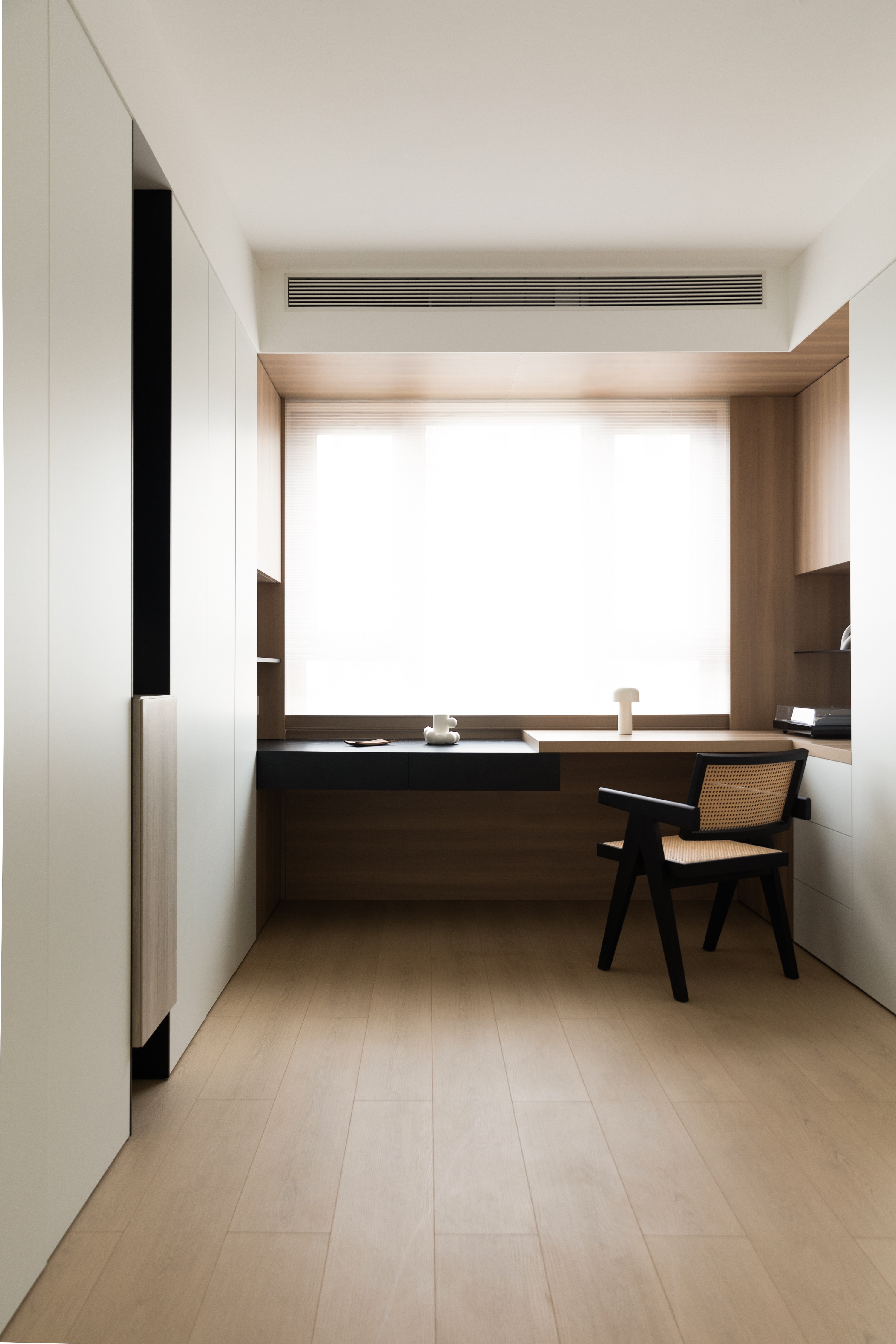 以 “收纳 + 临时办公+梳妆台” 复合功能重构衣帽间。浅木色为底,黑白撞色点睛,藤编肌理增添温润层次;借自然光铺陈,嵌入式光影点亮细节,让储物与使用场景高效融合,简约而不失温度。