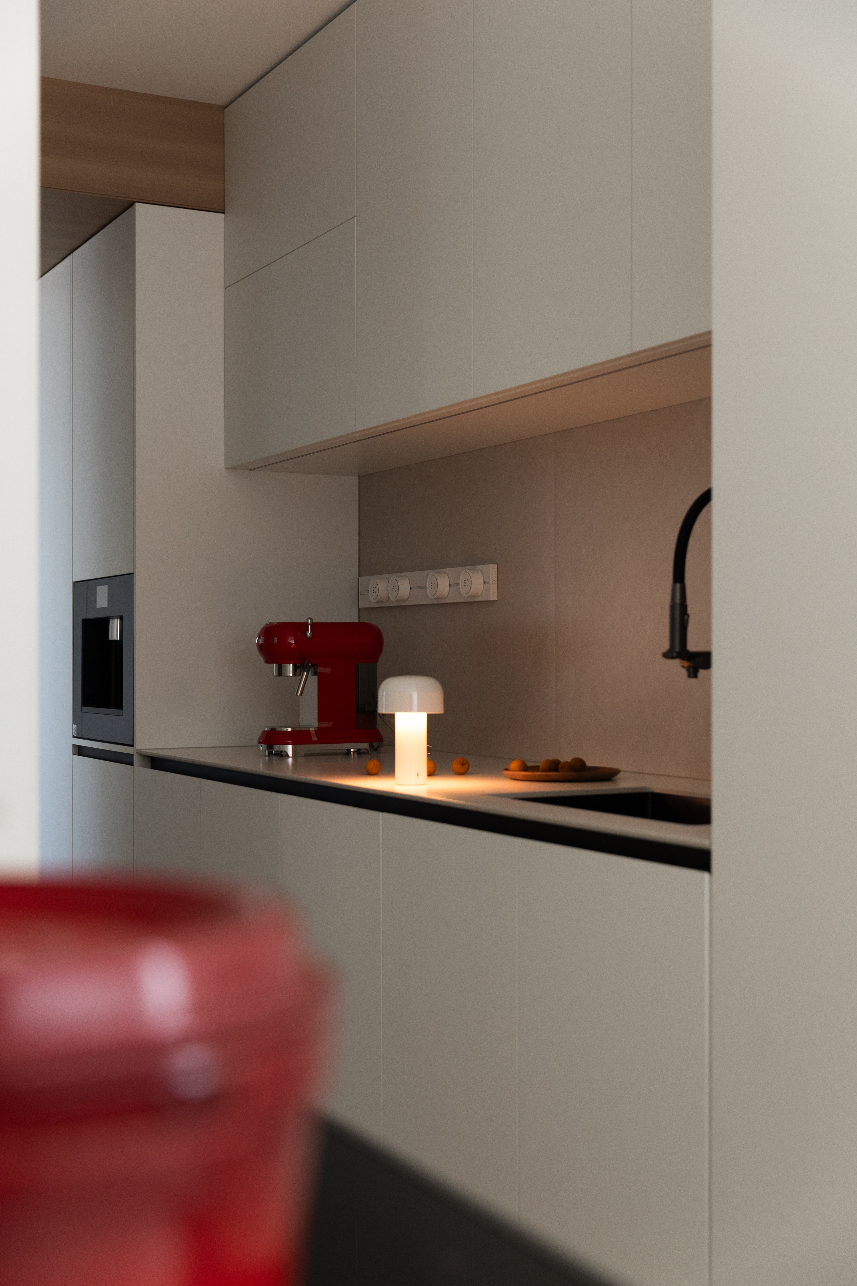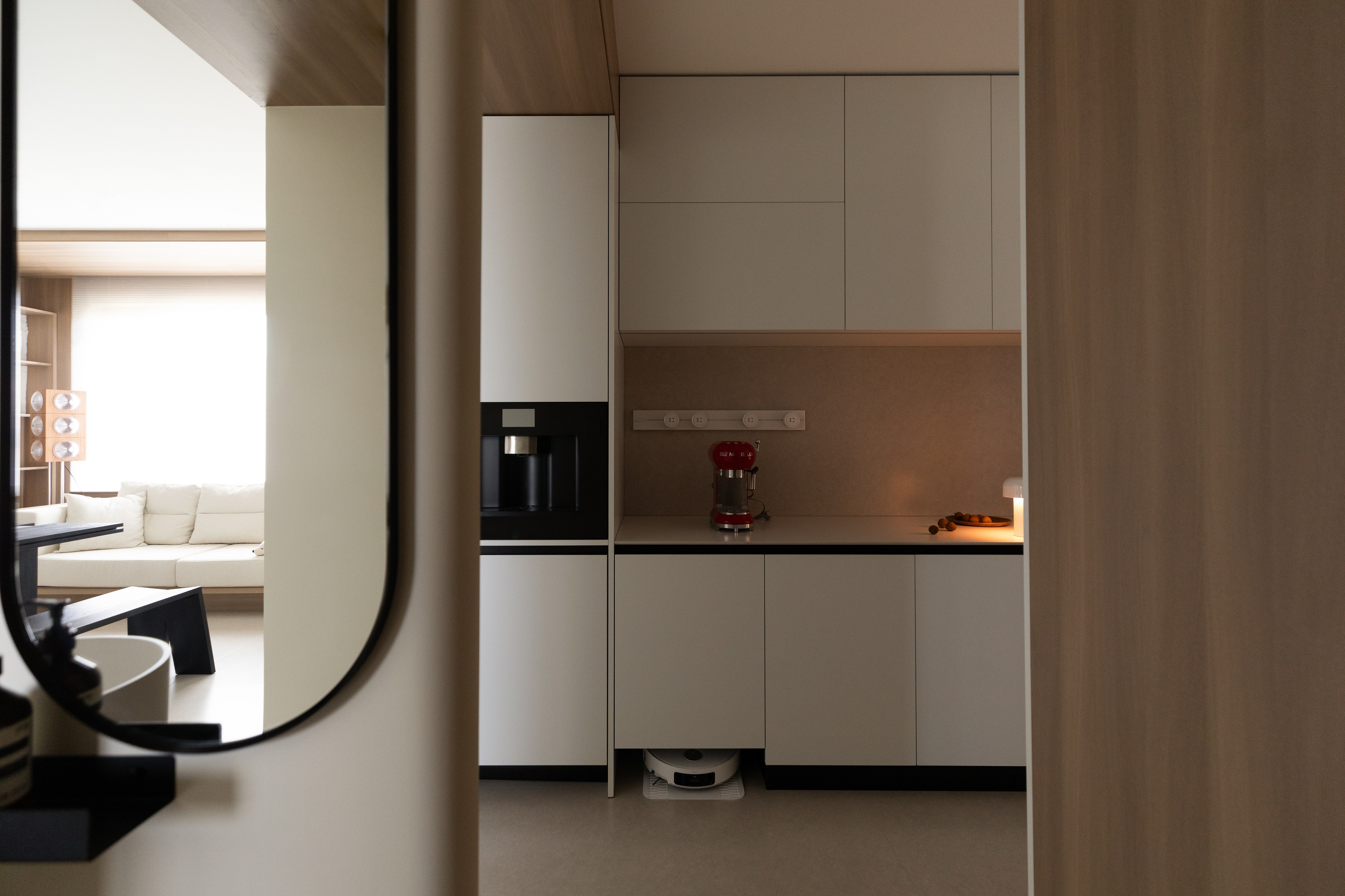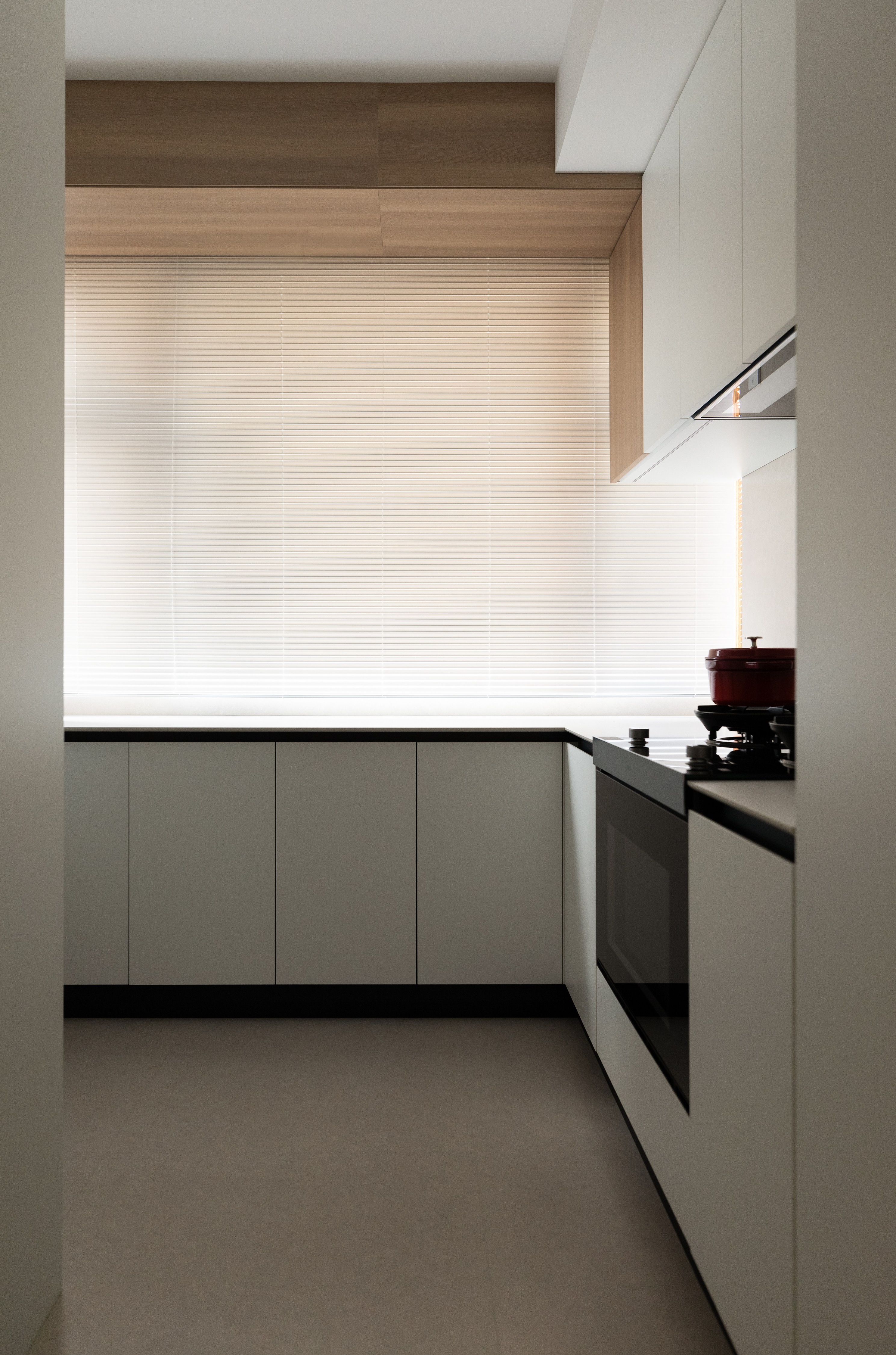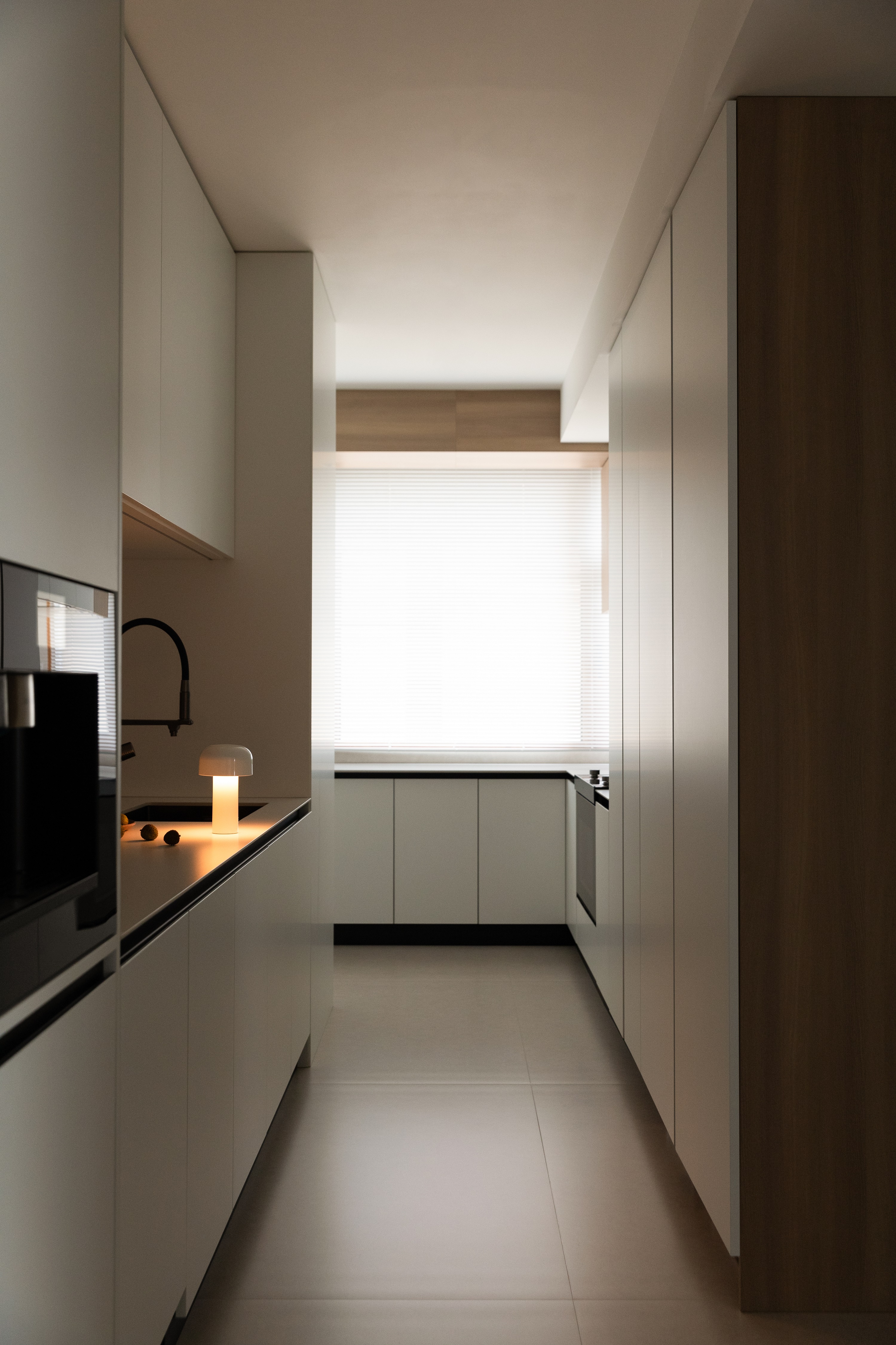 嵌入式电器消隐于立面,维持视觉秩序;红釉咖啡机与暖光小灯作为点睛之笔,在素净中漾起生动涟漪。百叶窗滤入的柔光,与台面明暗层次呼应,于静谧中沉淀材质的温润质感,诠释「克制设计」与「日常烟火」的平衡美学。