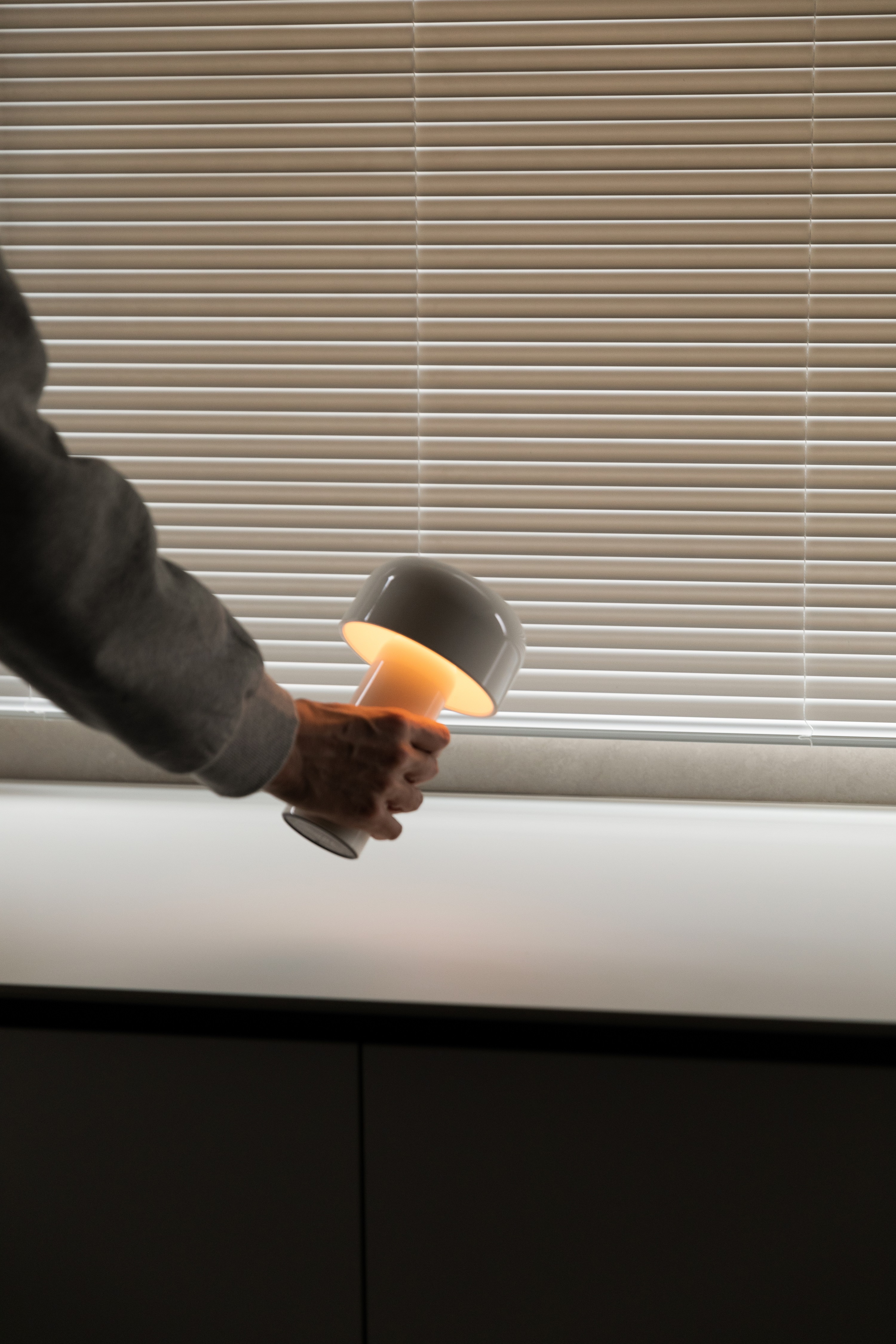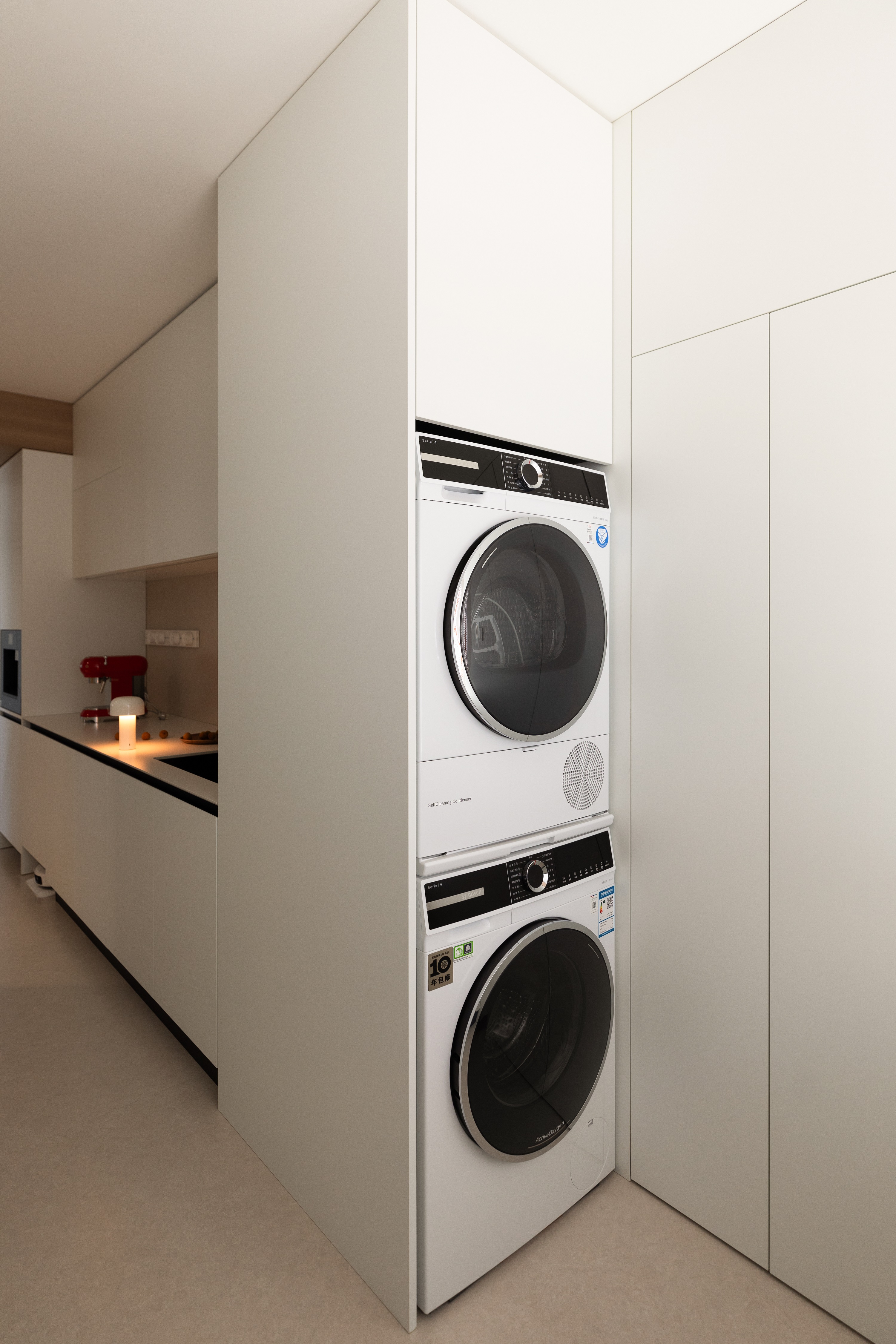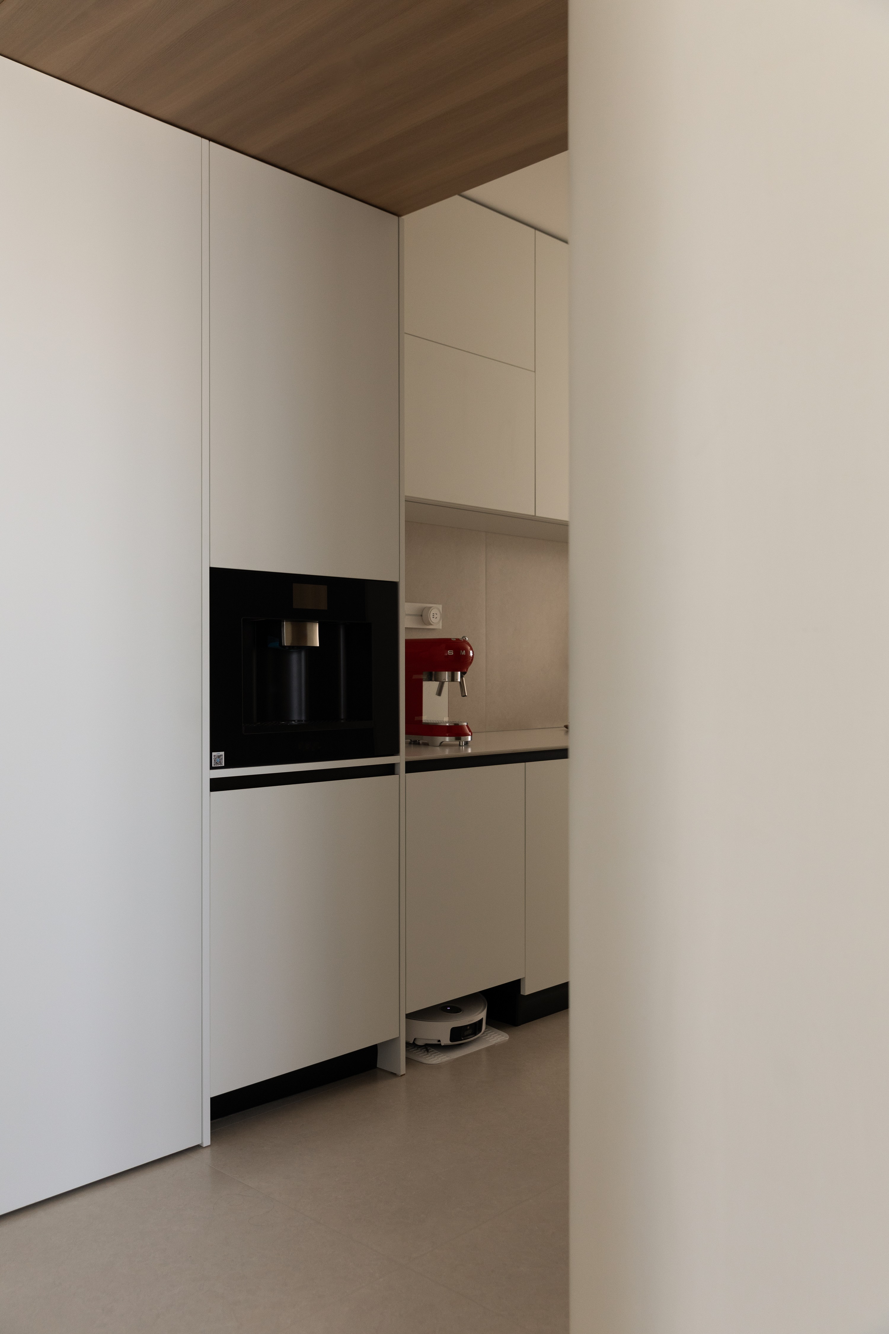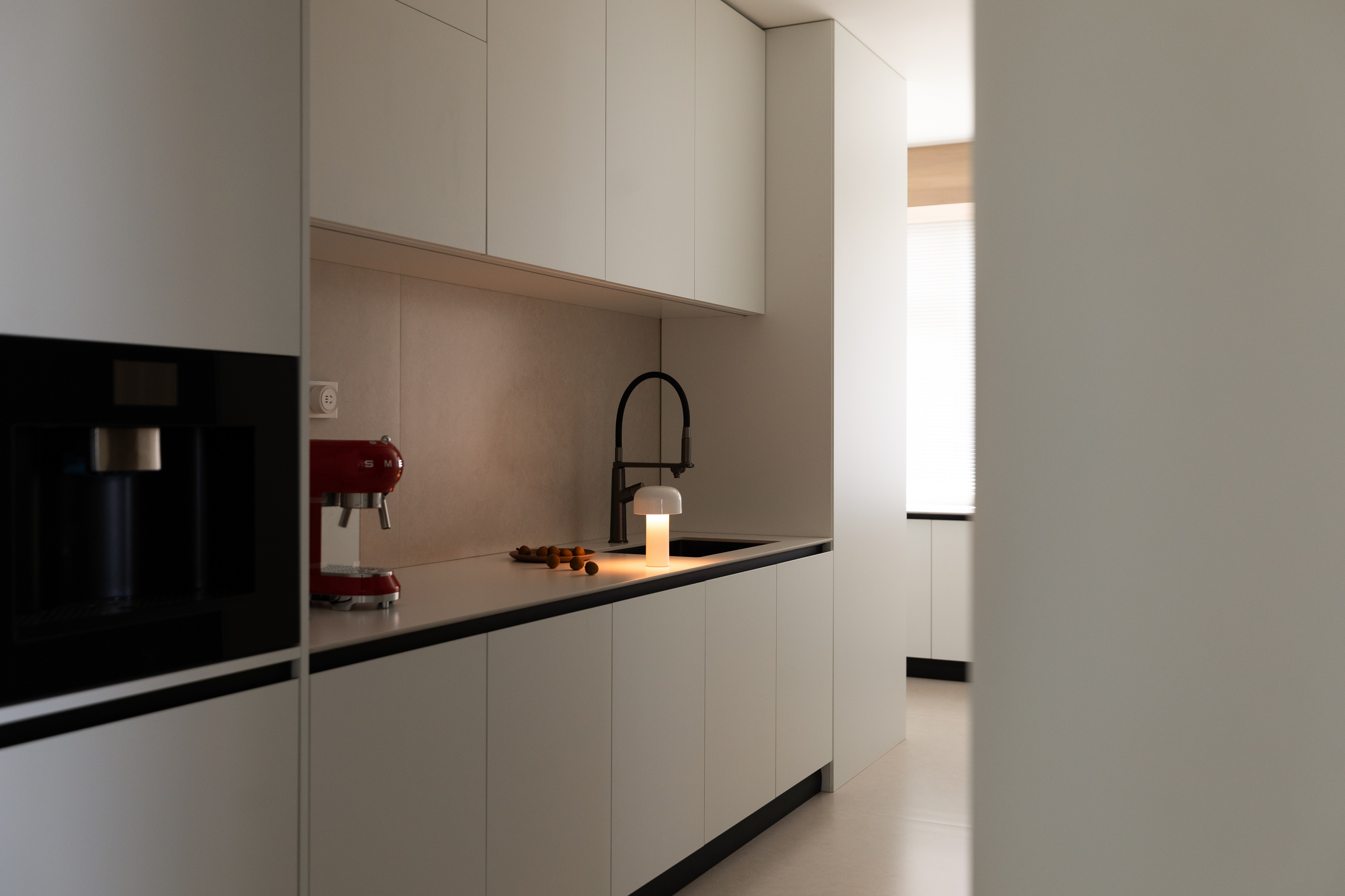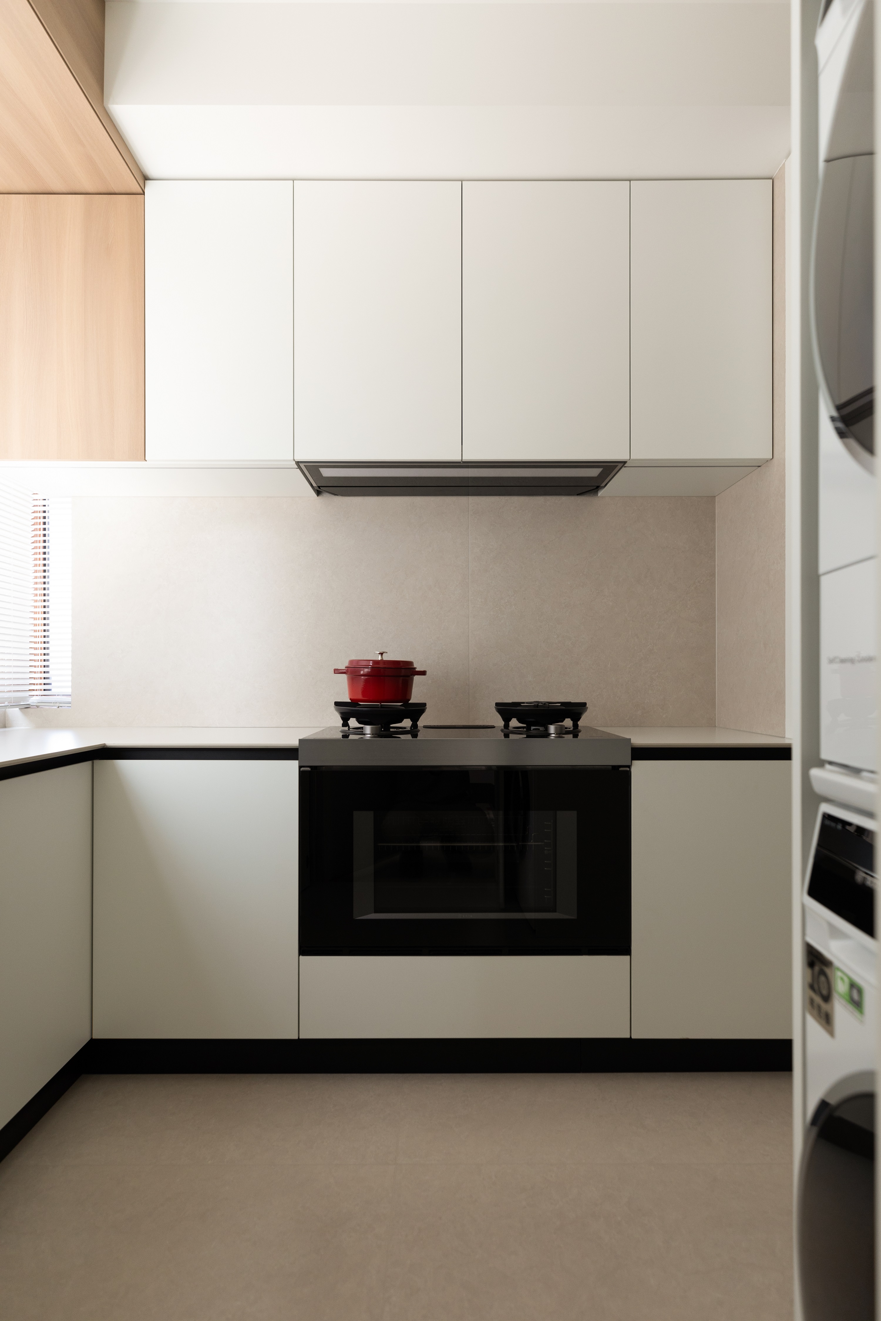 嵌入式电器消隐于立面,维持视觉秩序;红釉咖啡机与暖光小灯作为点睛之笔,在素净中漾起生动涟漪。百叶窗滤入的柔光,与台面明暗层次呼应,于静谧中沉淀材质的温润质感,诠释「克制设计」与「日常烟火」的平衡美学。