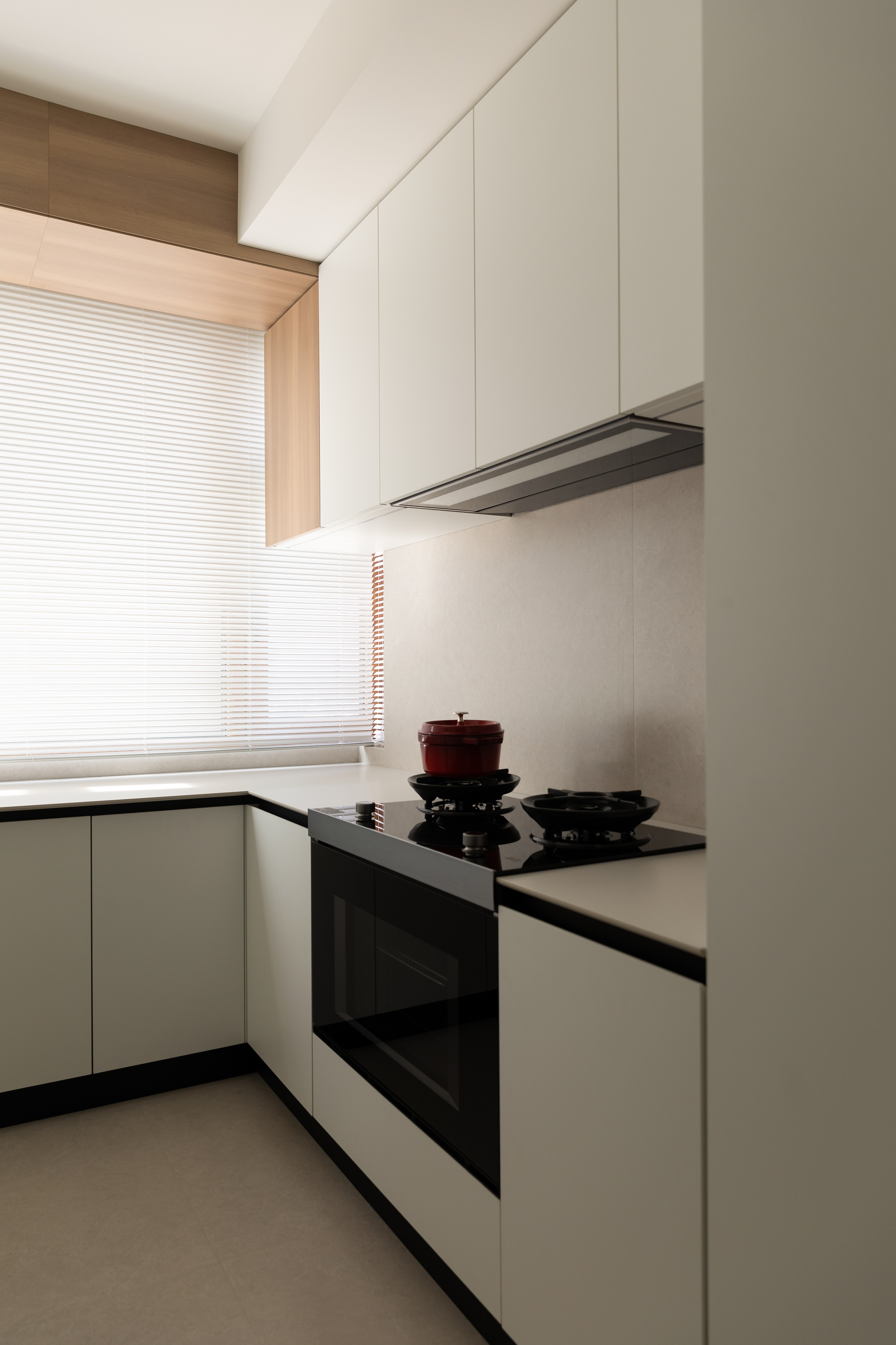 本案厨房设计秉持 「极简主义与生活温度共生」 的理念,以白、黑、木的低饱和度色调构建基底,通过一体化柜体的利落线条,实现收纳与空间界定的双重功能。