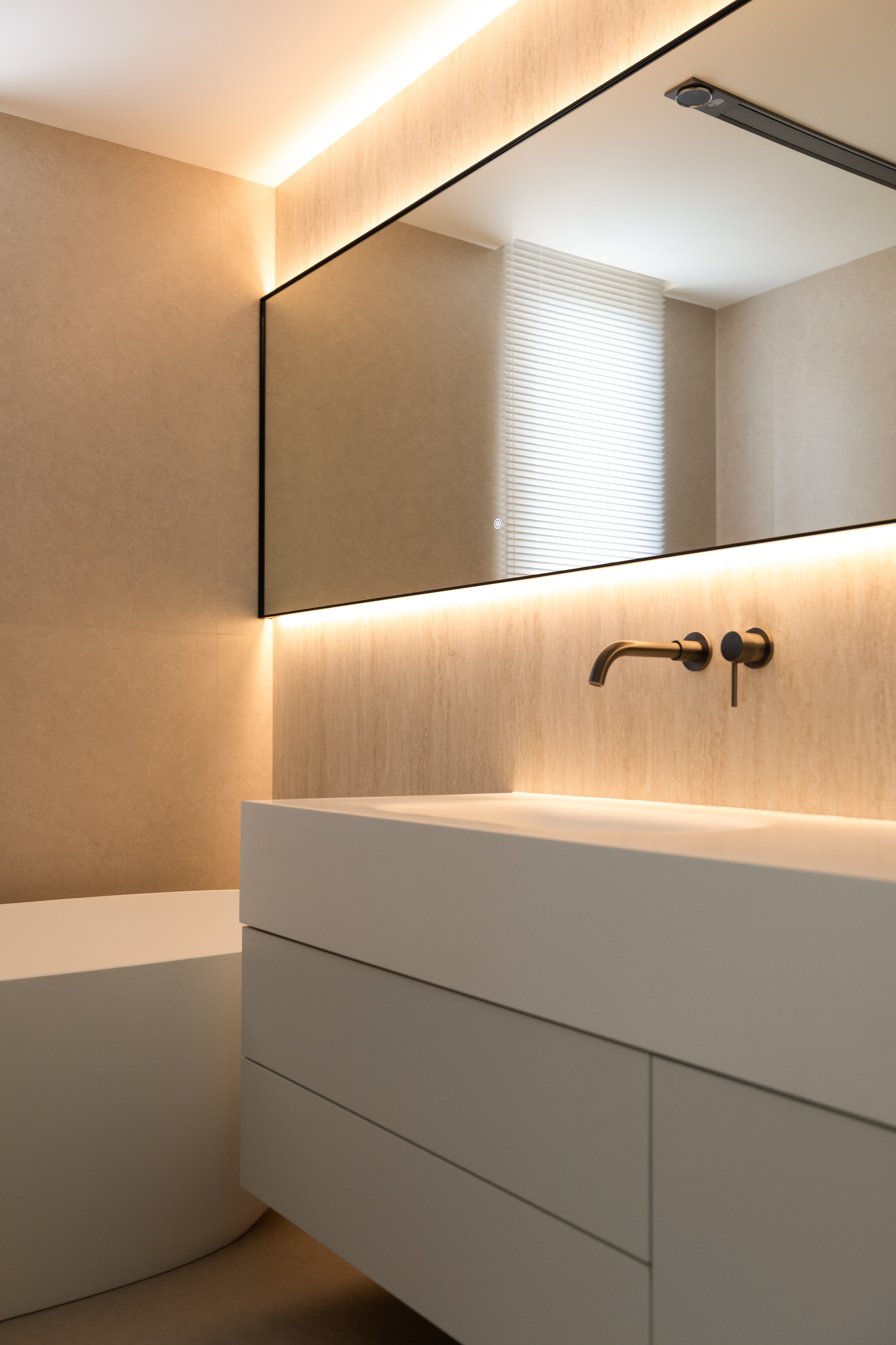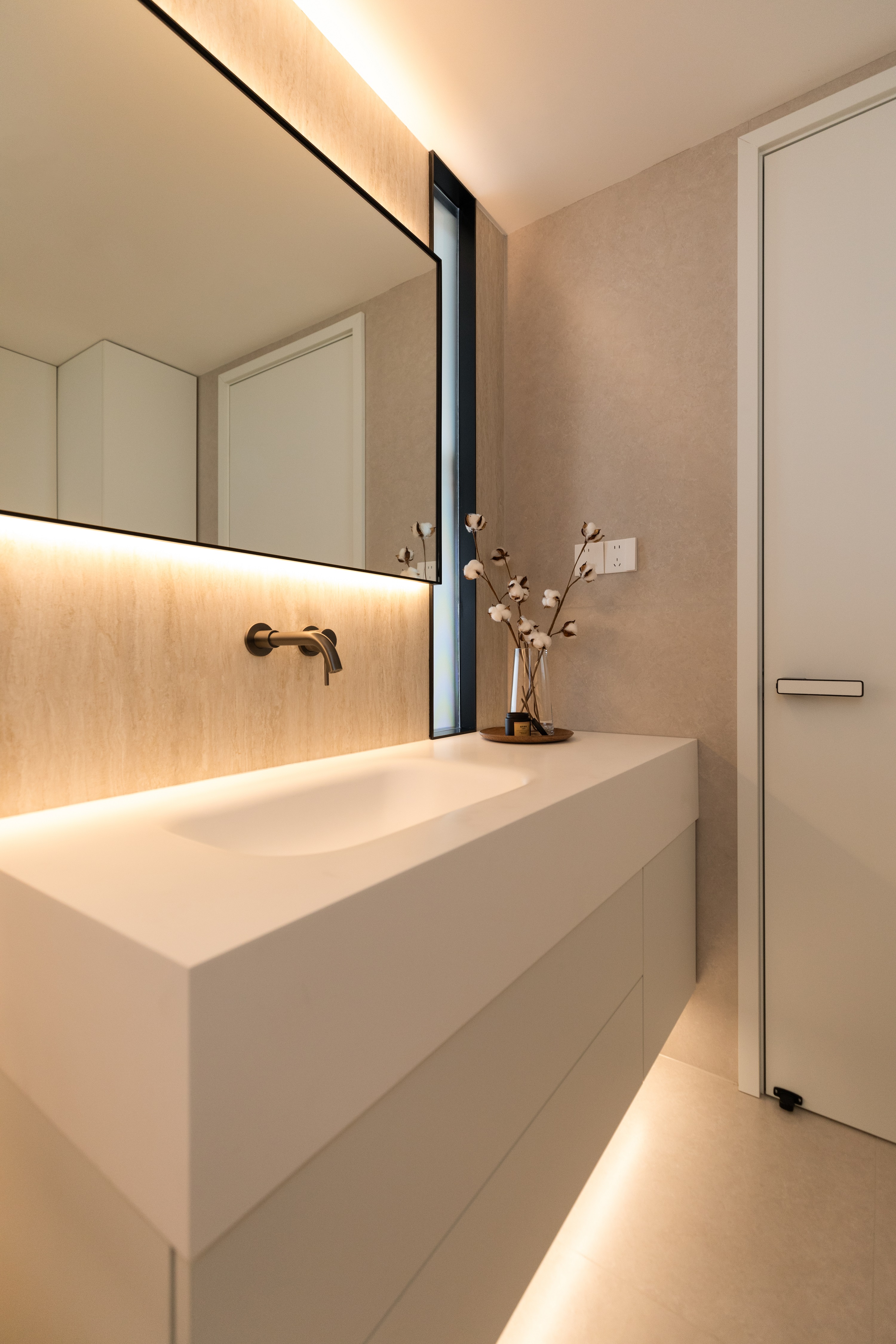 主卫以暖调为基底,哑光墙面如柔缎晕染温润光泽,悬浮洗手台与一体盆凝练利落线条,金属龙头、淋浴组件以拉丝质感捎来精致况味。线性光层叠叙事:镜前灯带明澈照拂,柜底微光悄然漫溯,天花板间接照明柔化空间边界。