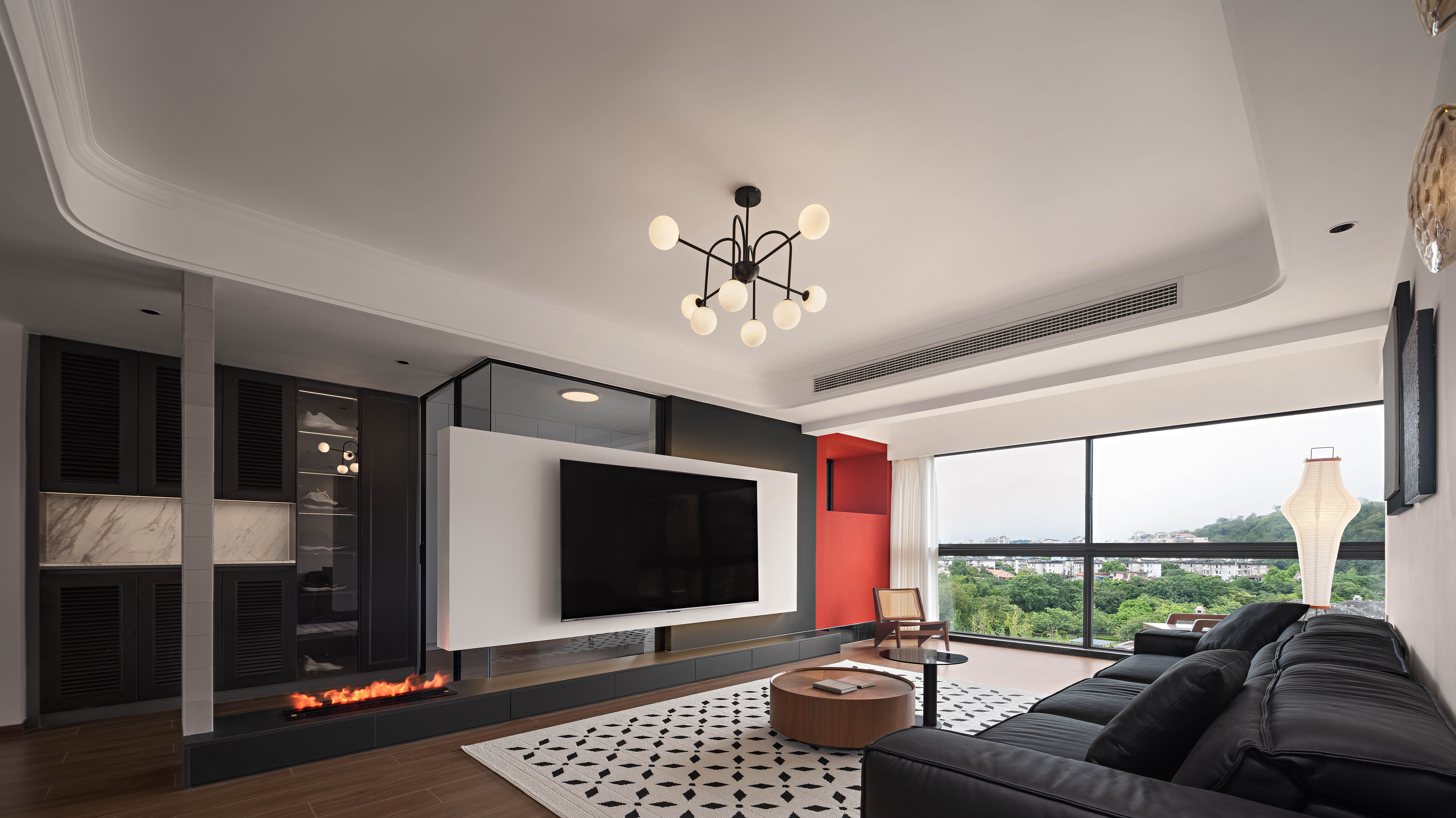 设计选材:电视墙右侧的空调外机位,本是一个容易被忽略甚至嫌弃的 “鸡肋” 空间。但在设计师的巧思下,它却成为了连接室内外景致的纽带。在确保空调外机正常安放的前提下,设计师对其上方进行了掏空处理。于是,远处的山景与右侧窗外的风光,通过这个精心打造的 “窗口”,完成了一次美妙的对话与衔接。原本可能割裂视觉的空调外机位,摇身一变,成为了框景的艺术装置,让居者在室内静坐时,也能感受到自然景致的绵延与灵动。