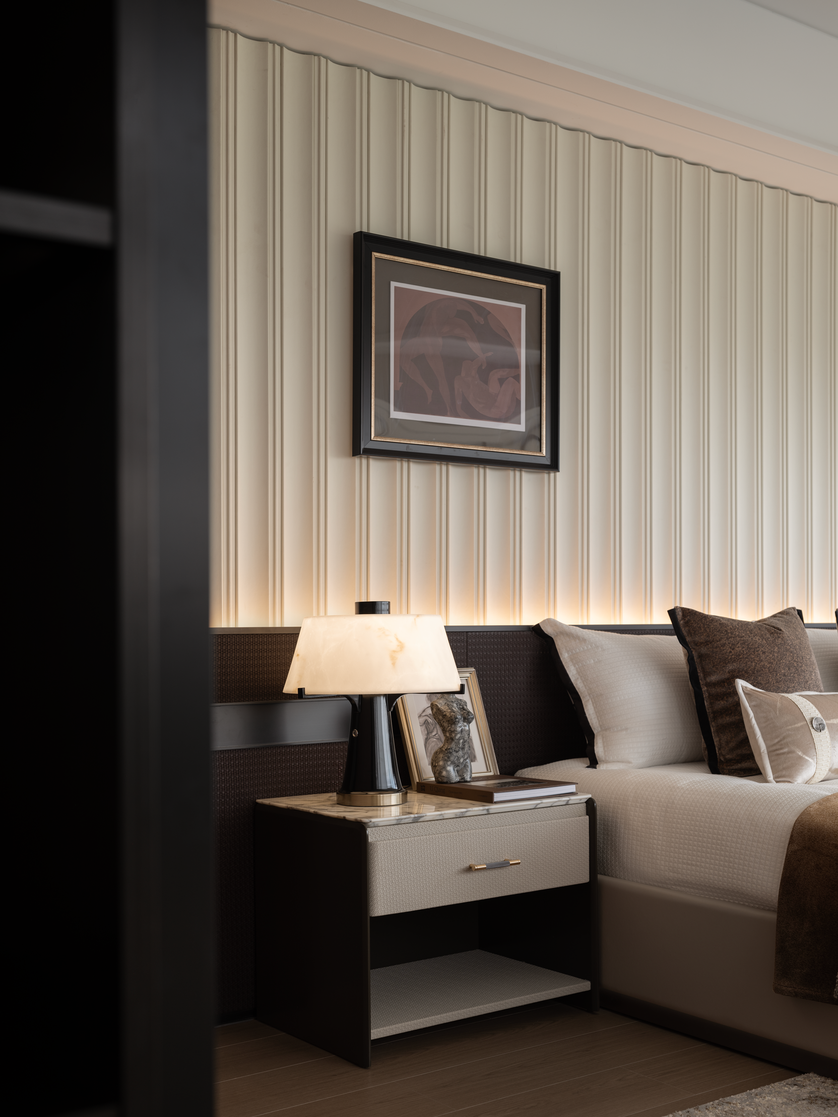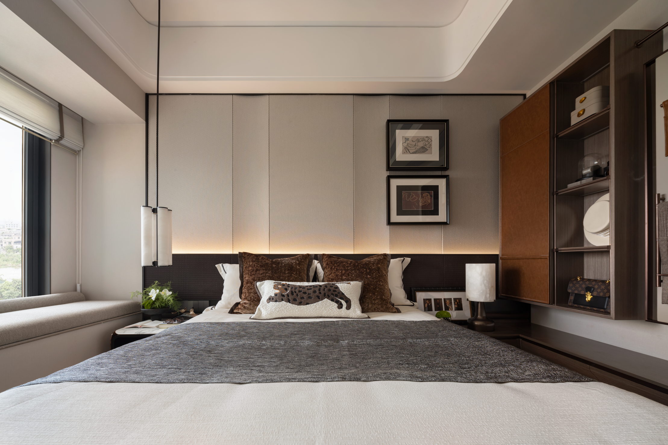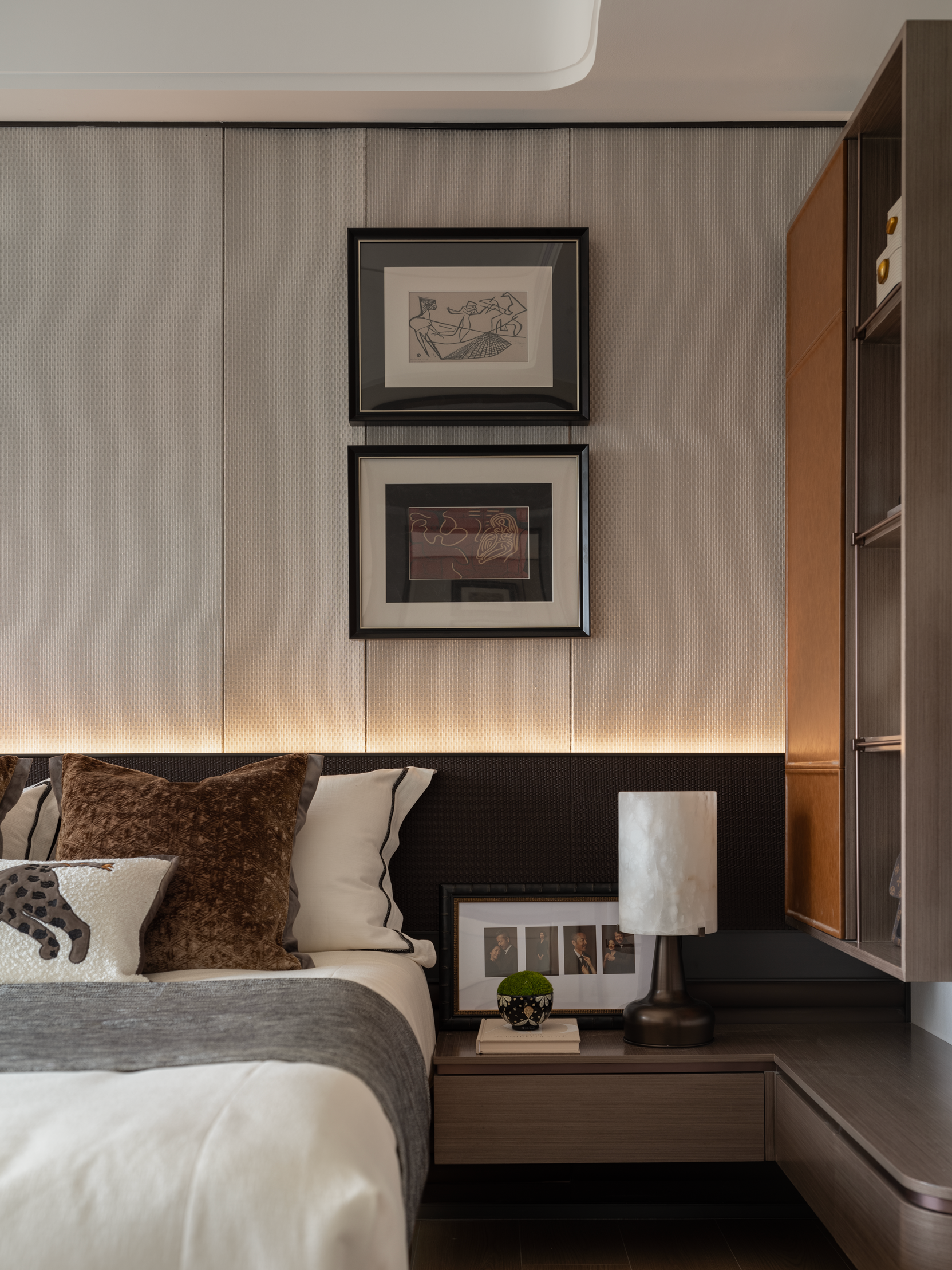 设计选材:在材质选择上,我们更追求内敛的品质感:艺术墙布与编织皮革的细腻触感形成对比,温润的木饰面平衡了白色的清冷,柔软的多层次布艺床品让每一天都沉浸在生活的仪式感中。