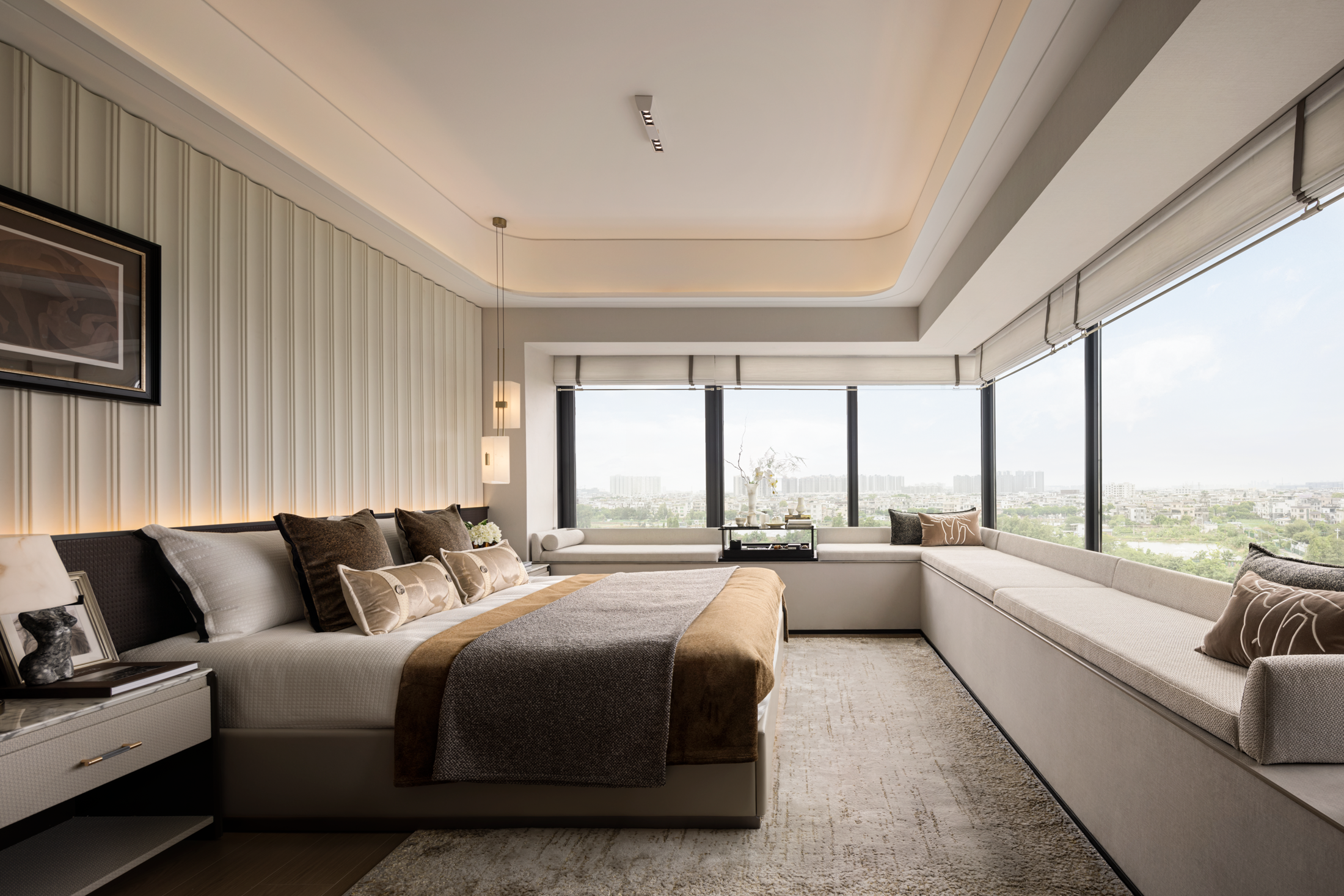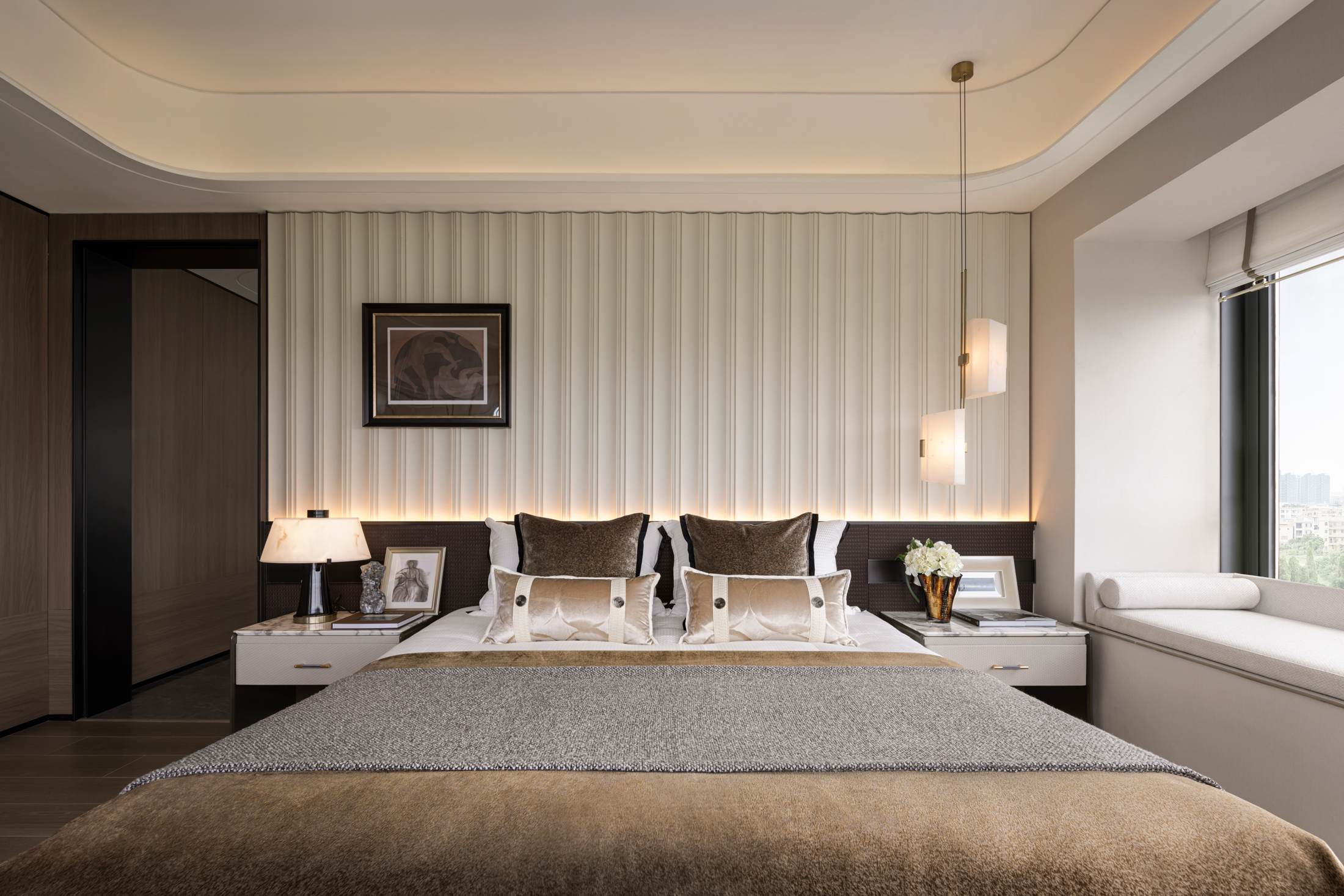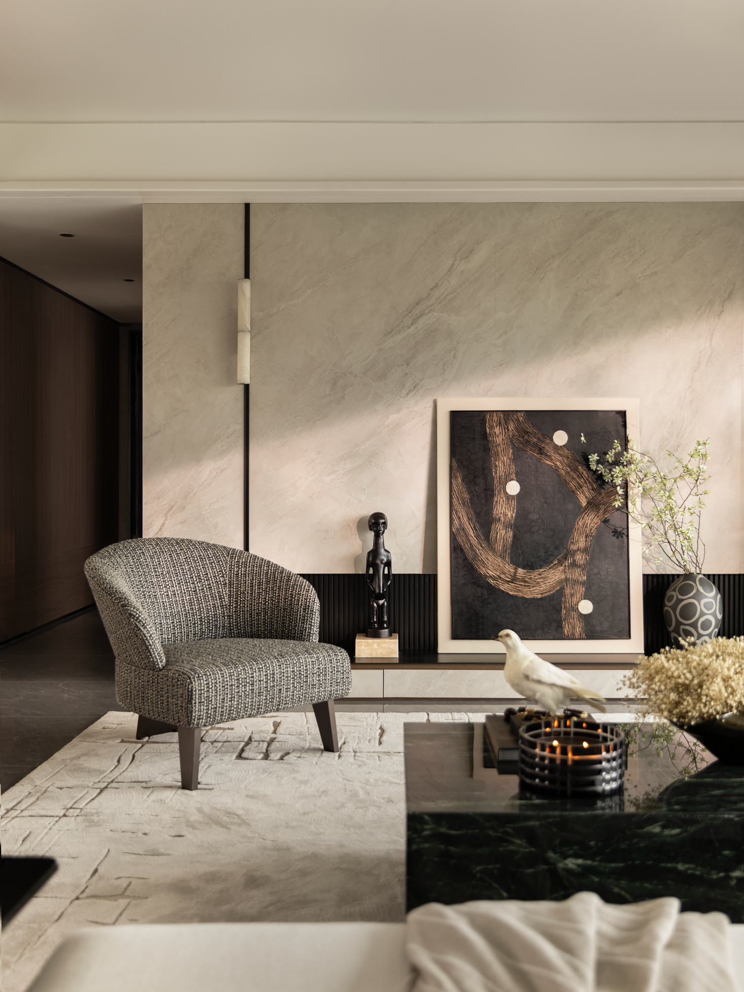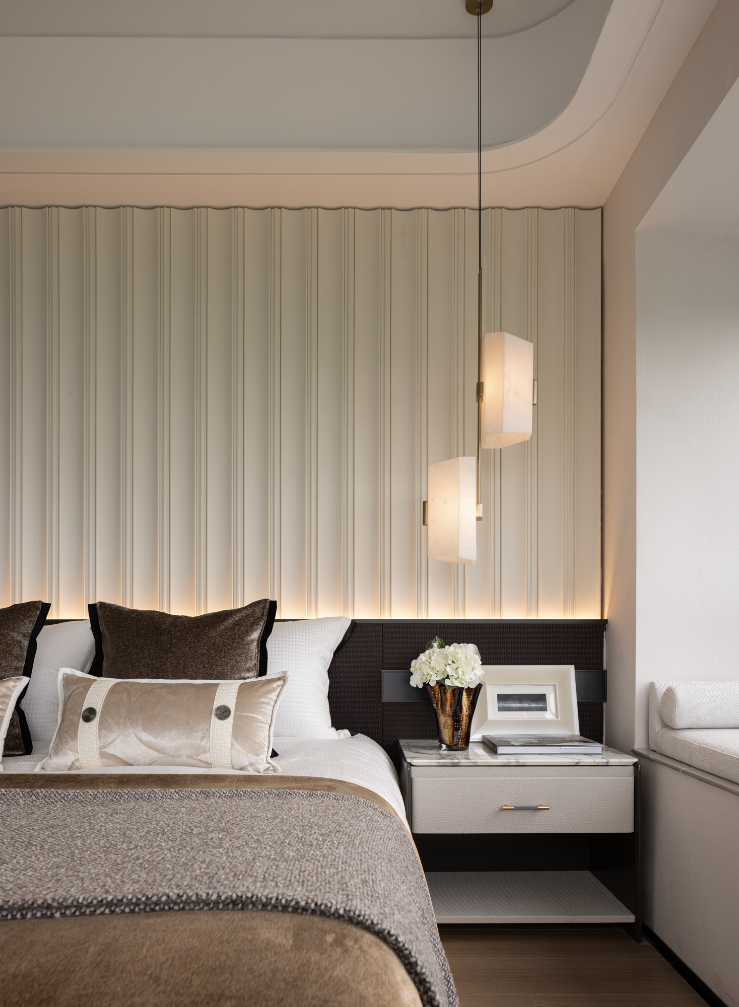 设计选材:在材质选择上,我们更追求内敛的品质感:艺术墙布与编织皮革的细腻触感形成对比,温润的木饰面平衡了白色的清冷,柔软的多层次布艺床品让每一天都沉浸在生活的仪式感中。