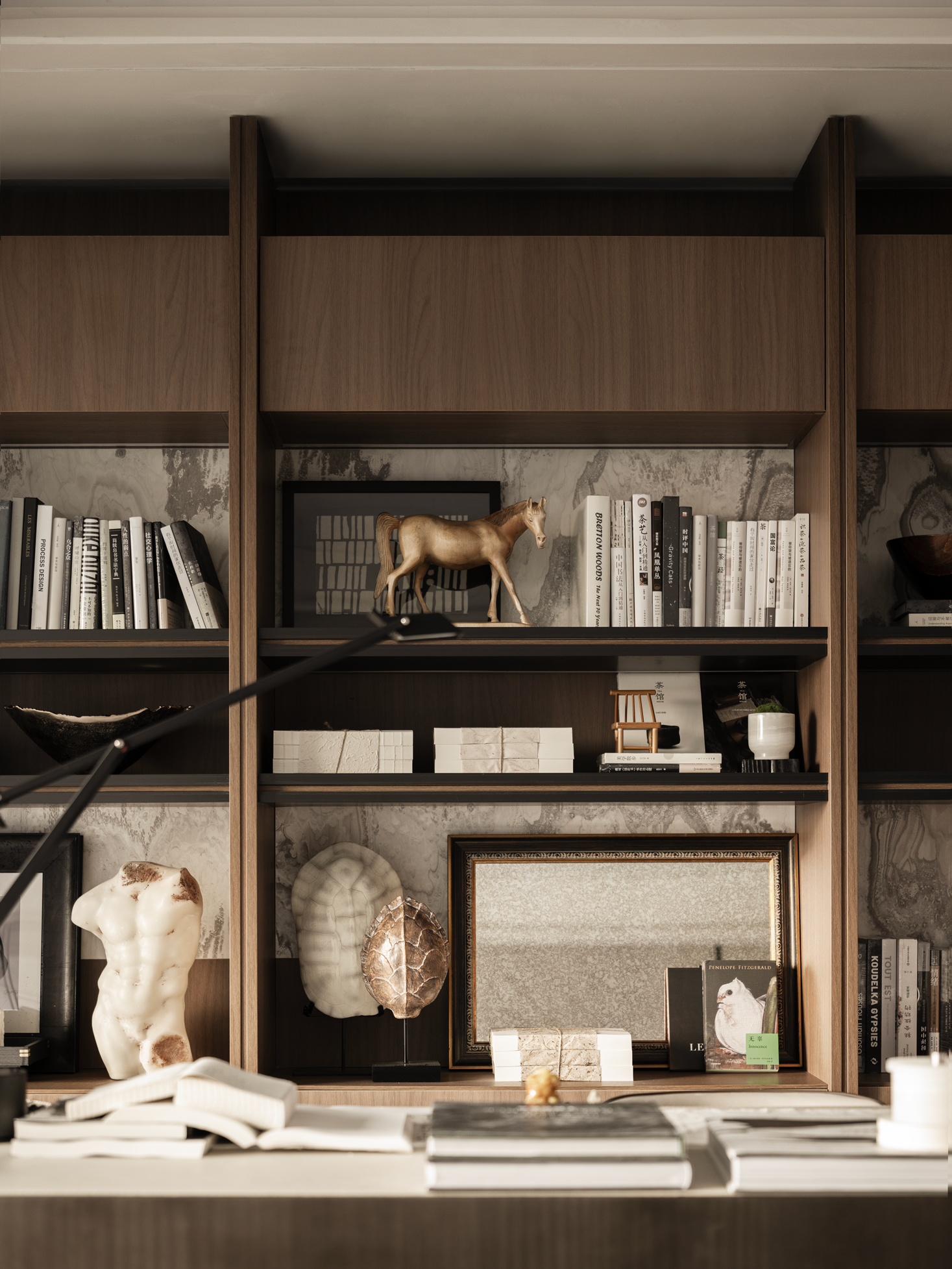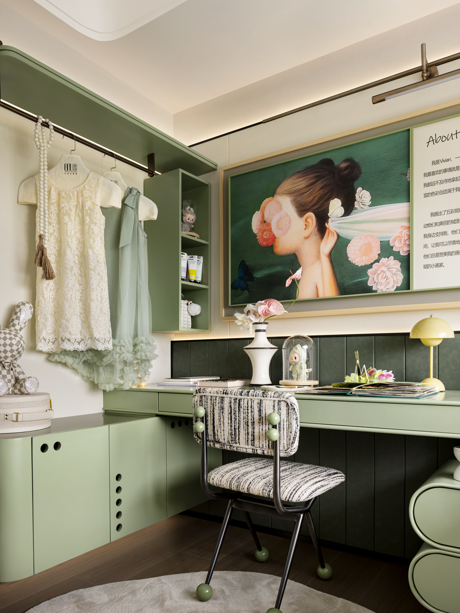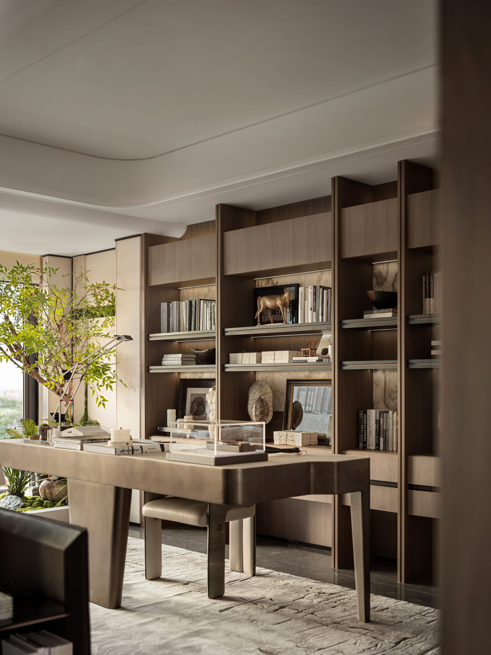 空间意境:自然纹理的原木书柜,与一侧的嵌入式花池共同呼吸,在阅读间隙抬头便能望见一片绿意。书柜划分区成人书籍与儿童读物,一家人可以各自阅读,又彼此陪伴。最好的教育,就藏在这些日常相处的细节里。