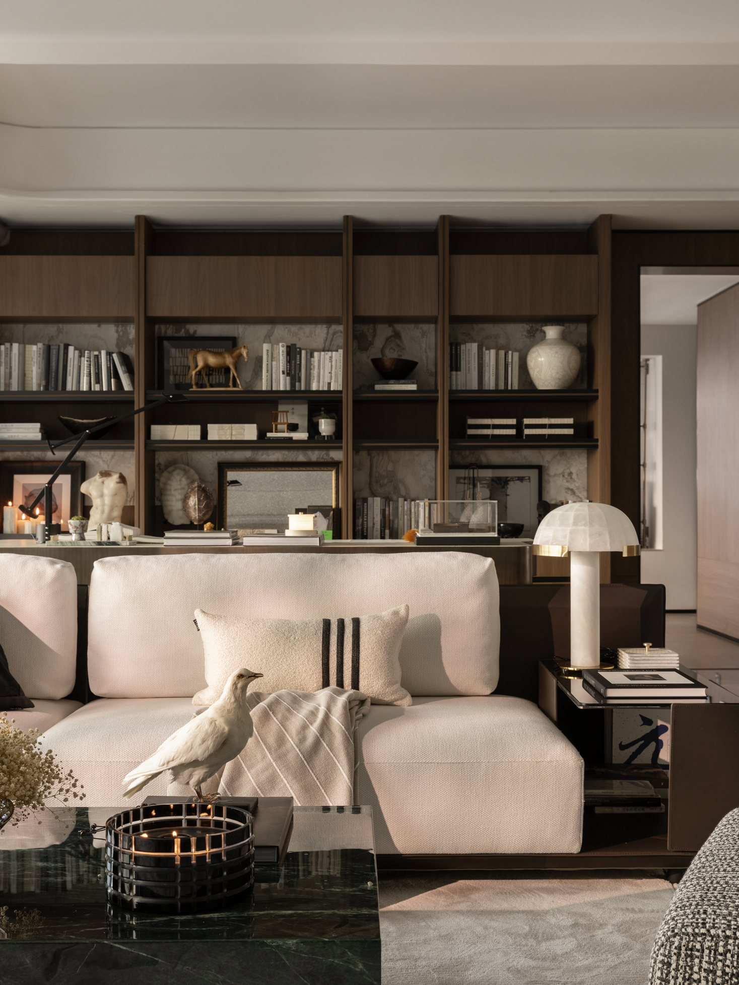 空间布局:我们果断拆除了客厅与景观阳台、杂物间的隔墙,让原本被分割的三个零碎空间彻底联通。一个多功能于一体的复合大厅跃然眼前——一侧是整墙书柜构成的阅读区,另一侧是融入花池的品茗区,中央沙发区域则可根据需要变为亲子游戏区或聚会场所。