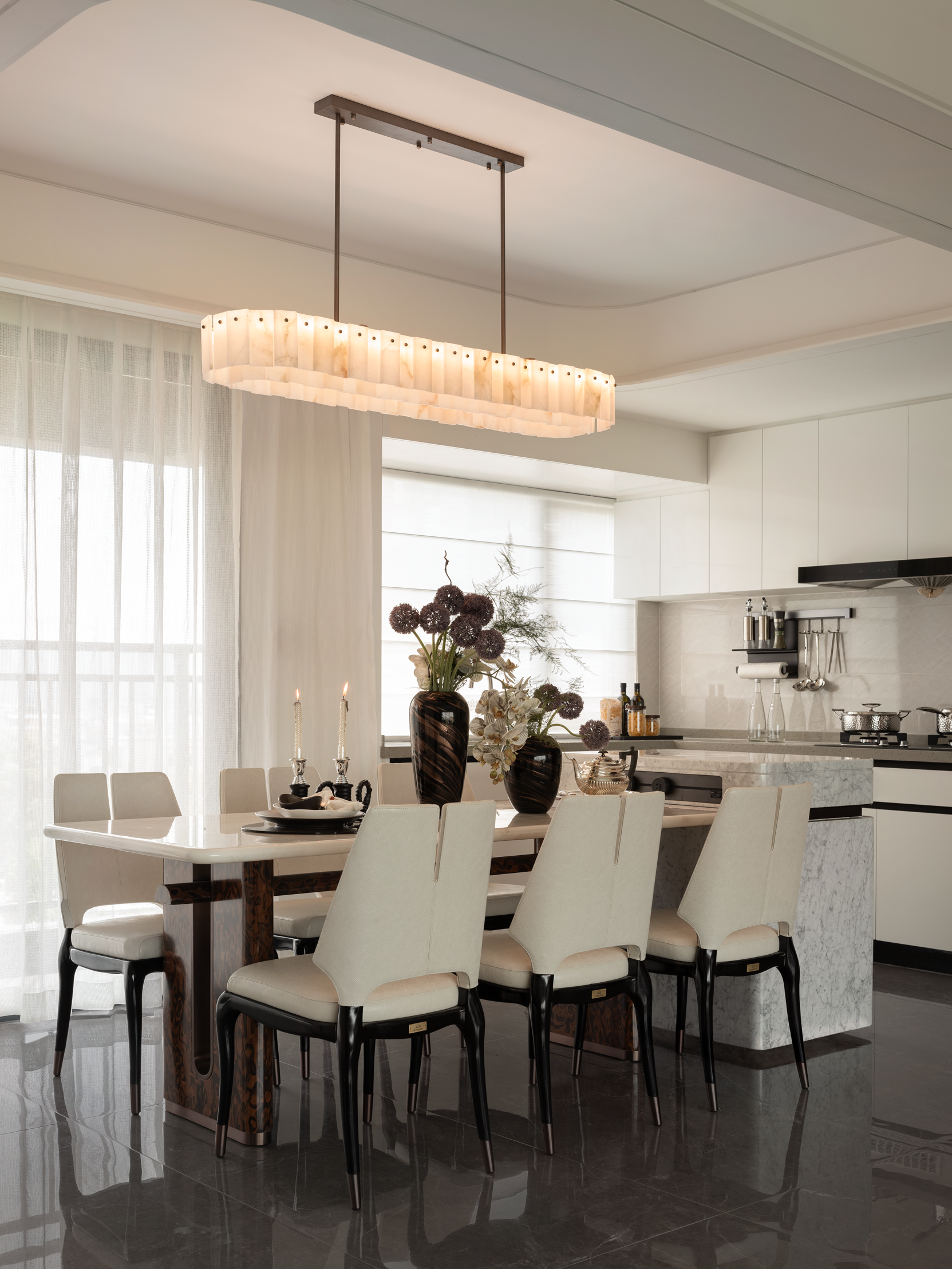 拆除餐、厨与生活阳台之间的阻隔,形成一个视野与光线更加明朗的社交化餐厨一体厅。一条流畅的洄游动线就此展开,将备餐、用餐与家居动线紧密串联。
