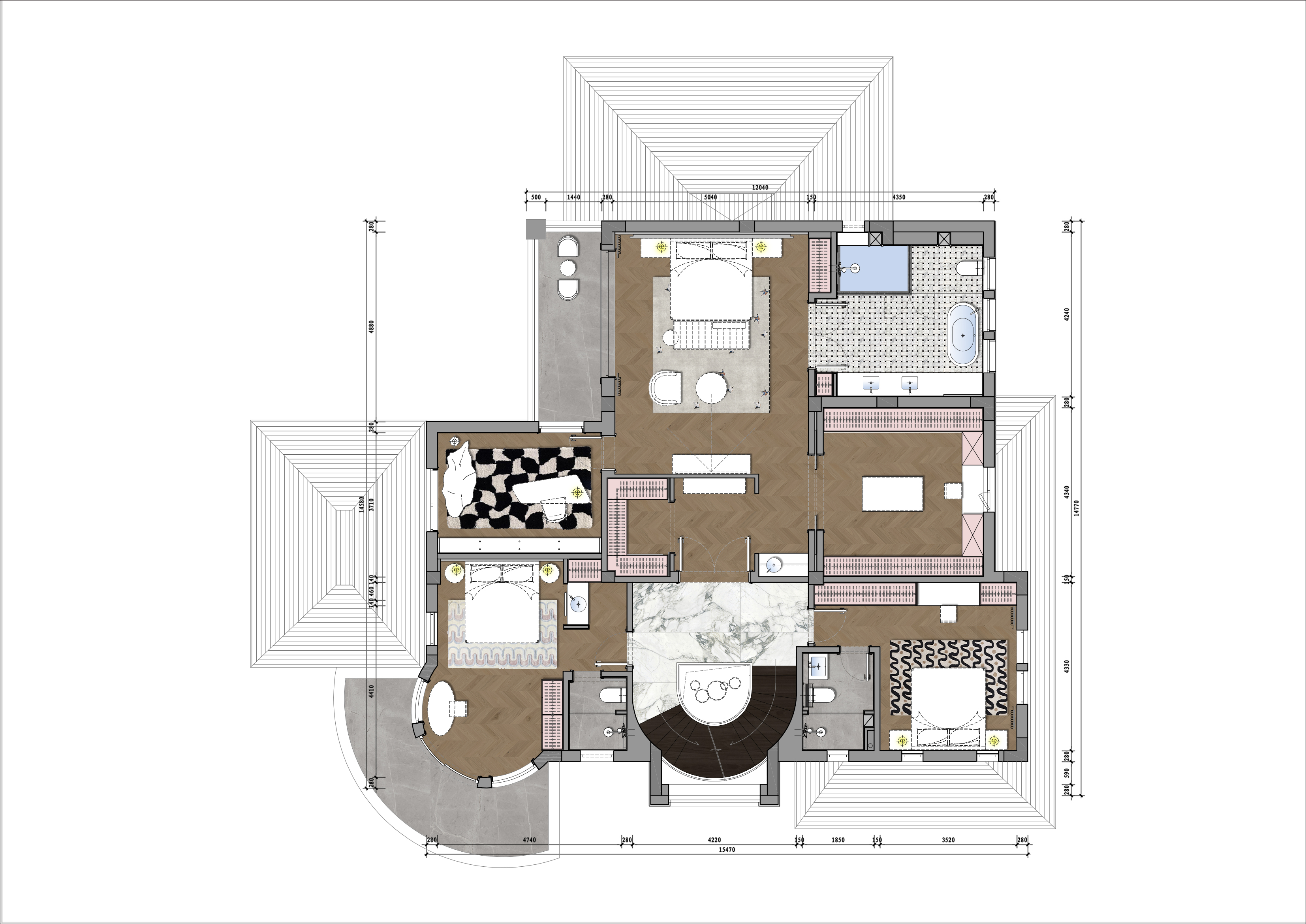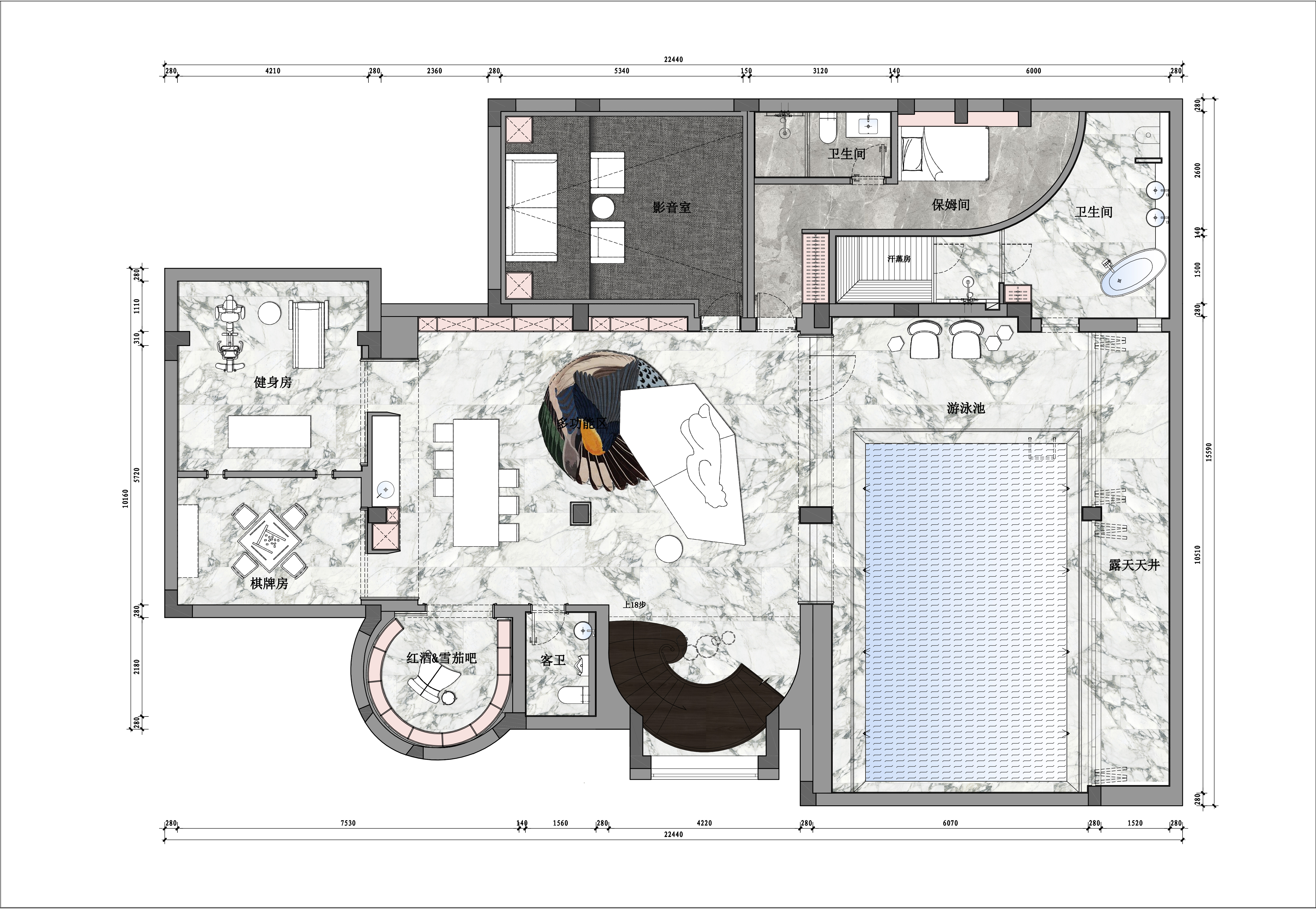 空间意境:该空间的创新点在于将法式优雅与现代简约风格巧妙融合,创造出既温馨又典雅的居住环境。玄关、客厅、餐厅等空间通过大理石拼花、木格栅、曲线吊灯等元素的结合,不仅打造出视觉上的丰富层次,还通过巧妙的设计与材质运用,强化了空间的流动感和宁静感。尤其是在泳池与地下多功能区,使用了青绿色的水面、透明玻璃隔断与流线型的灯饰,营造出梦幻般的氛围,让环境更加富有诗意与艺术感。