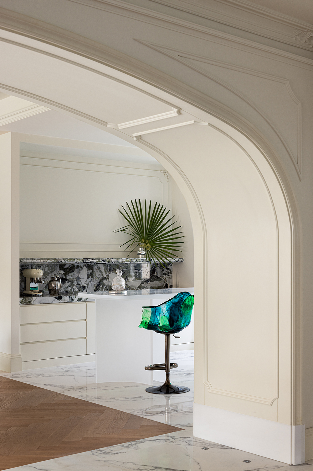 设计选材:本项目选材注重环保与经济性,尤其在材料的选择上进行了创新和优化。例如,大理石、天然洞石与木质格栅的搭配,不仅确保了空间的美学效果,还考虑到材料的耐久性与可持续性。使用了轻盈的玻璃隔断与拱形门廊,在保持视觉通透性的同时降低了空间的压迫感;而选用的无害环保材料如亚克力岛台和宝格丽大理石,不仅符合低碳环保的要求,还增强了空间的高端感和精致感。