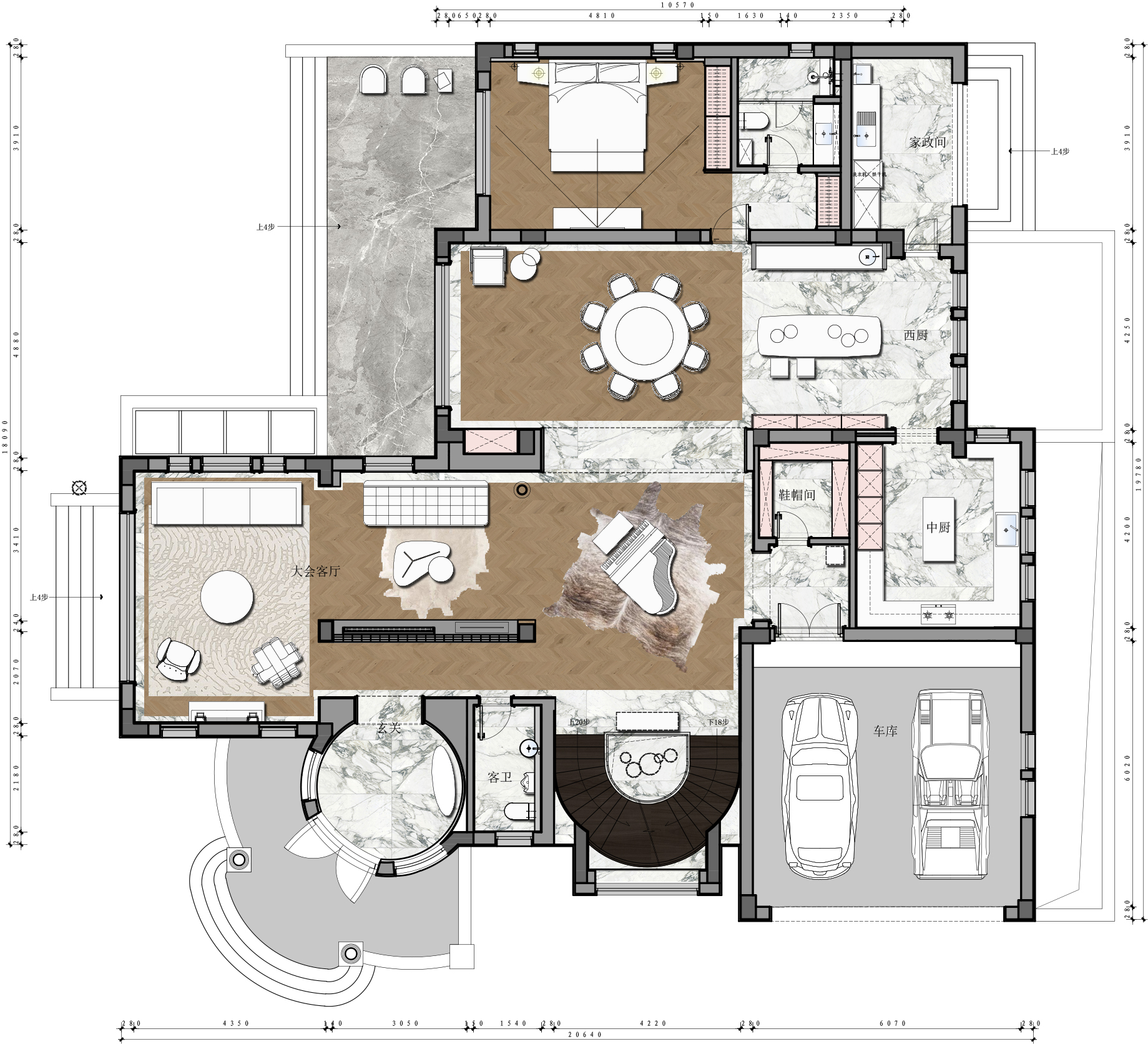 空间布局:空间布局上,该项目充分考虑到生活的多样性与舒适性,采用开放与分隔相结合的设计手法,确保了不同功能区之间的灵活衔接与视觉的贯通。比如客厅的半隔断电视墙不仅划分了动线,同时保持了空间的流动性与通透感;西厨与餐厅之间的弧形天花和大落地窗设计,使自然光与外部景观自然引入室内,既满足了功能需求,也提升了空间的舒适度和生活体验。