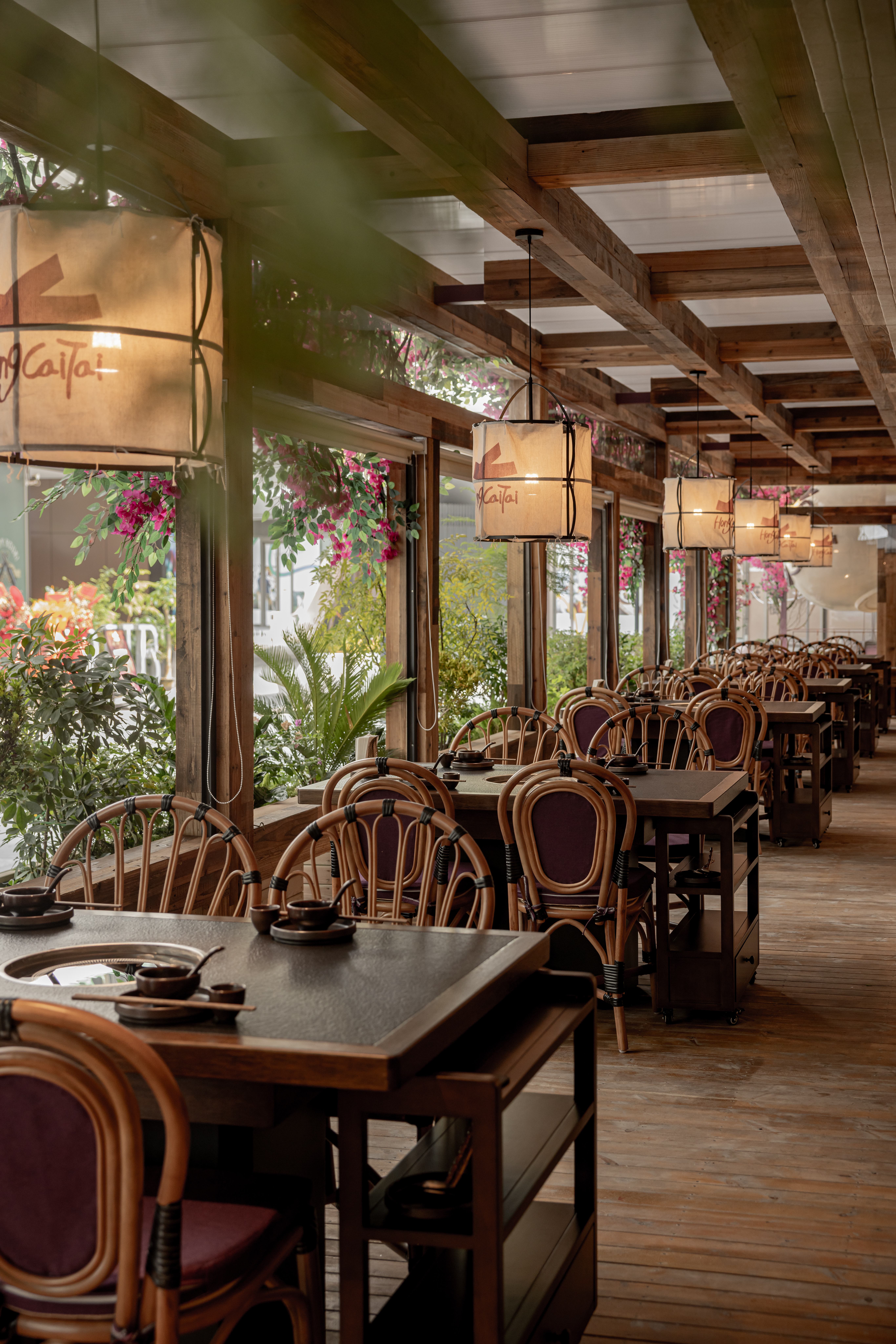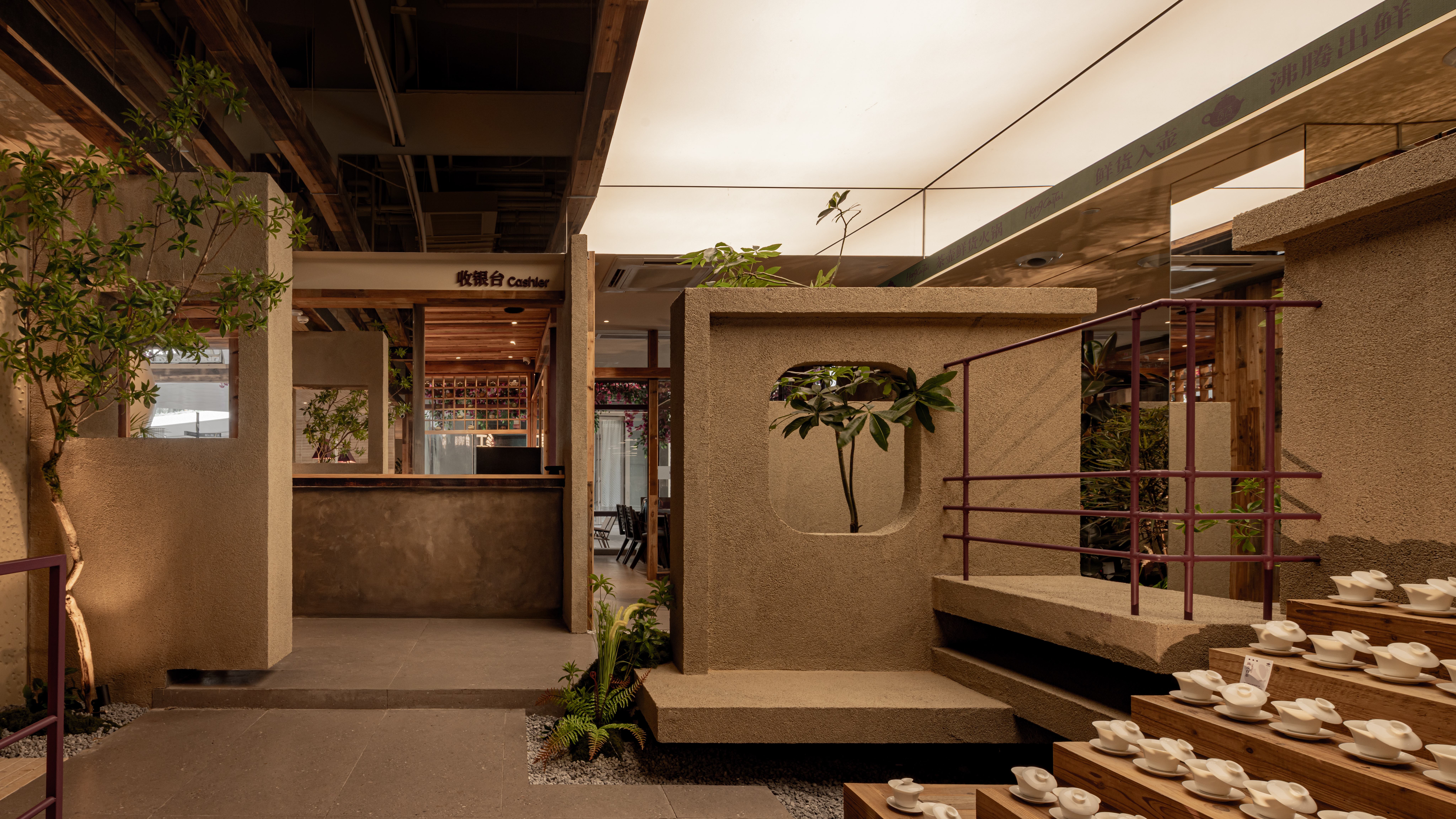 空间布局:绿植从花箱中自然生长,紫色花卉装点着入口,悬空的茶壶装置倾泻诗意