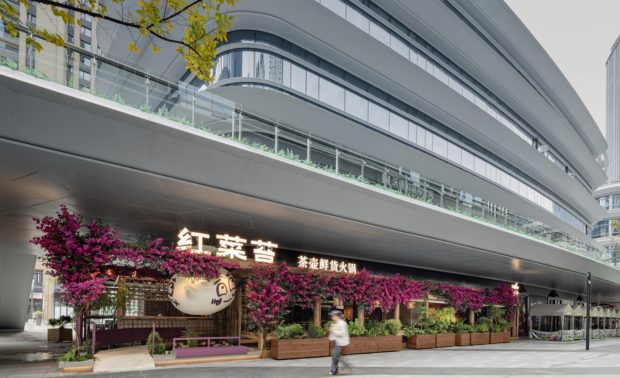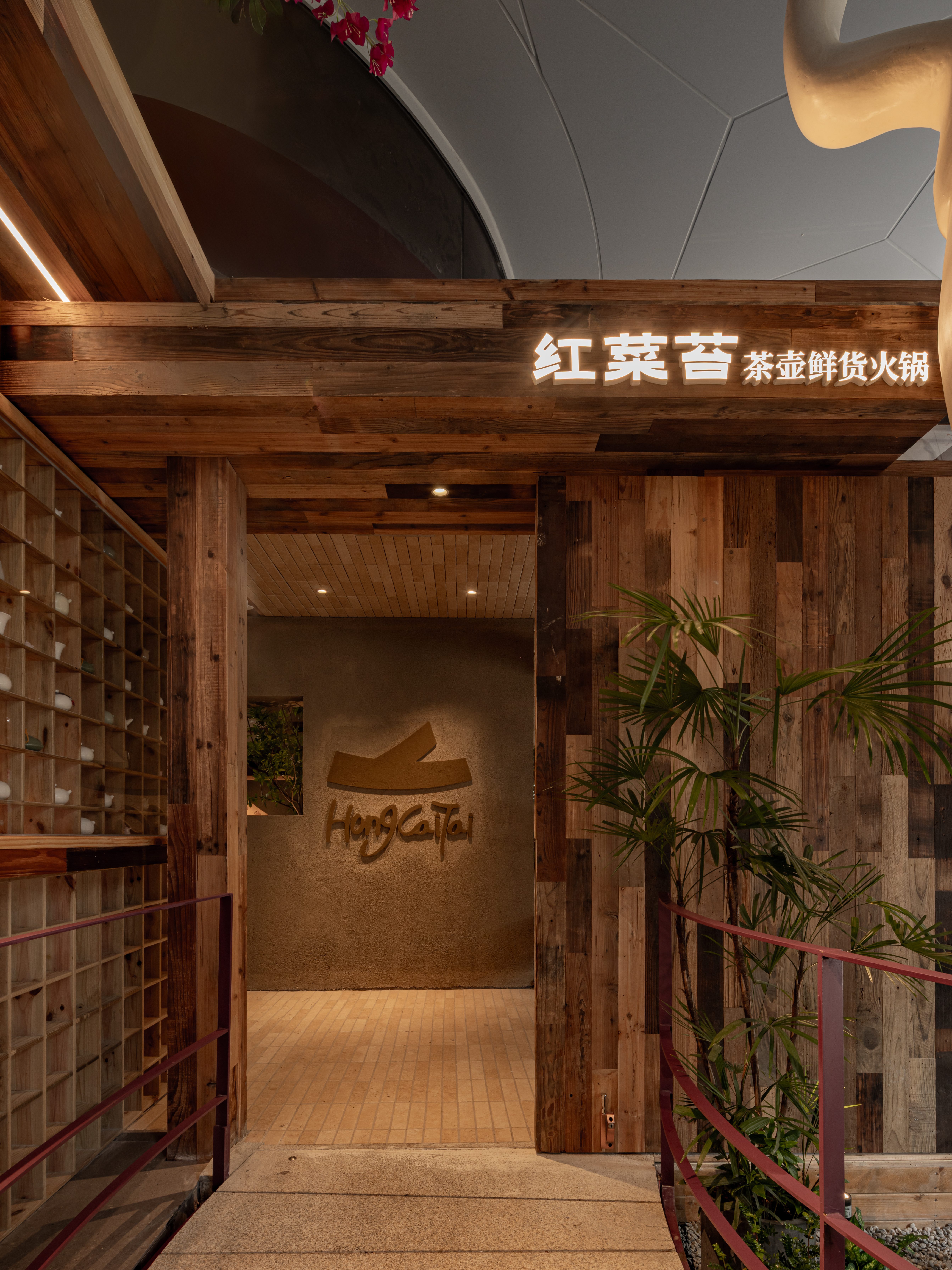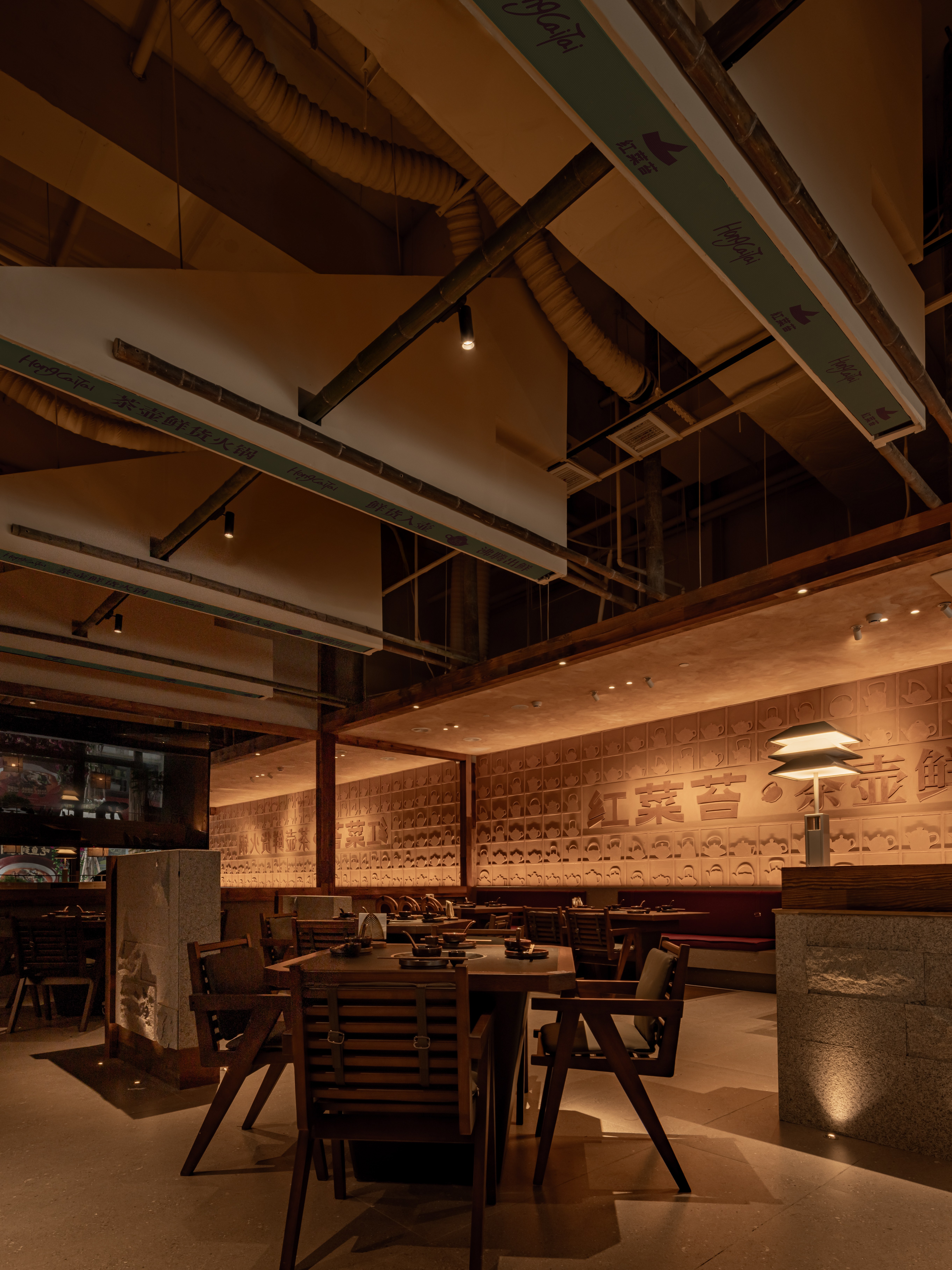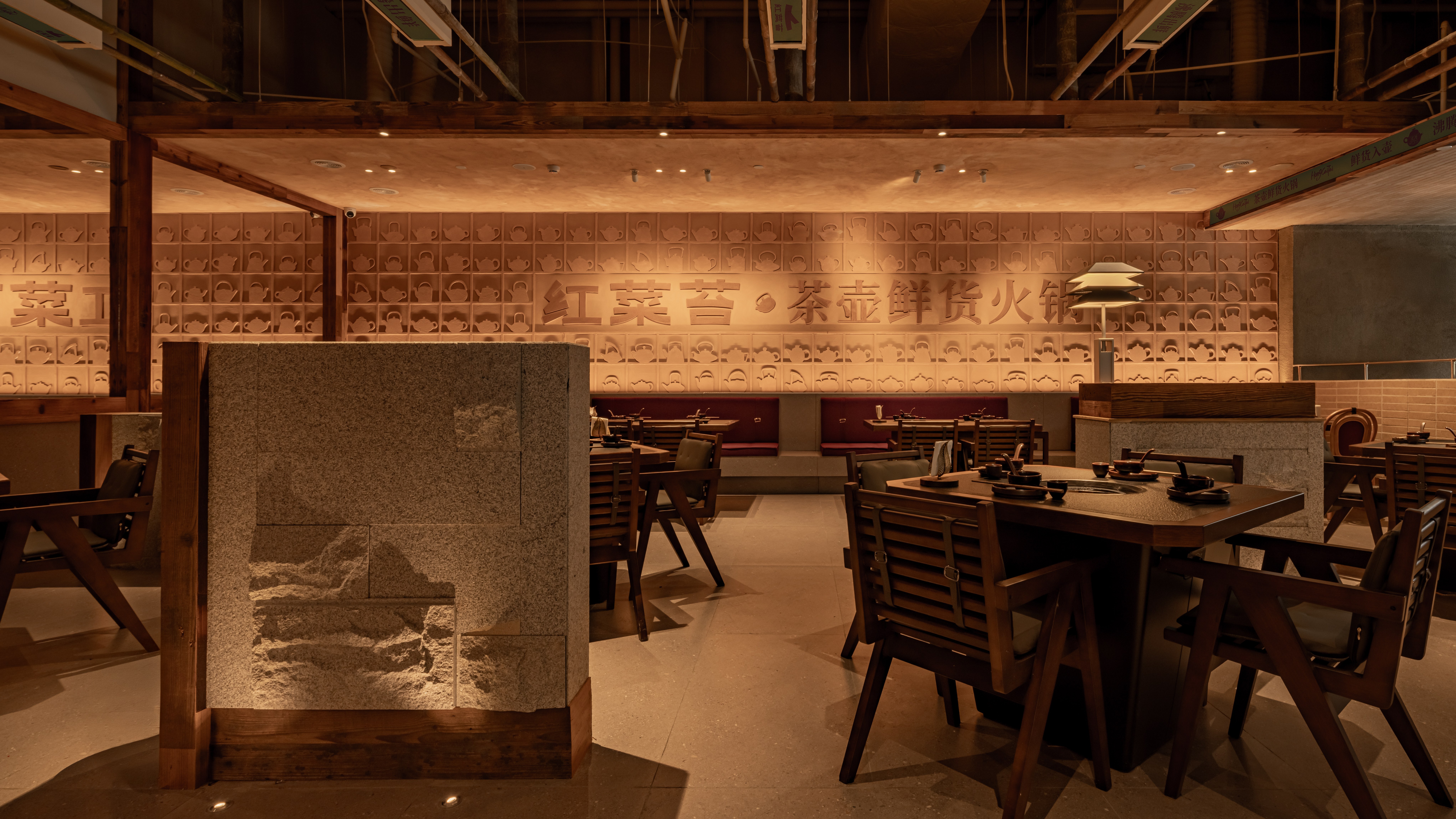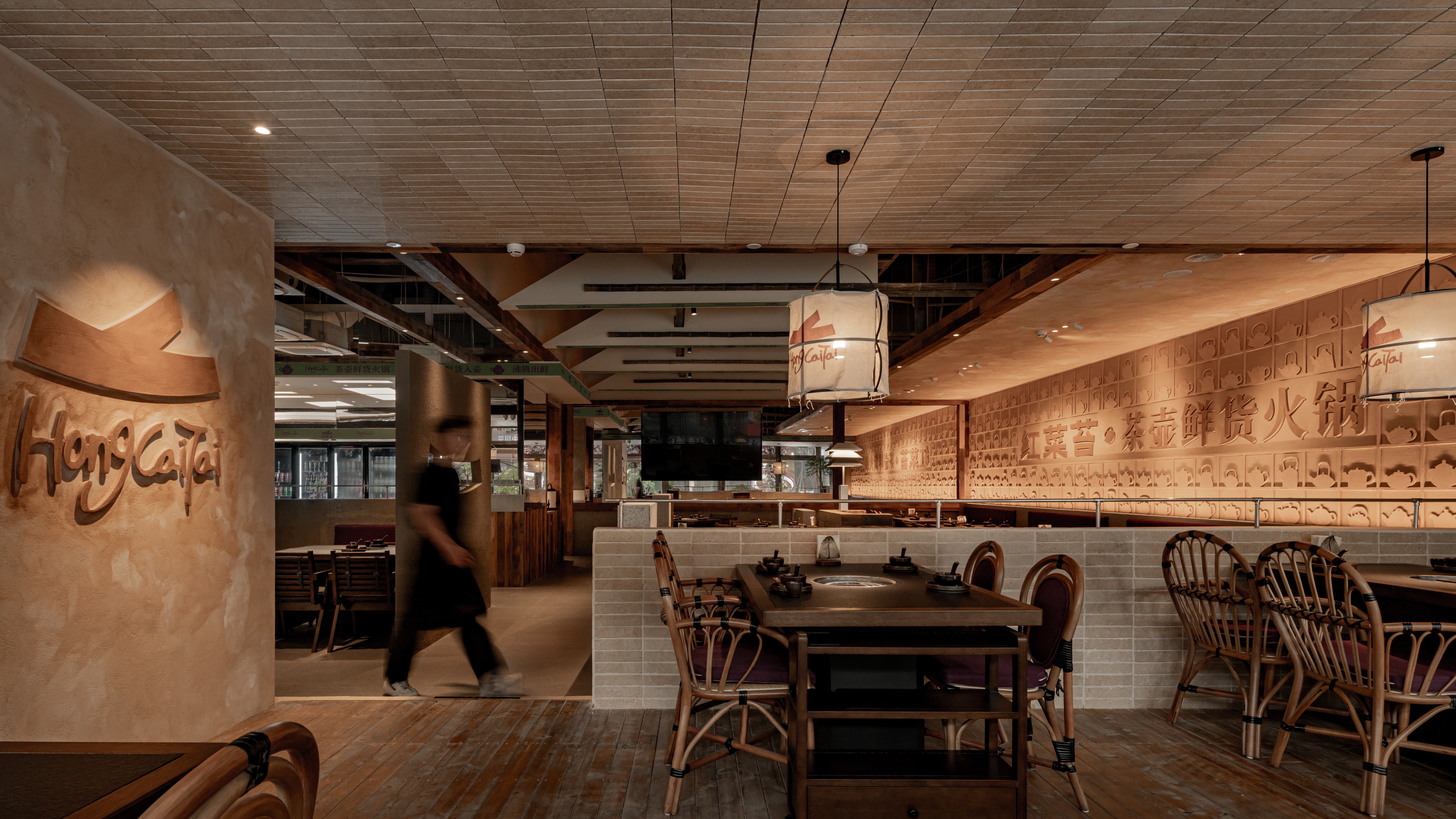 项目定位:在武汉的商业区中心,我们让建筑学会呼吸,用老木板丶艺术涂料丶水洗石丶莱姆石,造一座会生长的火锅空间