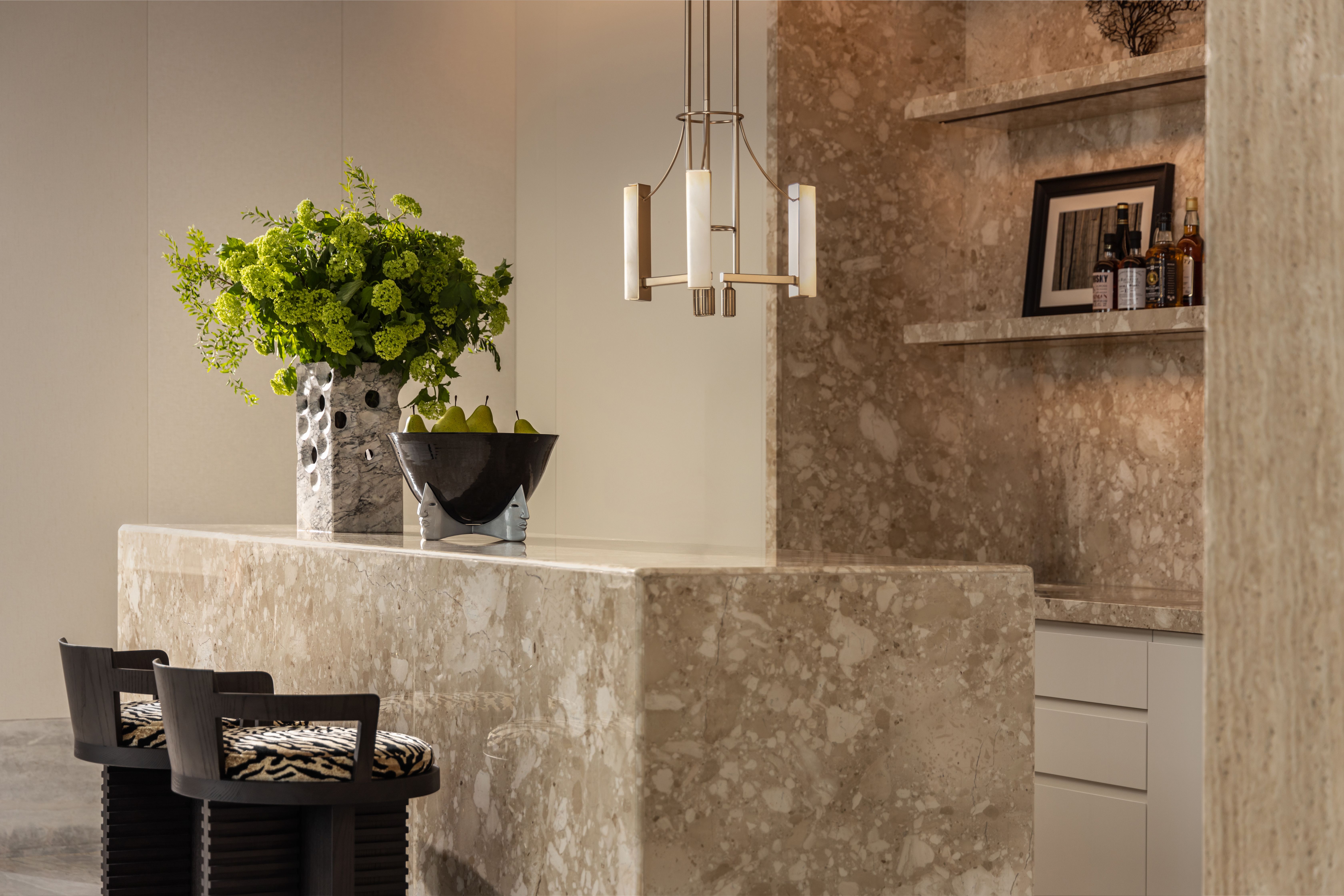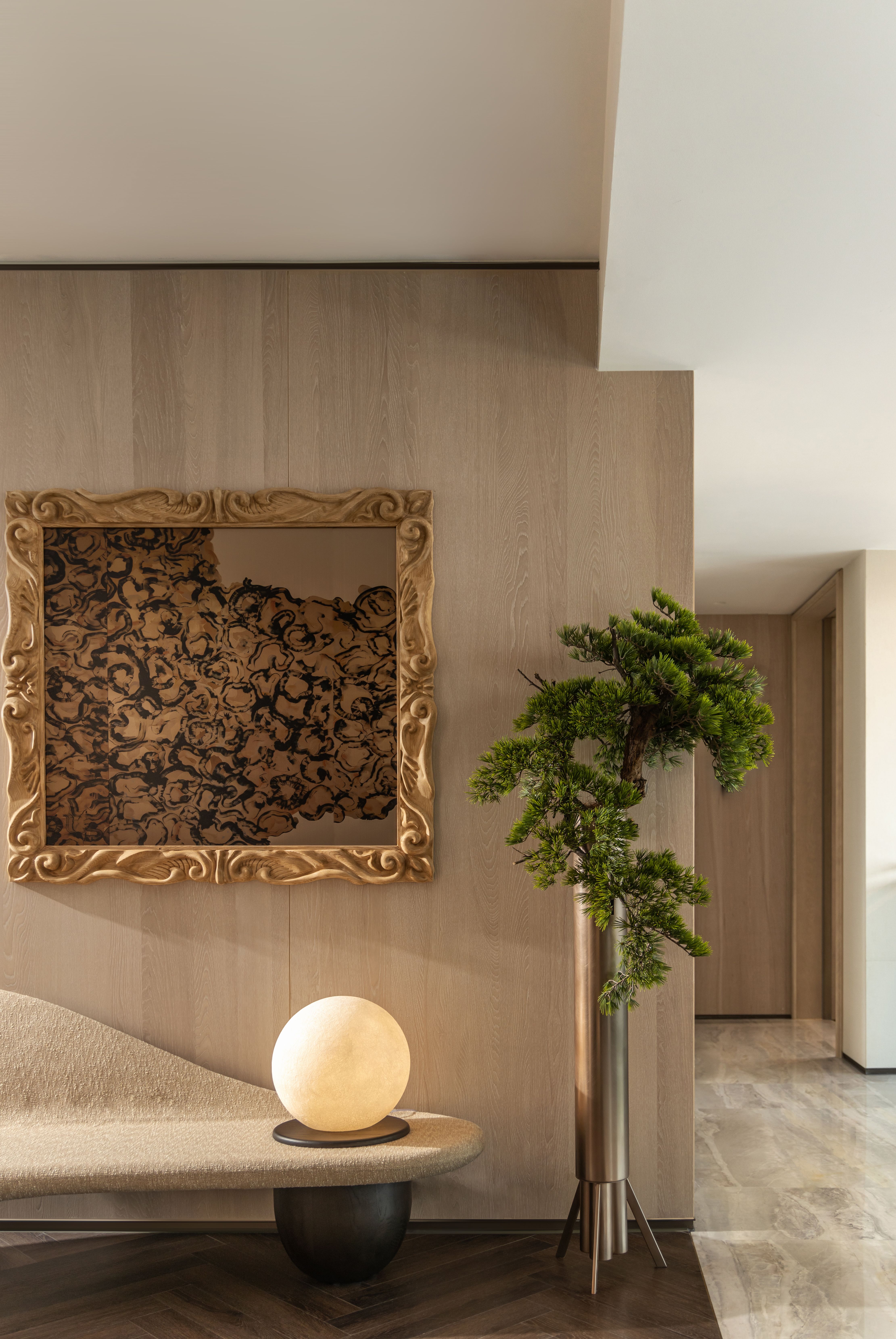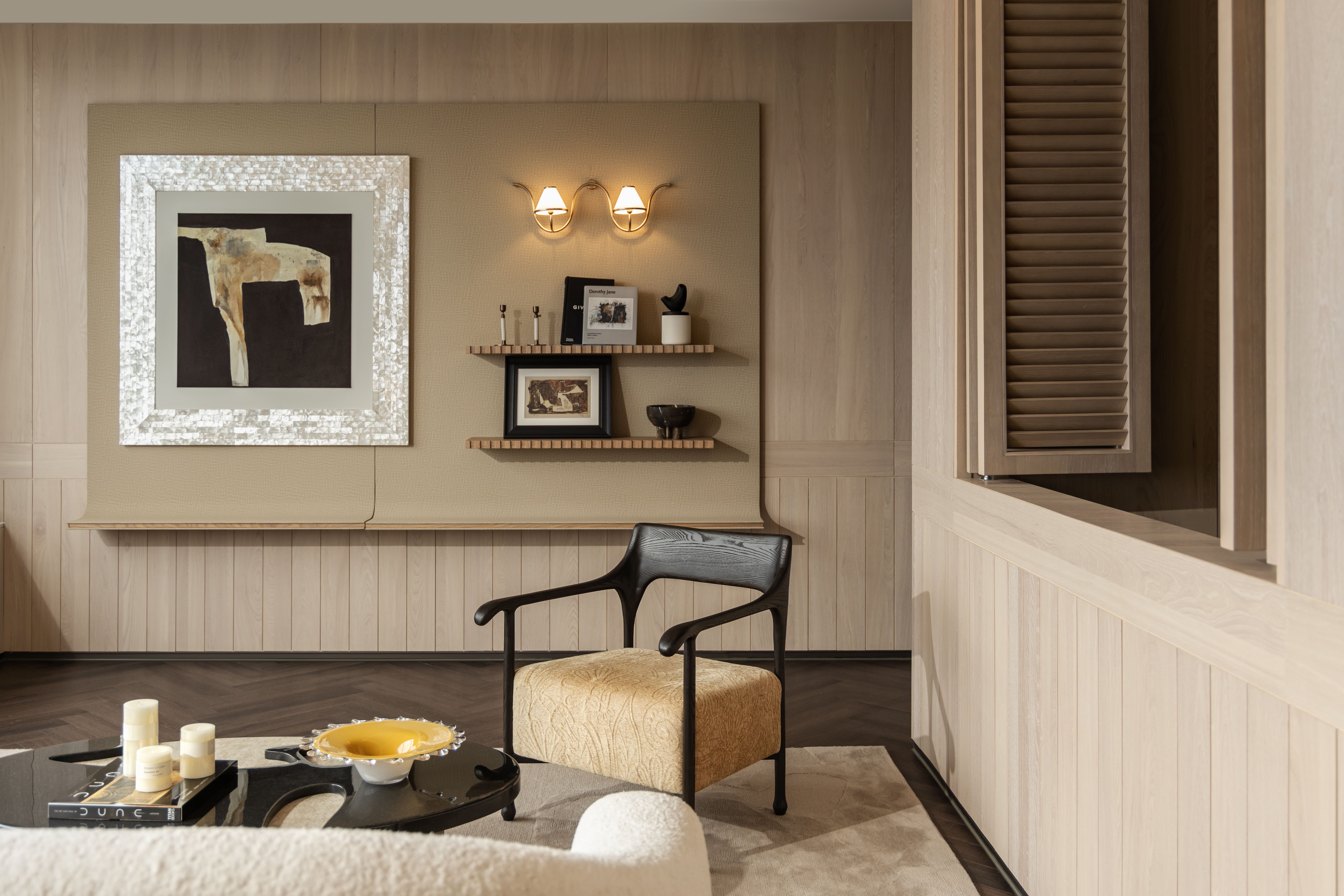 设计选材:选材上注重天然质感、艺术表达与工艺匠心的融合。例如,采用如云絮舒卷的白色奢石构筑视觉重心,形成“重而不沉”的张力。家具选用上,引入了使用传统日本“Shou-Sugi-Ban”火烧技术处理的实心橡木,突出木材纹理。书房则通过墨绿色复古砖铺拼层架,随光线产生如湖面波纹的流动感,让材质本身成为自然意境的延伸。