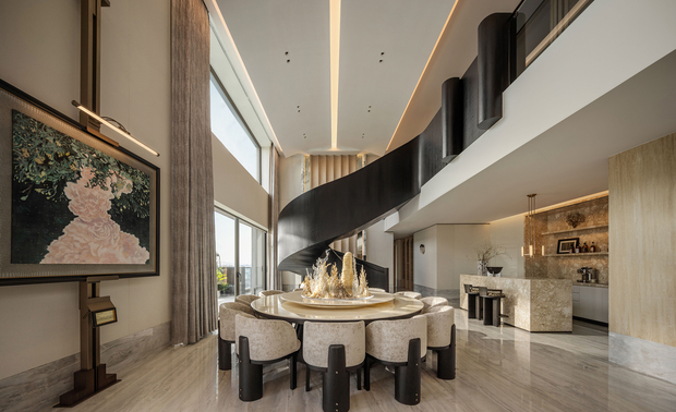 用户体验:项目投入使用后,成功将日常起居升华为持续性的艺术与情感体验。用户仿佛同时扮演着“策展人”与“画中人”的双重角色——在旋转楼梯上行走会触发如破晓晨光般的智能灯光仪式;在餐厅,家宴可演变为东西方美学的共生剧场;在闺蜜茶画室,私语与茶烟交织成即兴的诗意。整个空间成为联结人际关系的温柔媒介,实现了功能、情感与美学的平衡。